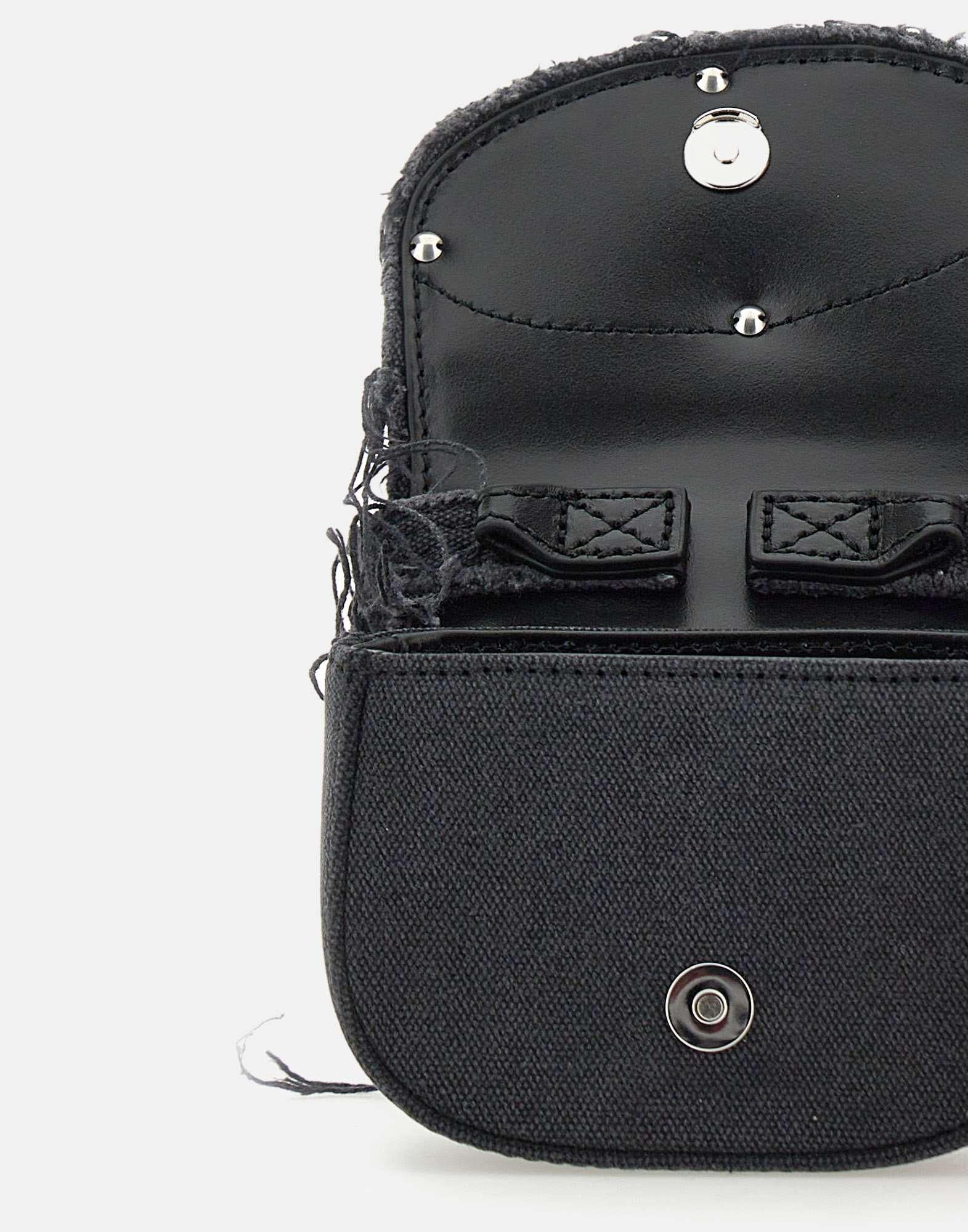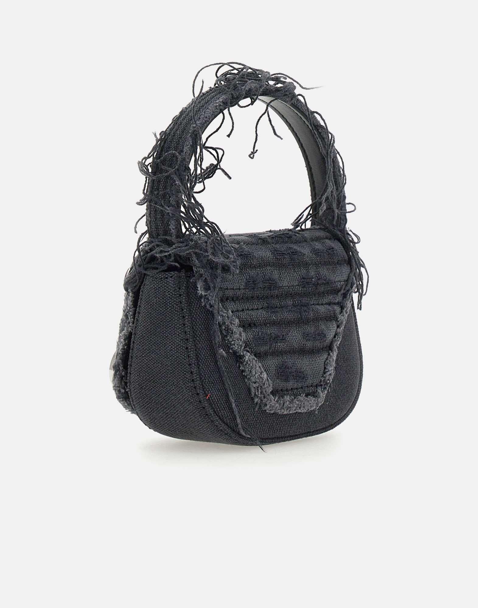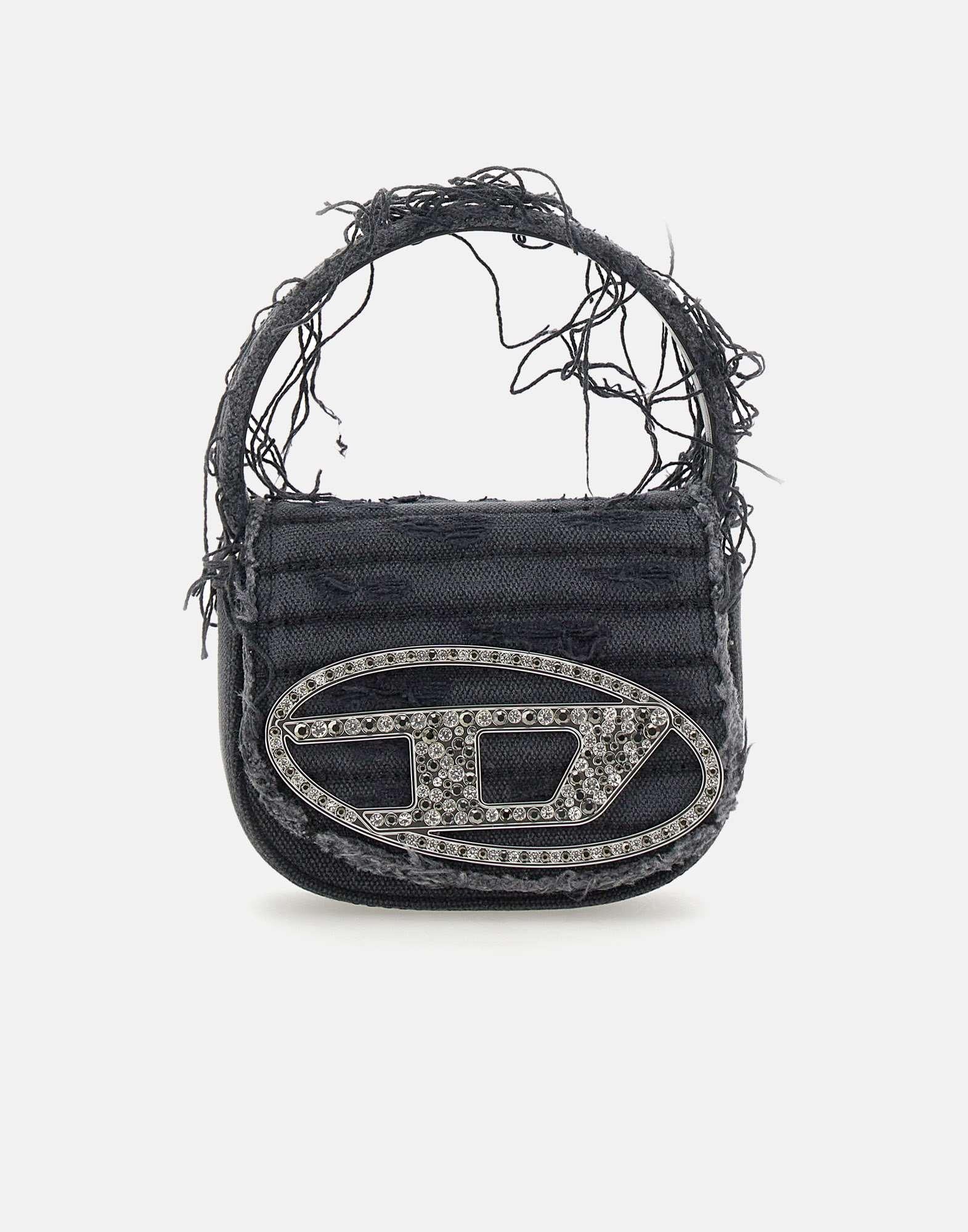 "1dr xs" Diesel mini bag, black, compact version of the iconic 1DR it-bag, in destroyed canvas, quilted with Oval D decoration, crystal-covered logo plaque on the flap, frayed edges and leather details, adjustable and removable shoulder strap approx. 90cm, can be worn over the shoulder or hand-held, measures height 9cm, length 11cm, depth 5cm.