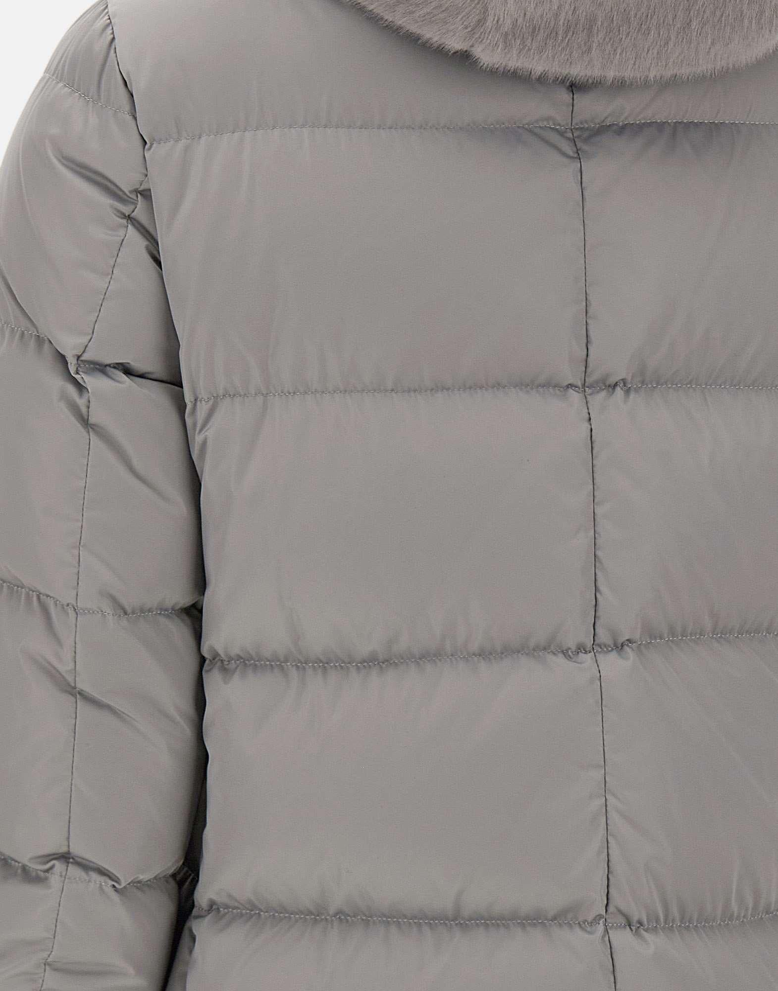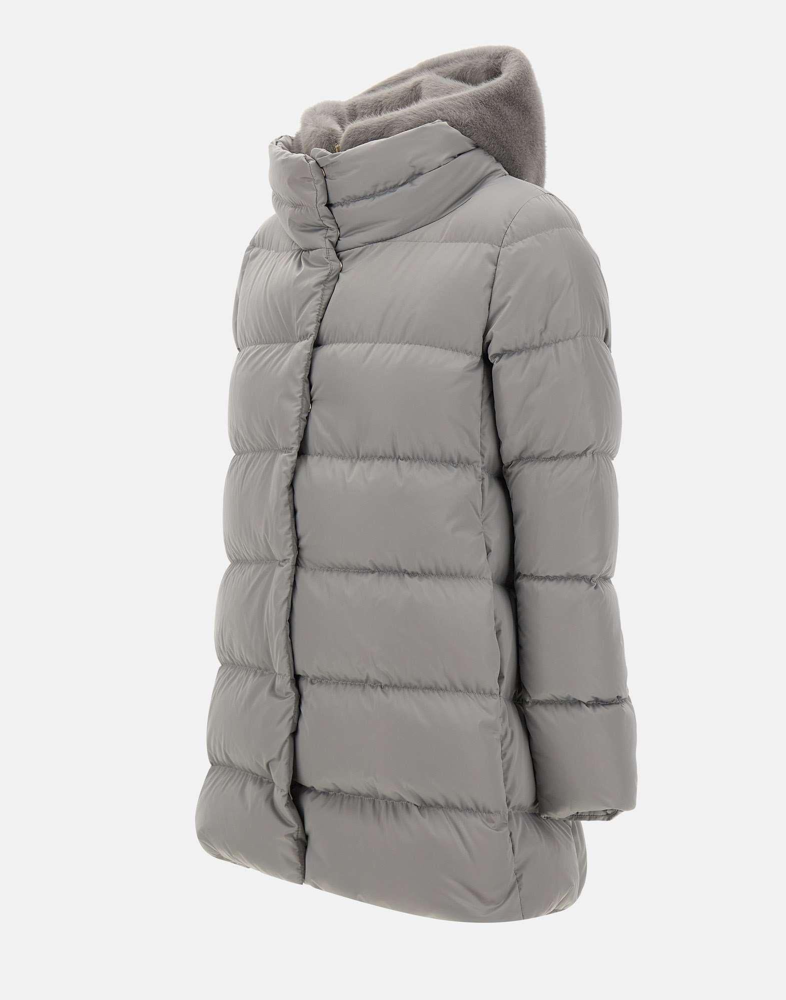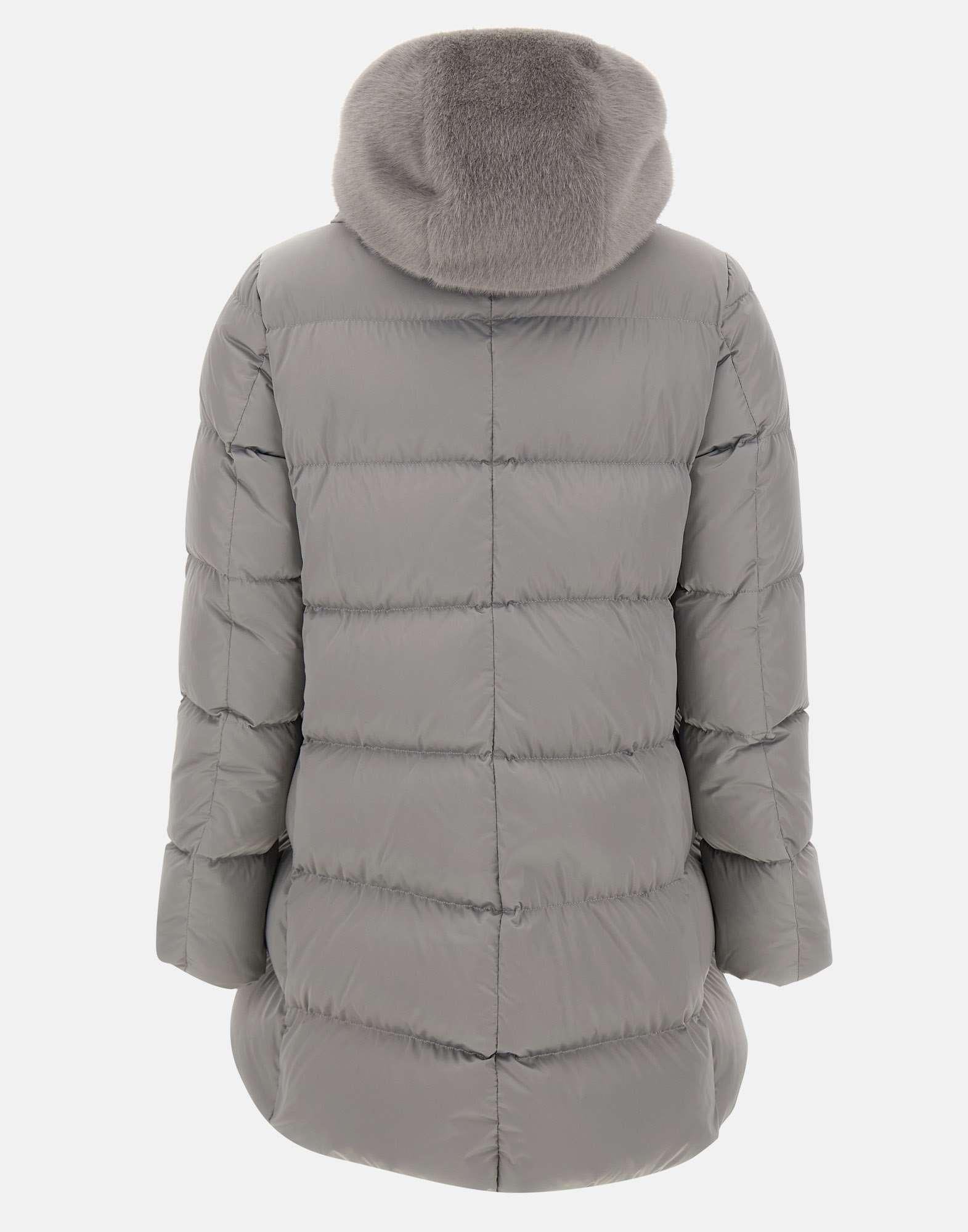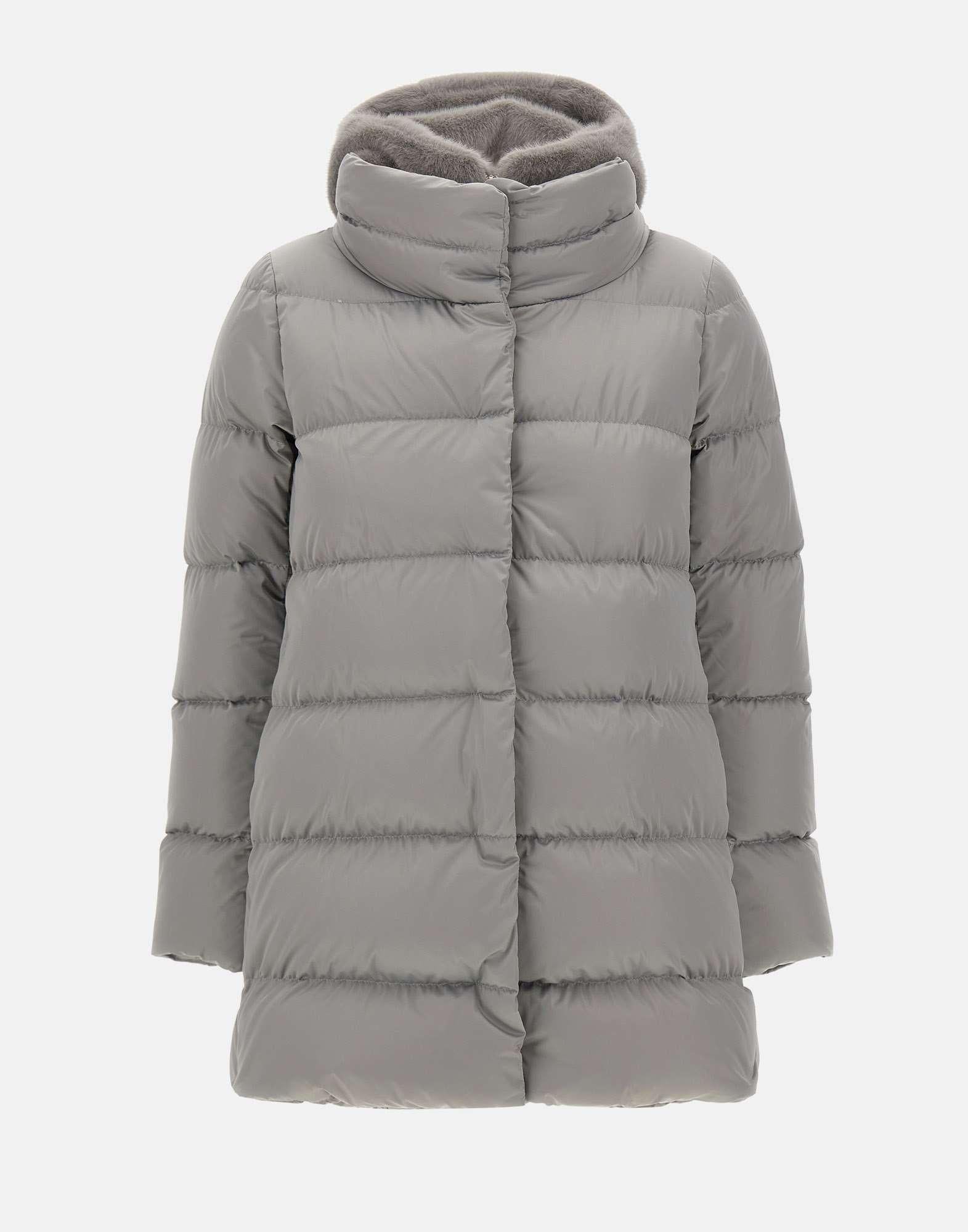 Herno "A-Shape" pearl gray down jacket, crafted from high-density satin with a glossy, soft-touch texture. Featuring a removable hooded bib trimmed with faux fur for a sophisticated yet cozy look. It features horizontal quilting, a concealed zip and snap button closure, and side welt pockets. Goose down padding for optimal thermal comfort. Regular fit.