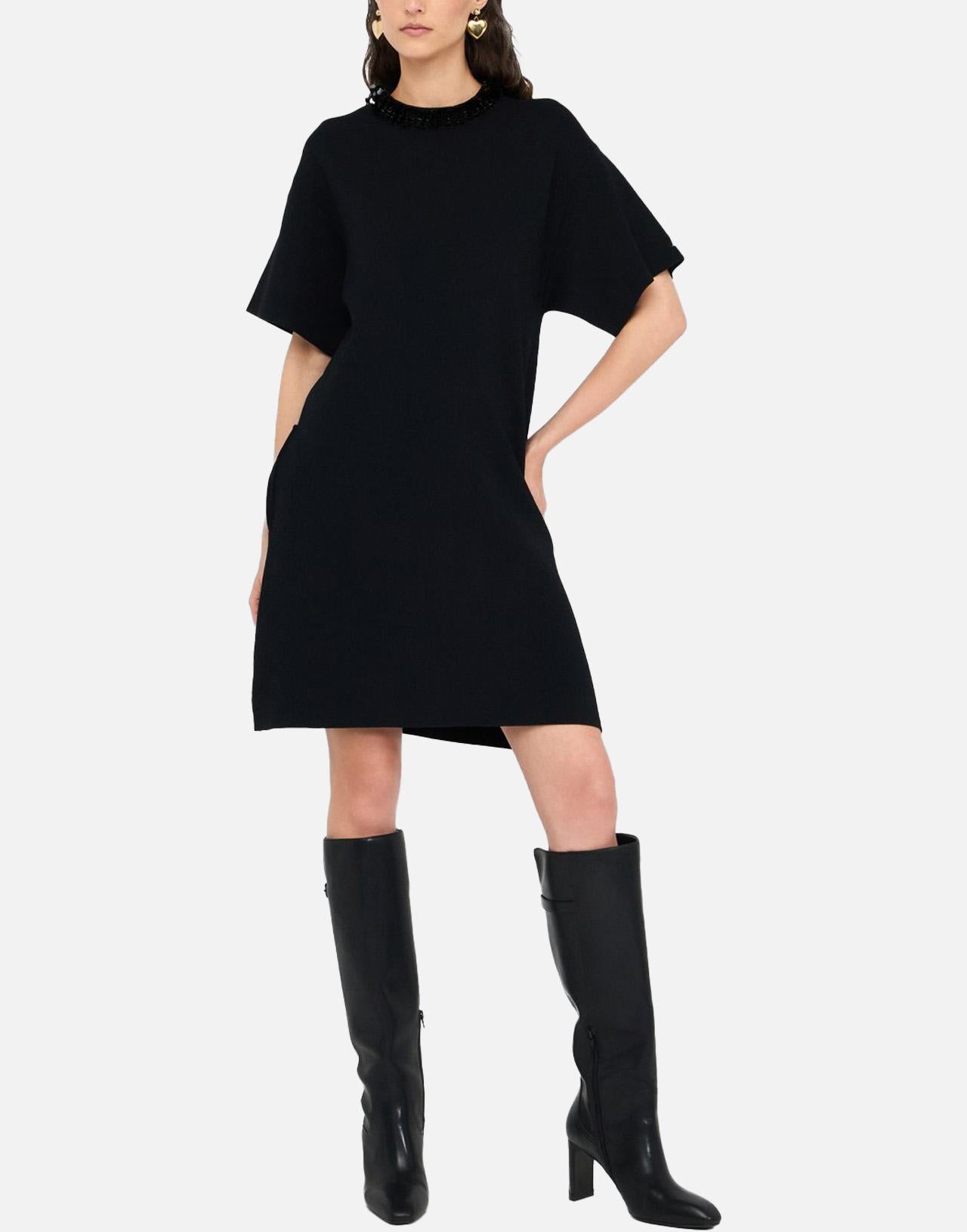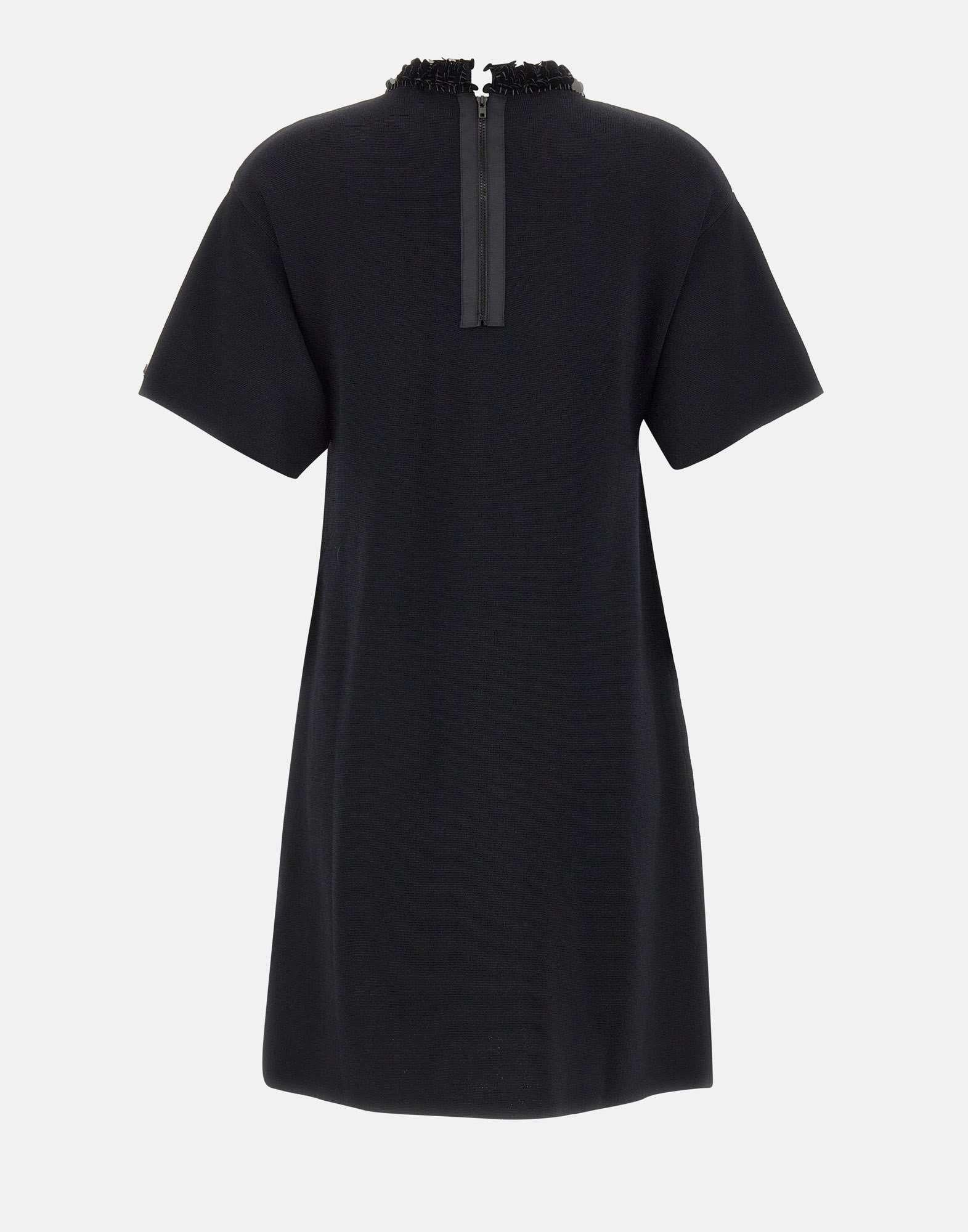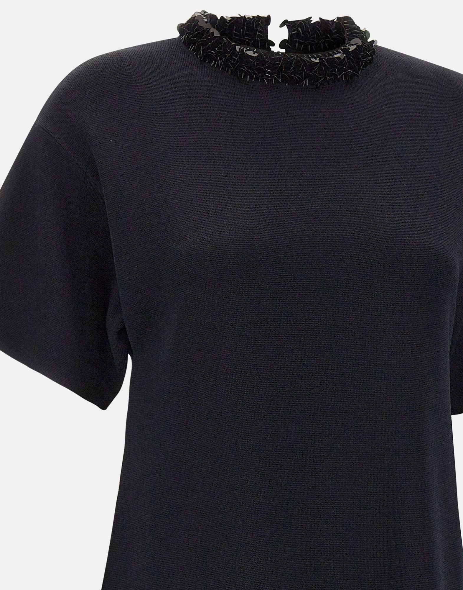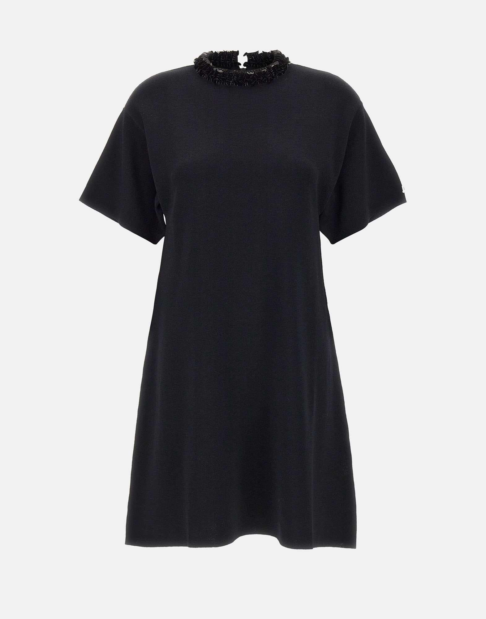 Women's Liu-Jo midi dress in black viscose-blend knit, combining elegance and subtle sparkle. Features a crew neckline embellished with sequins, short sleeves, and a back zip closure for a clean, feminine silhouette. Part of "Liu Jo Better" sustainable line, it offers a regular fit that ensures both comfort and sophistication for any occasion.