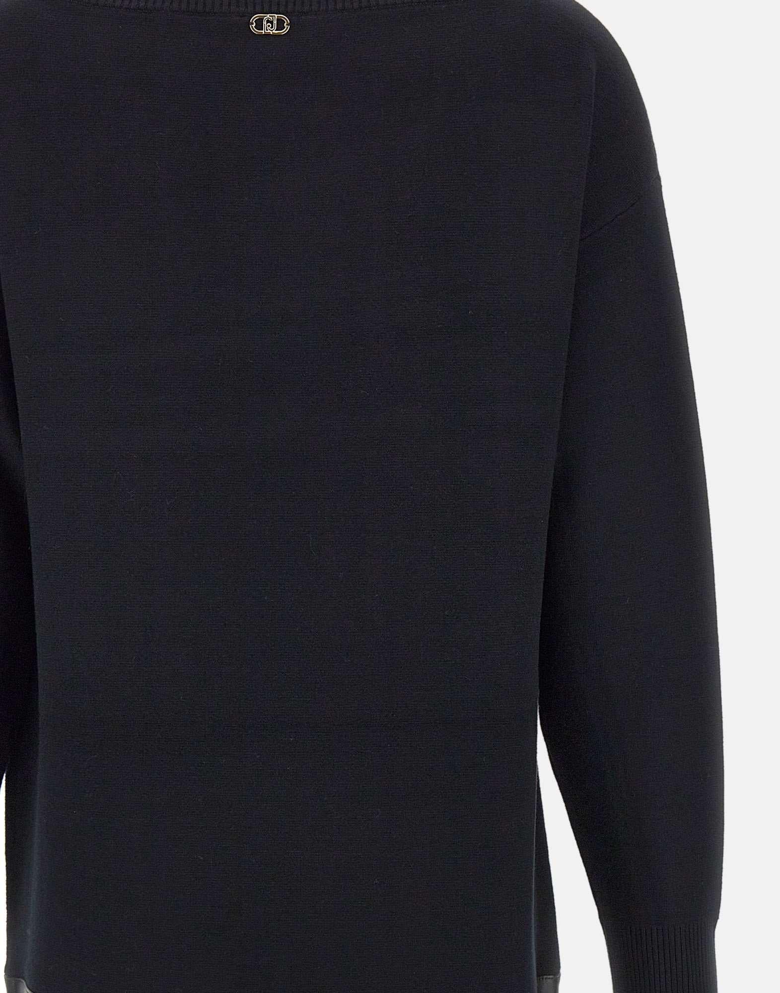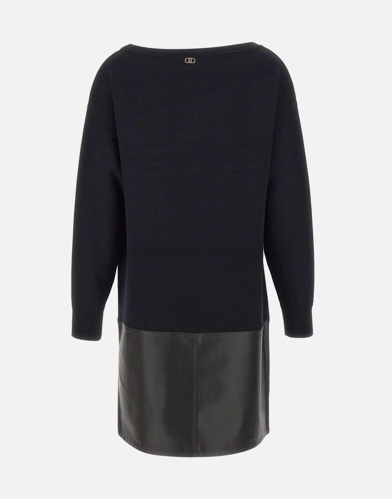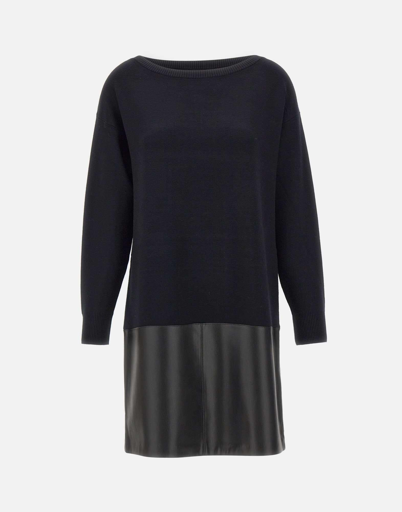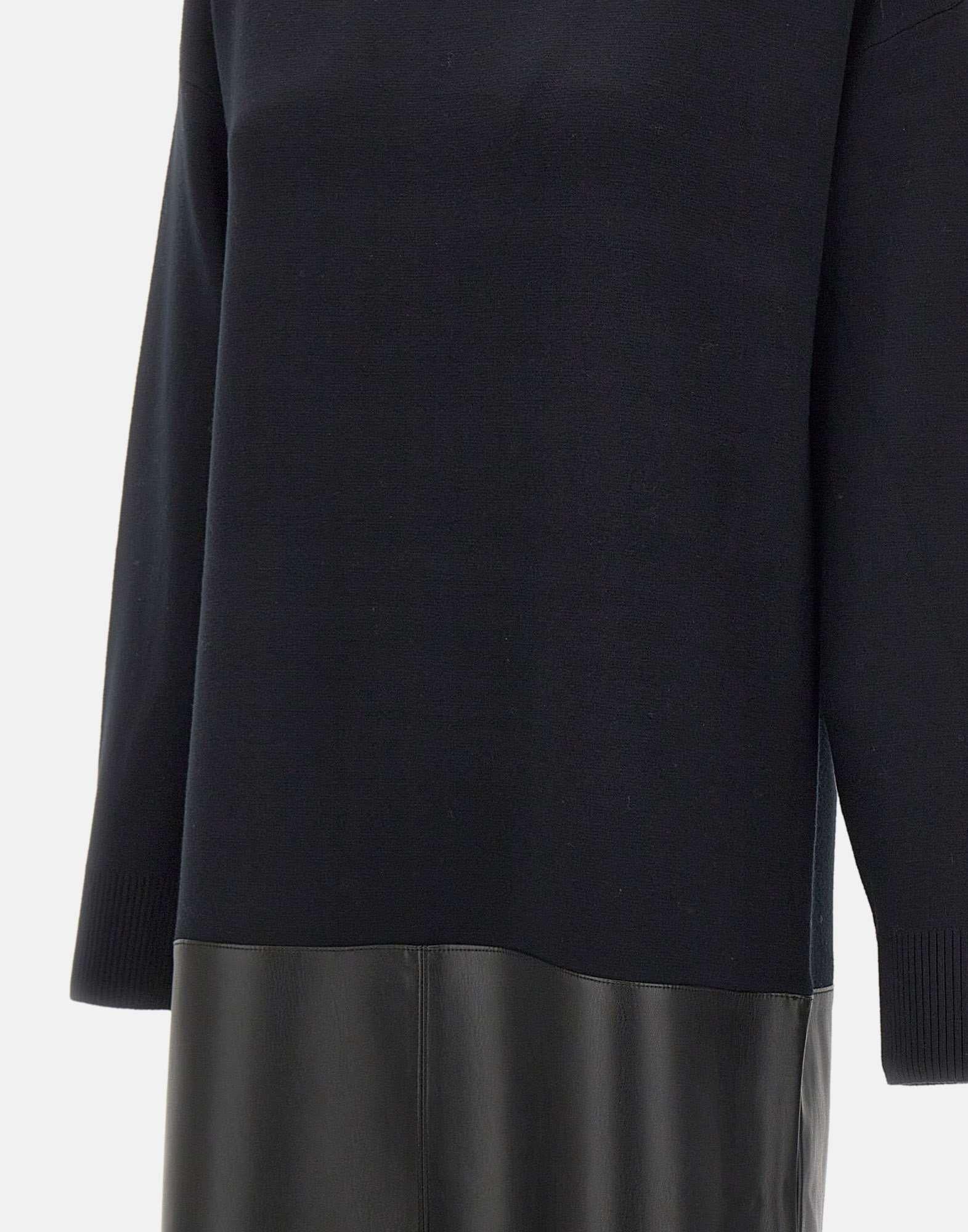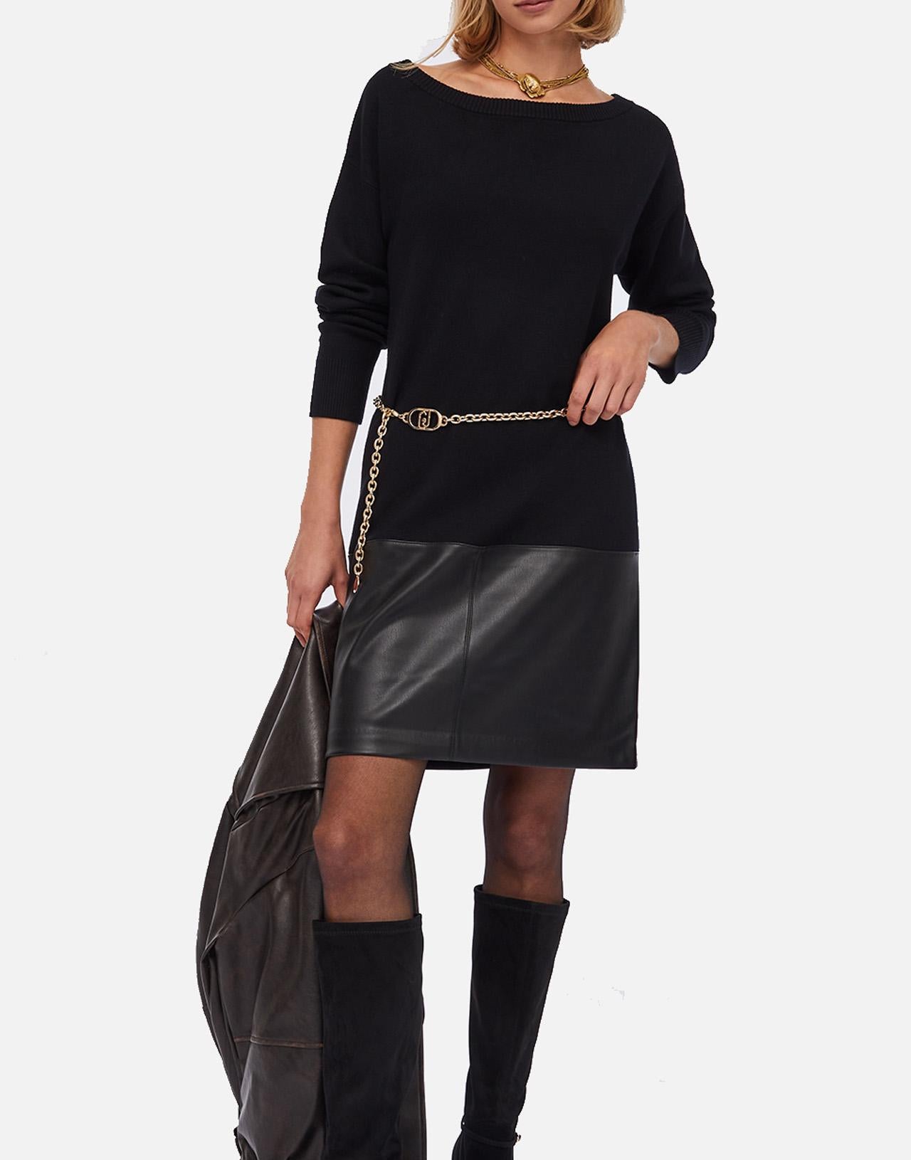 Liu-Jo women's black knit dress made of a viscose blend. It features a boat neckline, long sleeves, and dropped shoulders for a soft, contemporary fit. The coated fabric insert at hem adds a modern, bright detail. The above-the-knee length, logo detail on back, and relaxed fit for a casual-chic look with sophisticated appeal.