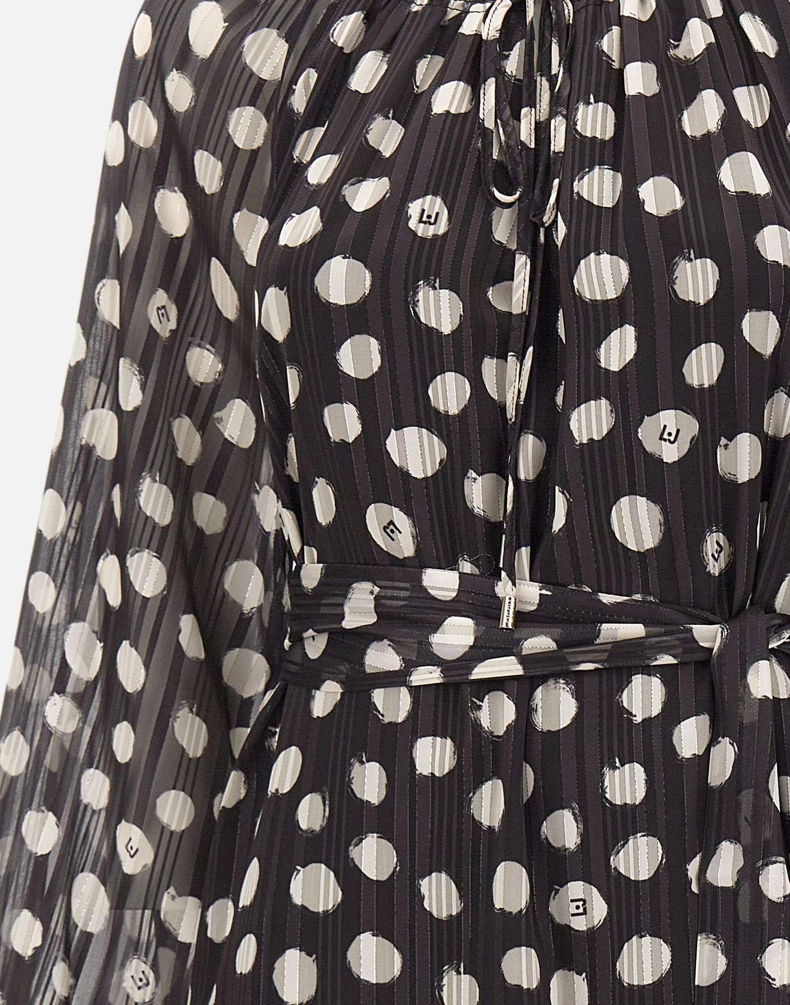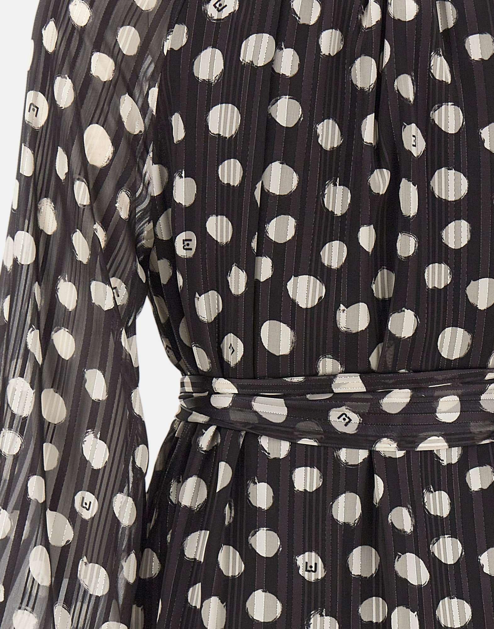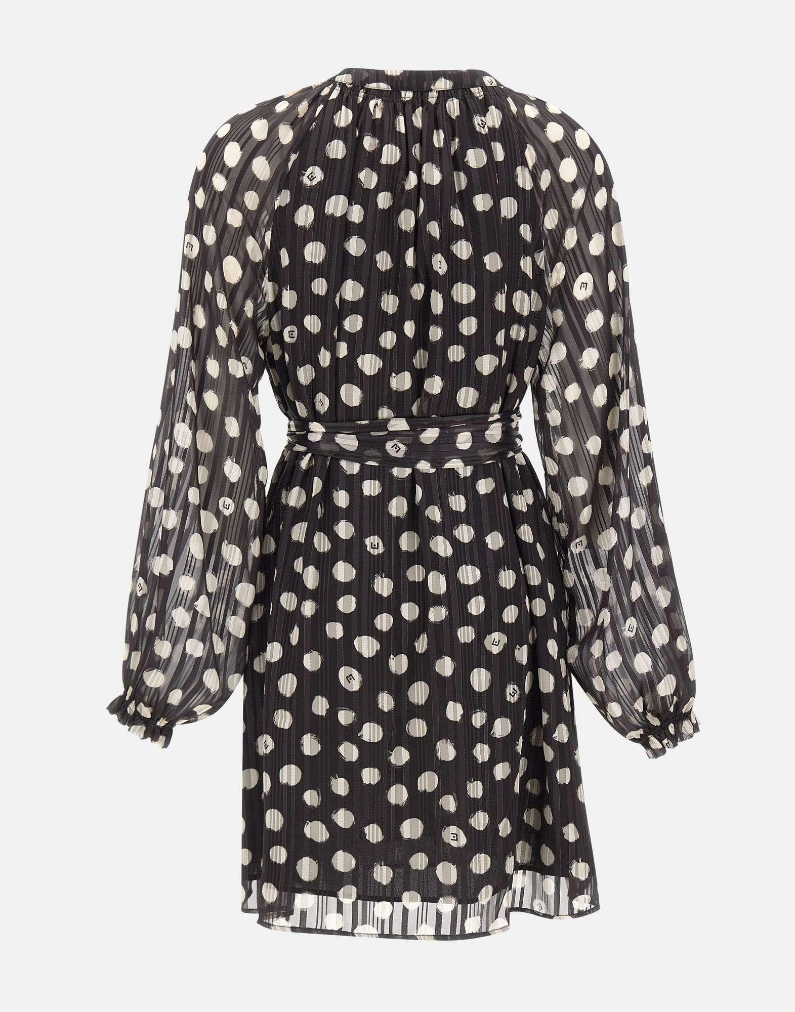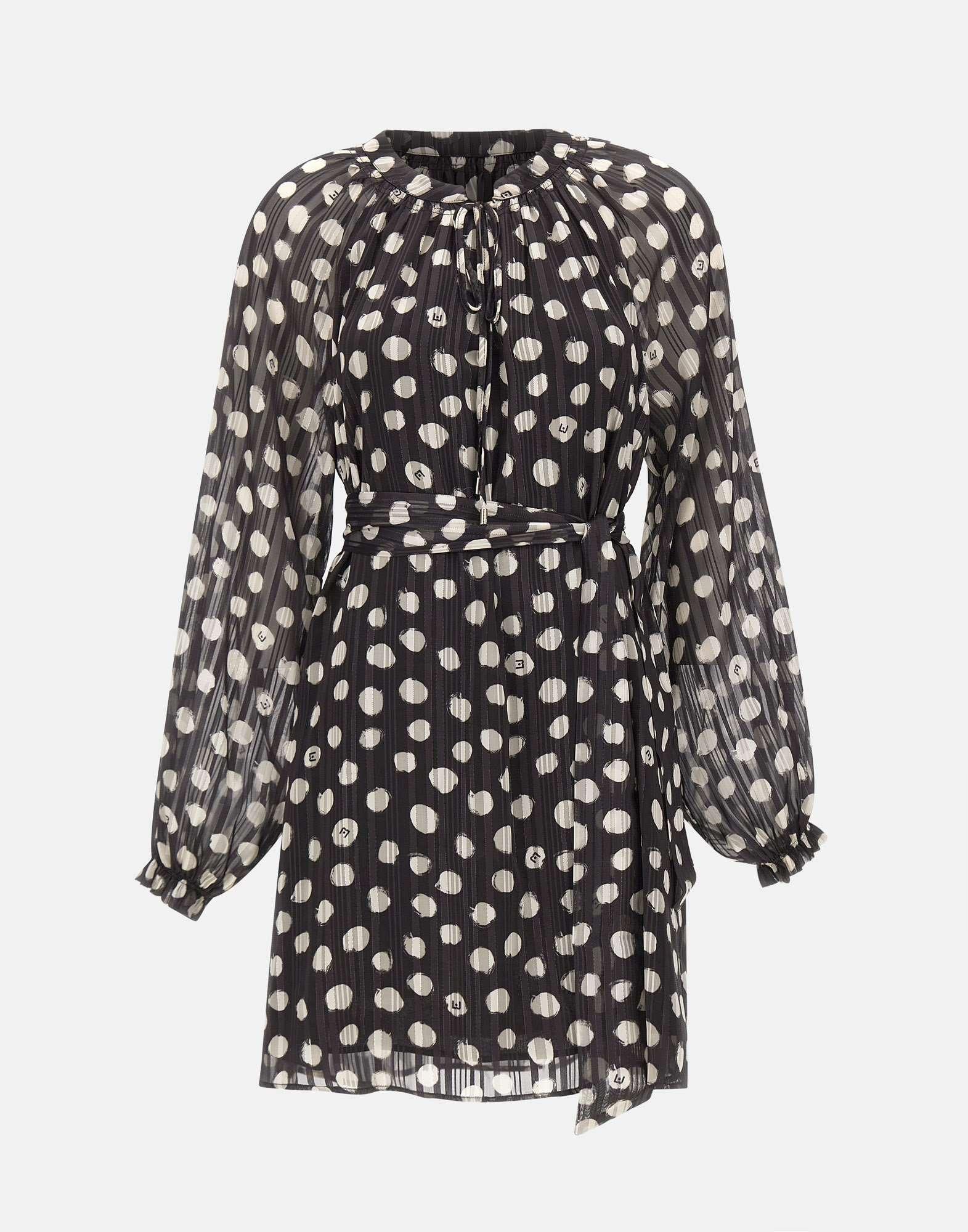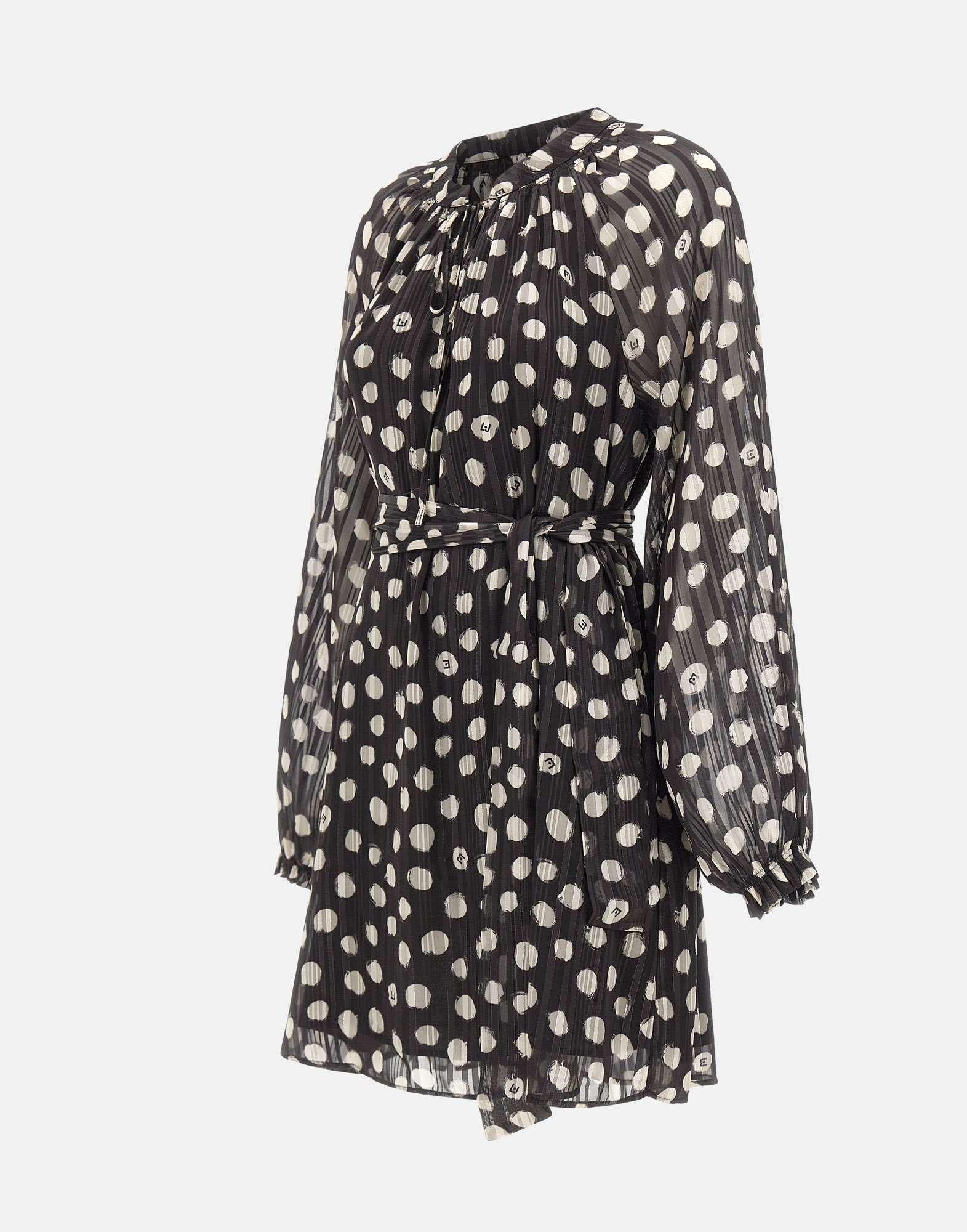 Liu-Jo women’s dress crafted from lightweight fabric with a black and white polka dot print. Features a round neckline with tie closure, waist belt to enhance the shape, and long sleeves with elasticated cuffs. The mid-length design and regular fit offer effortless elegance for both everyday and evening looks.
