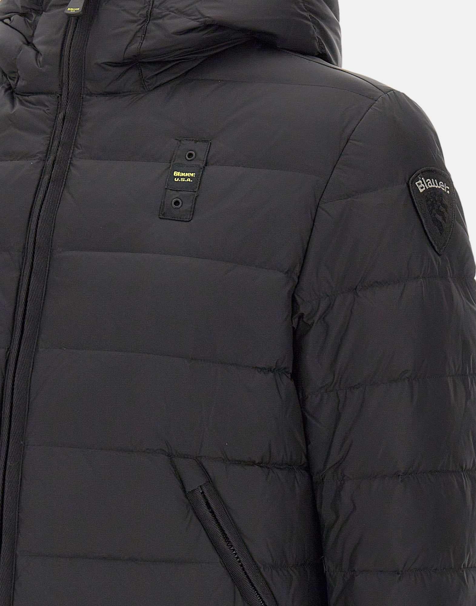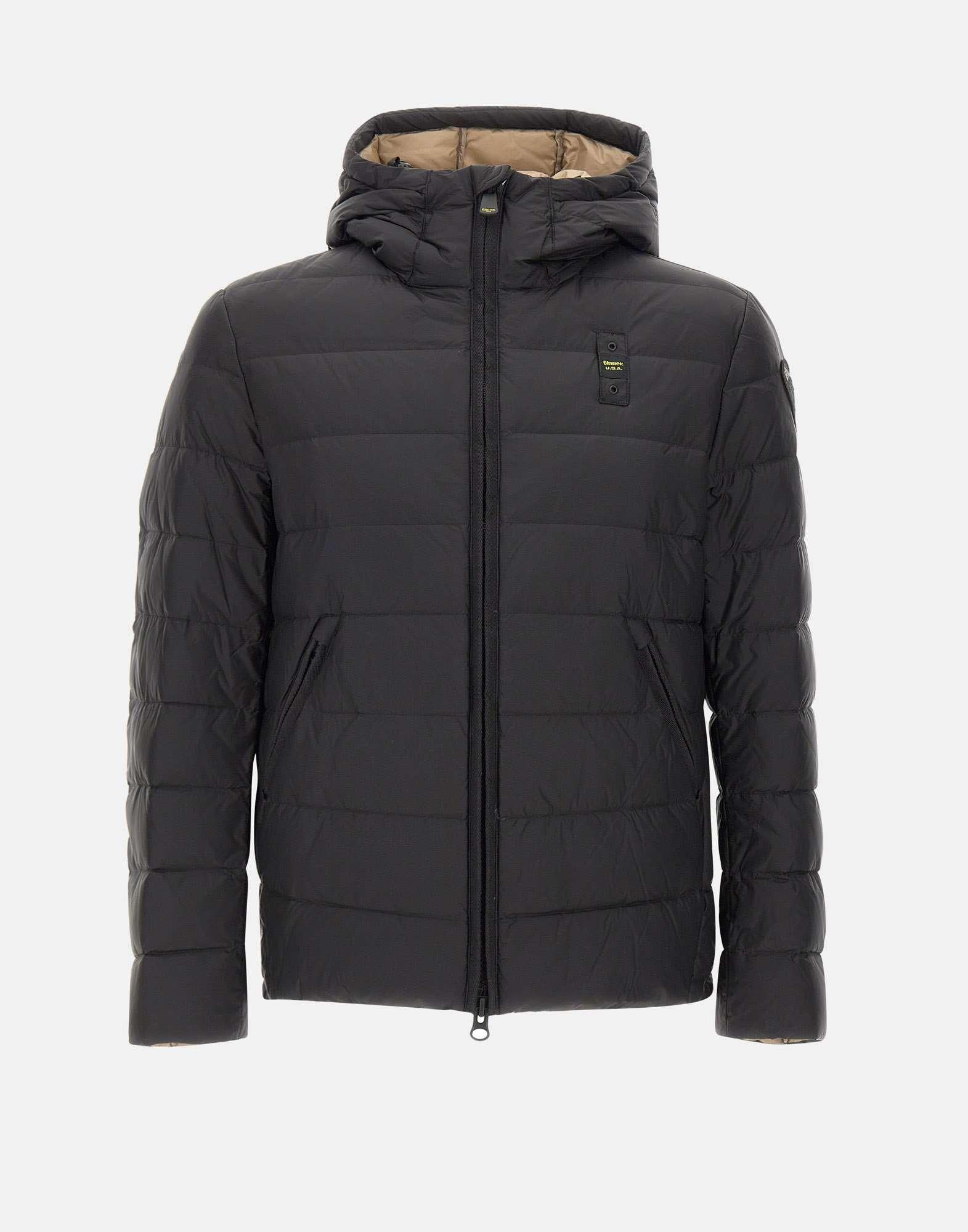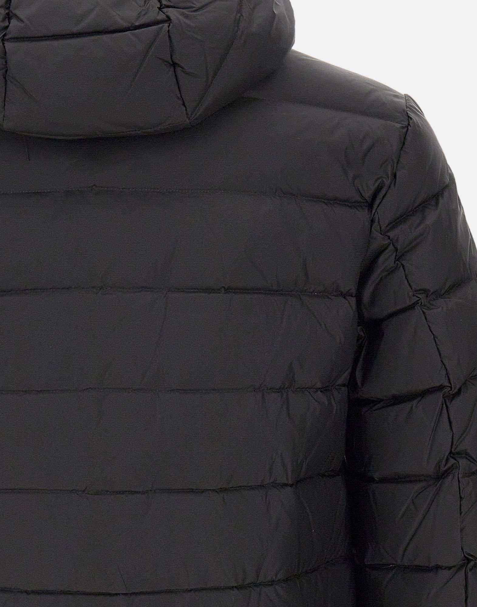 The black "Acton" down jacket stands out for its horizontal striped quilting and 230g 90/10 natural down padding, which provides warmth without bulk. The design includes a fixed drawstring hood covered in shiny water-repellent fabric with a contrasting lining, a two-way zip closure, front zip pockets, and an adjustable drawstring hem. Inside, a utility pocket with Velcro and zip offers additional functionality. Finished with a patch and logo loop, it's a regular fit that combines practicality with contemporary urban style.