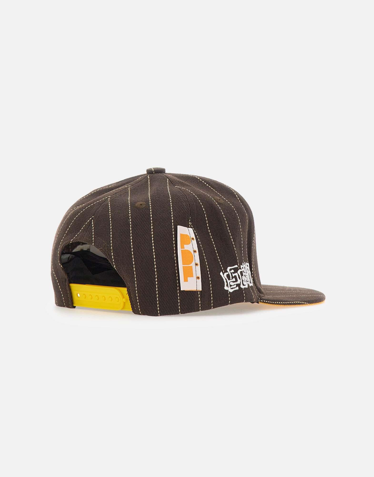 PDF “Baseball Hat Leggenda”, crafted from a wool blend with a panelled design and striped pattern in chocolate and yellow tones. Features an adjustable back strap and embroidered logos that highlight brand’s signature aesthetic. A versatile accessory with a modern attitude, perfect to complete both streetwear and casual looks. One size.