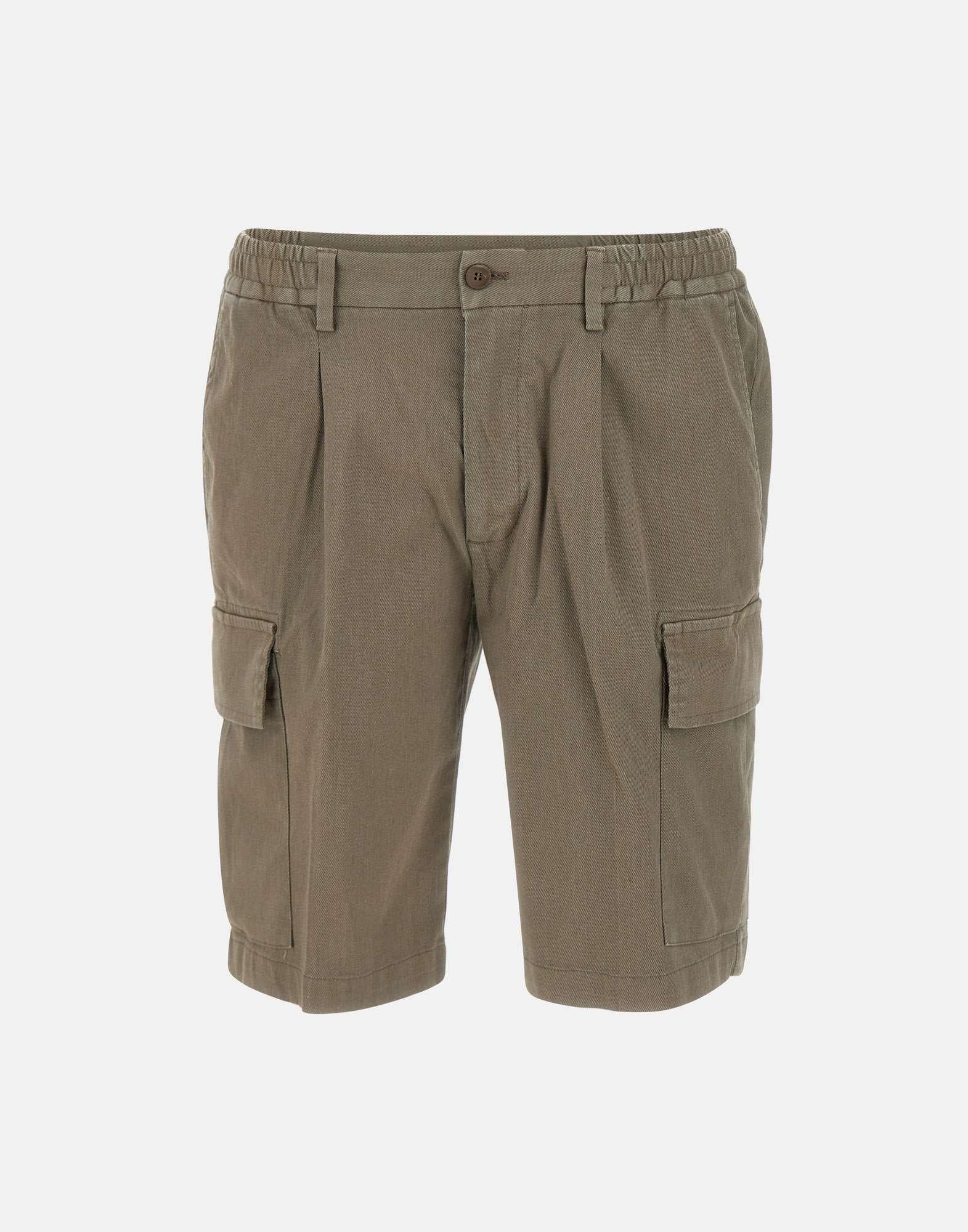 Men's Bermuda "D131 Fit Ischia" shorts Devorè Incipit, hazelnut, cargo model, stretch cotton blend with denim effect, zip and button fastening, partially elasticated waist with belt loops, flush side pockets, cargo pockets on legs, back pockets, regular fit, made in Italy