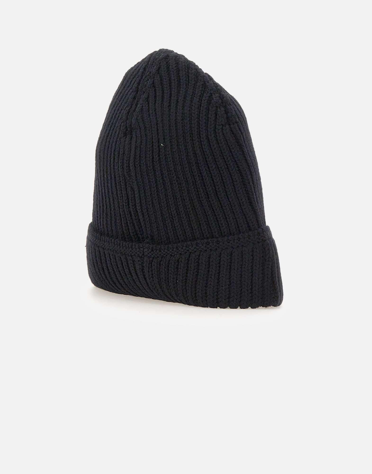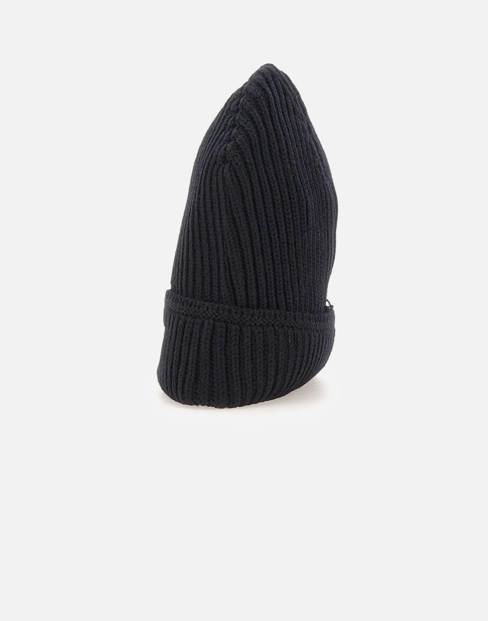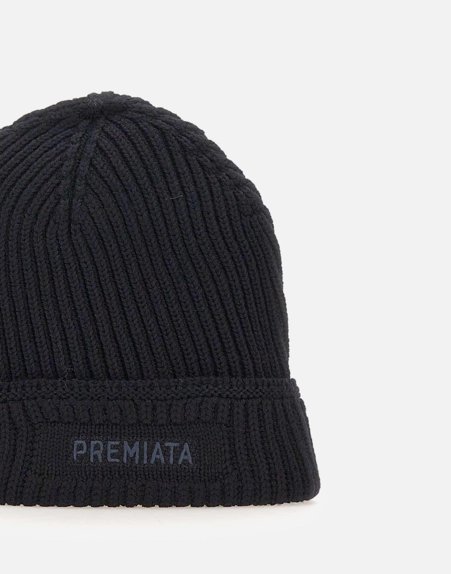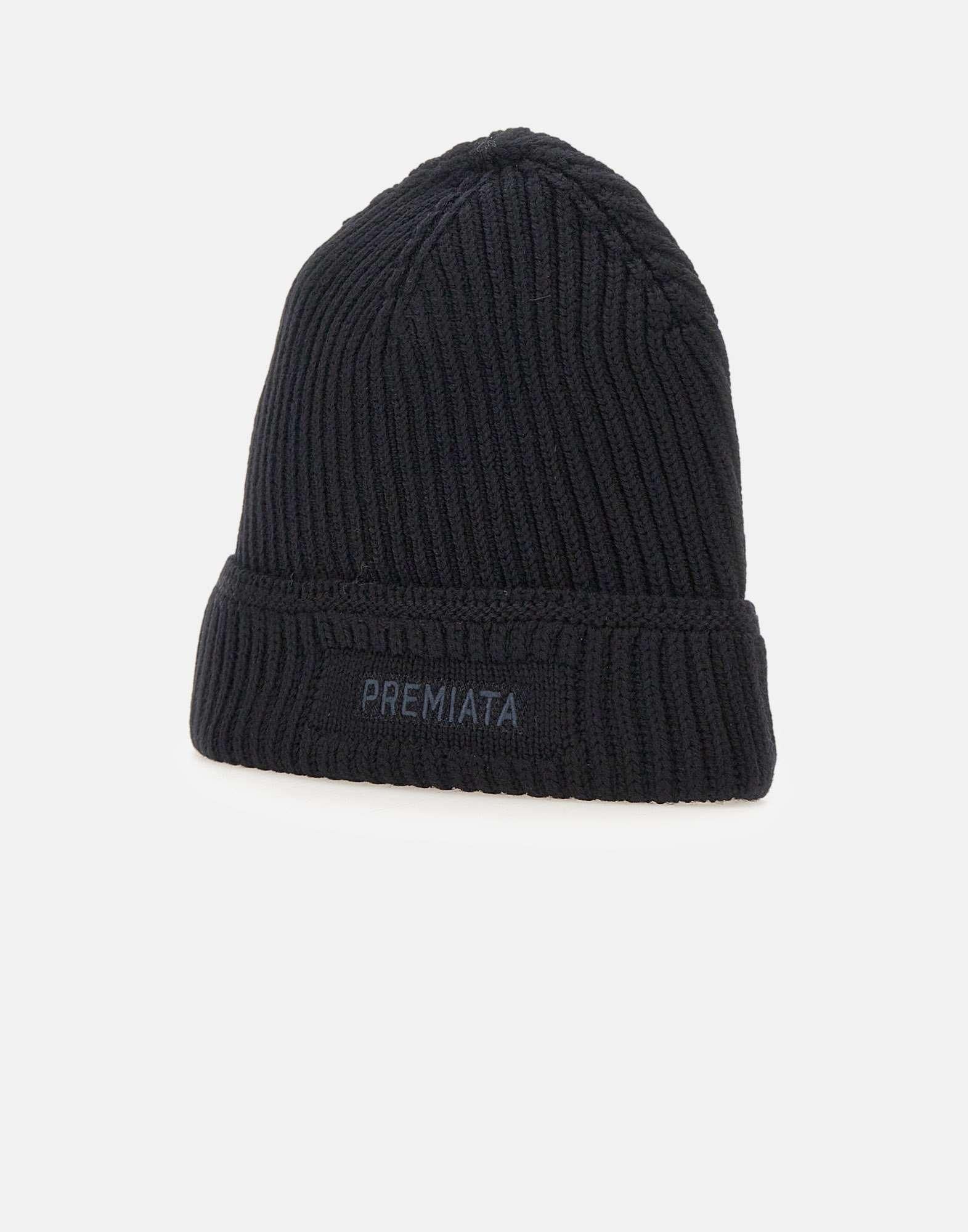 Premiata "Bale" cap, black, wool, ribbed weave, with cuff and embroidered logo, one size, made in Italy