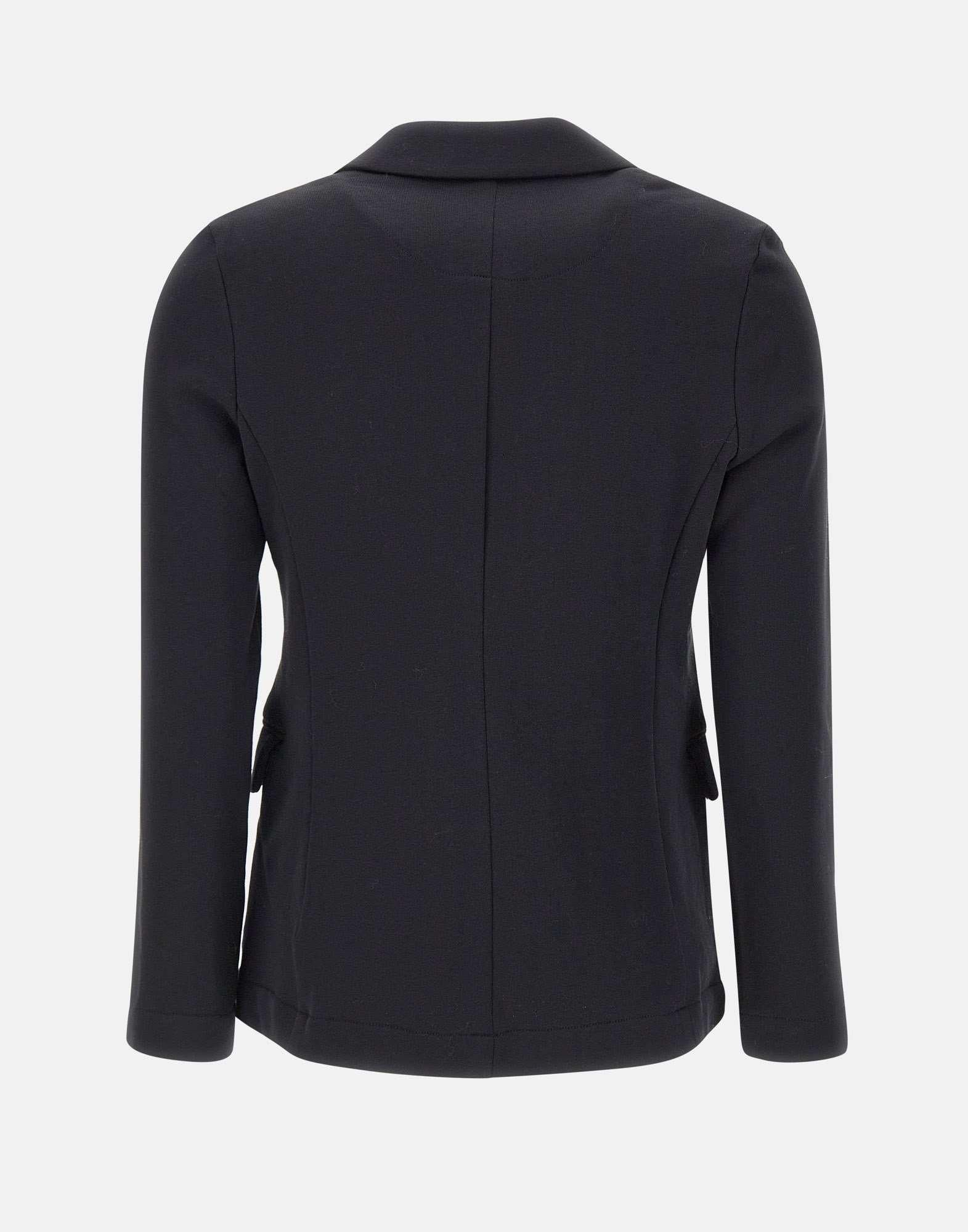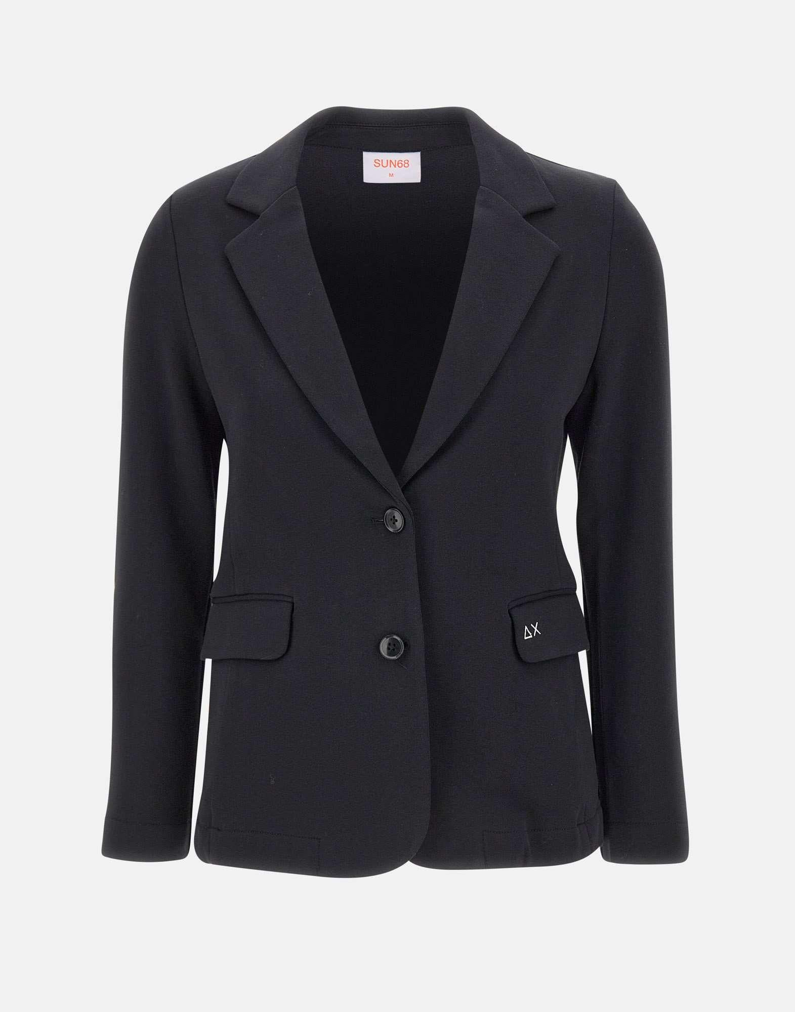 Sun68 "Blazer Basic" blazer in black cotton blend fleece, with a modern and comfortable fit. It features notched lapels, a two-button front closure, and flap pockets. The contrasting embroidered SUN68 logo adds a distinctive detail to the clean design. The regular fit balances casual elegance with everyday practicality.