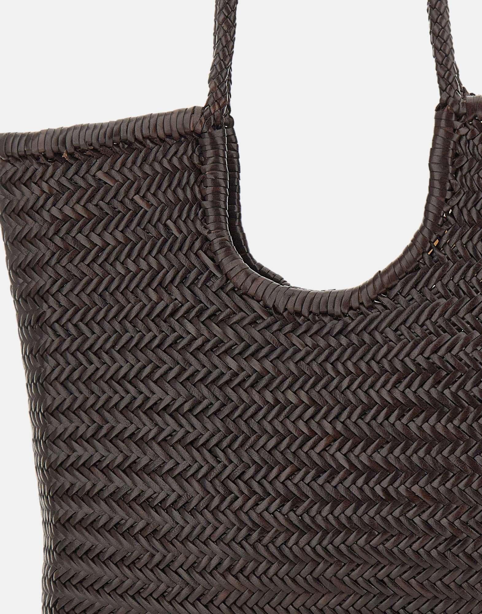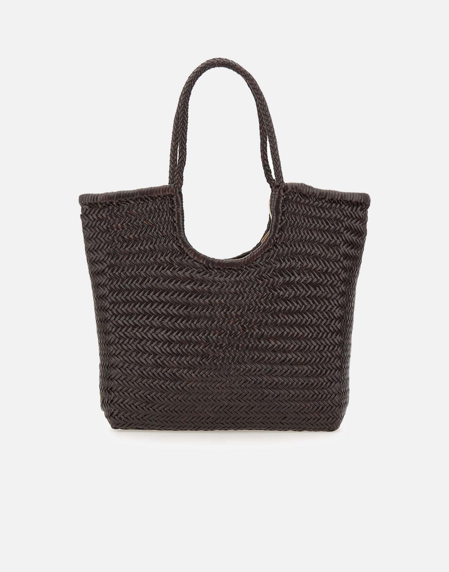 Borsa a spalla Dragon Diffusion "NS Diagonal Triple Jump" in pelle di vitello color testa di moro, realizzata a mano con intreccio verticale che esalta il design elegante e contemporaneo. Il modello, profondo e senza fodera, presenta manici intrecciati confortevoli e una pratica apertura superiore, ideale per un utilizzo quotidiano versatile. Allinterno è cucito a mano il ciondolo di San Cristoforo, simbolo di autenticità e omaggio alla tradizione artigianale del brand. Dimensioni: altezza 33 cm, larghezza 30 cm, profondità 7 cm.