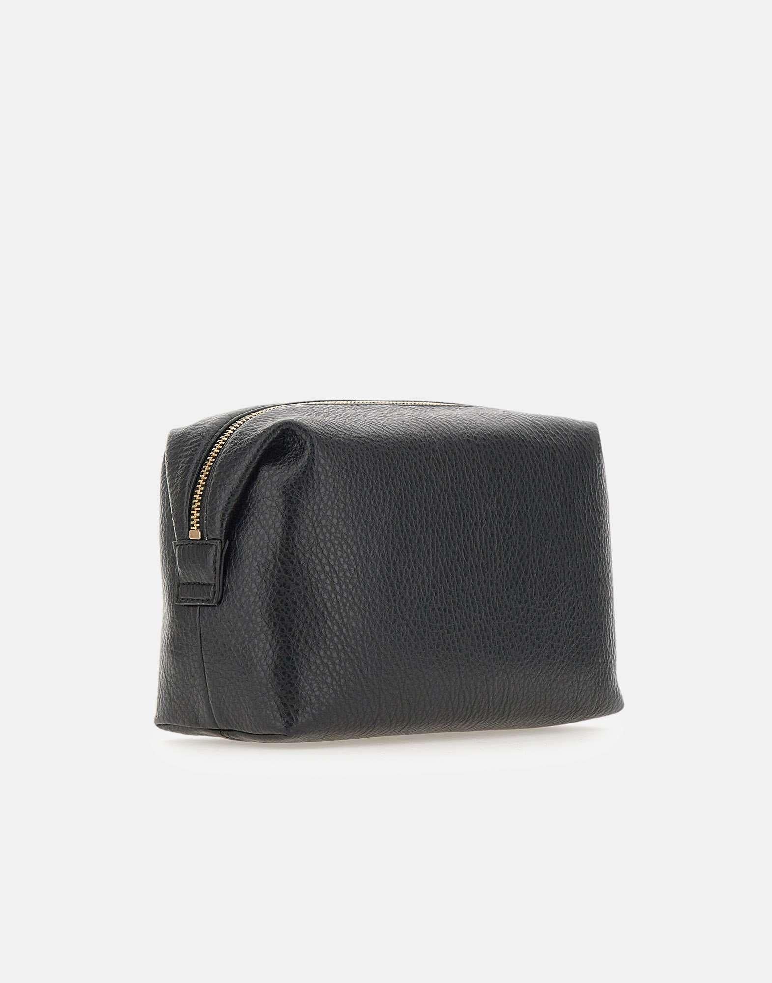 Liu-Jo "Caliwen" clutch bag in black tumbled-effect faux leather, with a compact and elegant design. It features a top zip closure, a metal logo on the front, and gold hardware that adds a touch of sparkle. Complete with a branded lining and dust bag. Ideal for carrying by hand or as an evening bag. Dimensions: 22x10x15 cm.