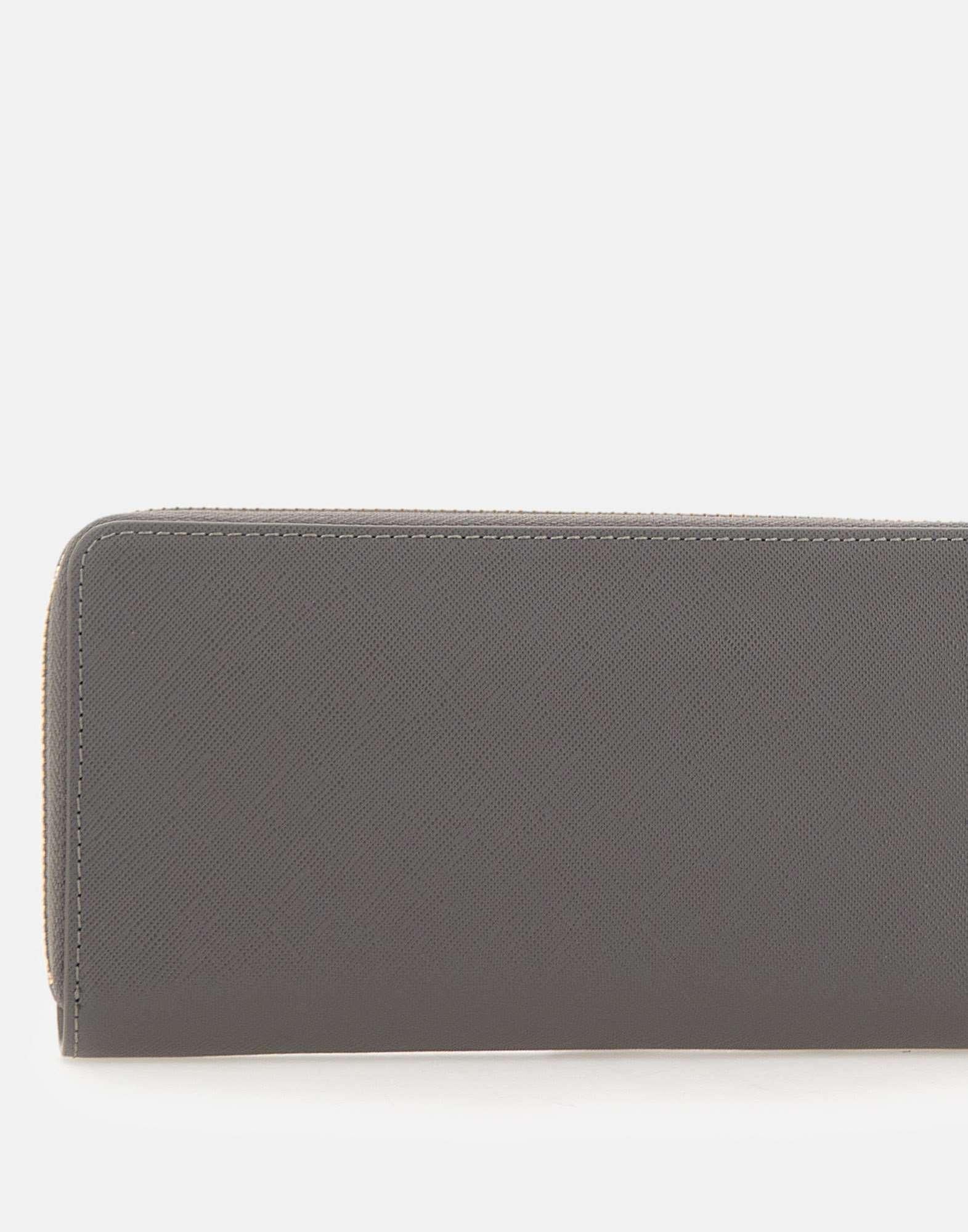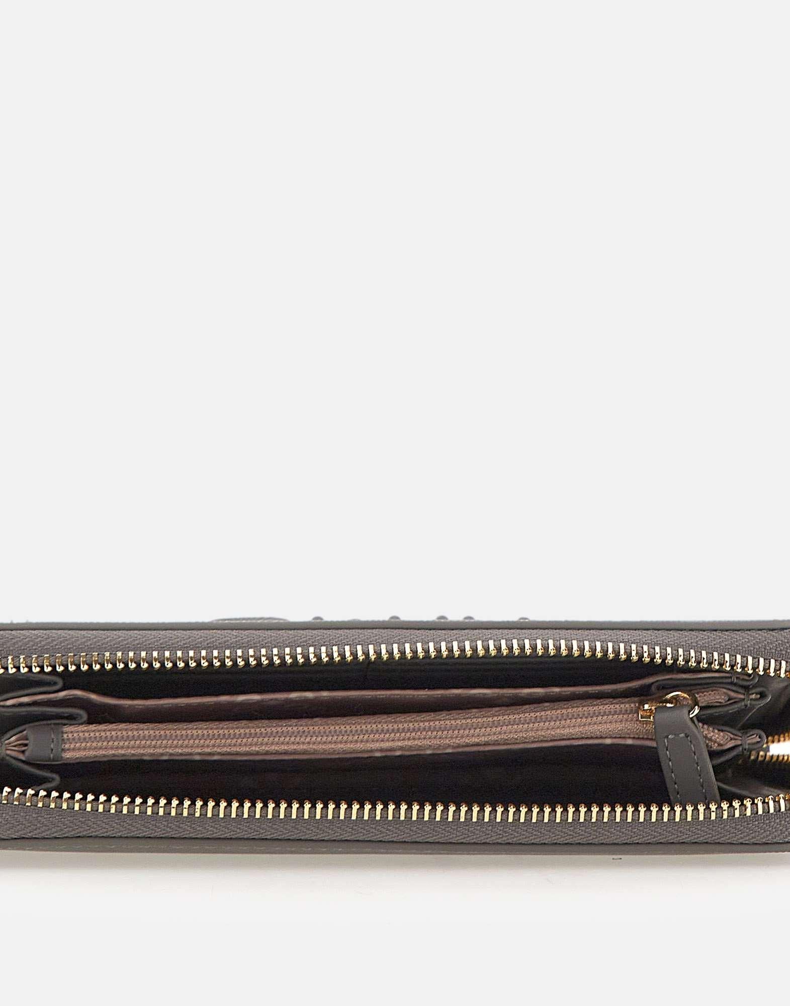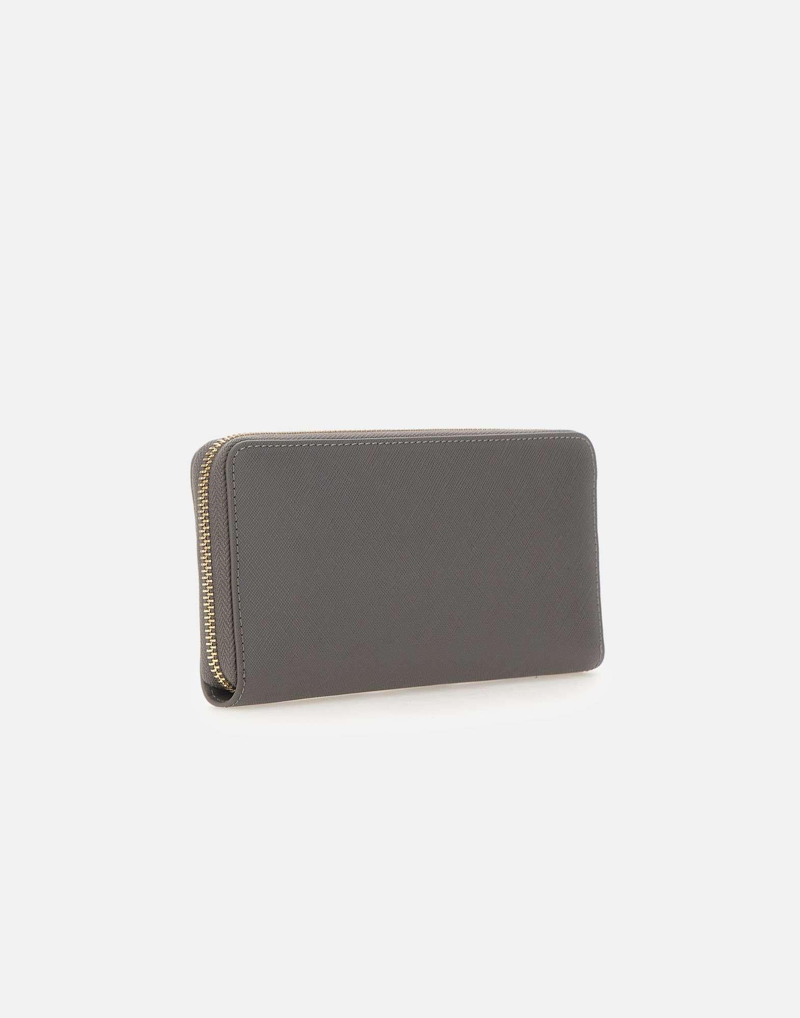 Liu Jo "Caliwen" wallet in grey eco-leather, combining refined design and functionality. Features embossed front logo, gold-tone zip-around closure, and a well-organized interior with compartments for bills, cards, and coins. Part of the sustainable "Liu Jo Better" line, blending style with environmental awareness. Size: 20 x 10 x 2 cm.