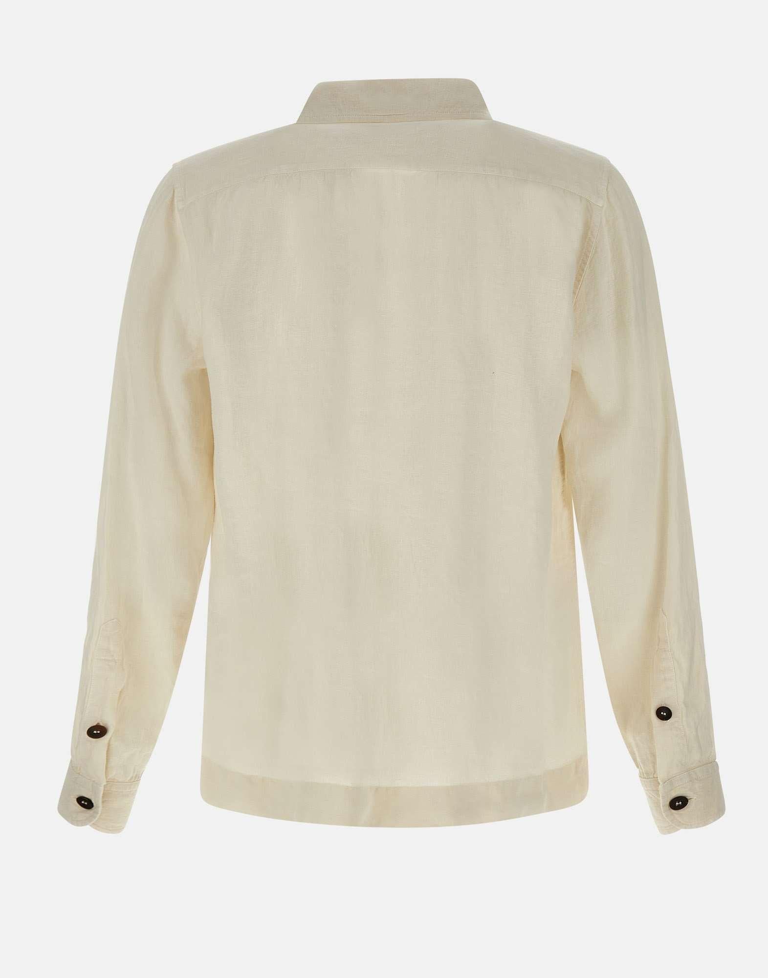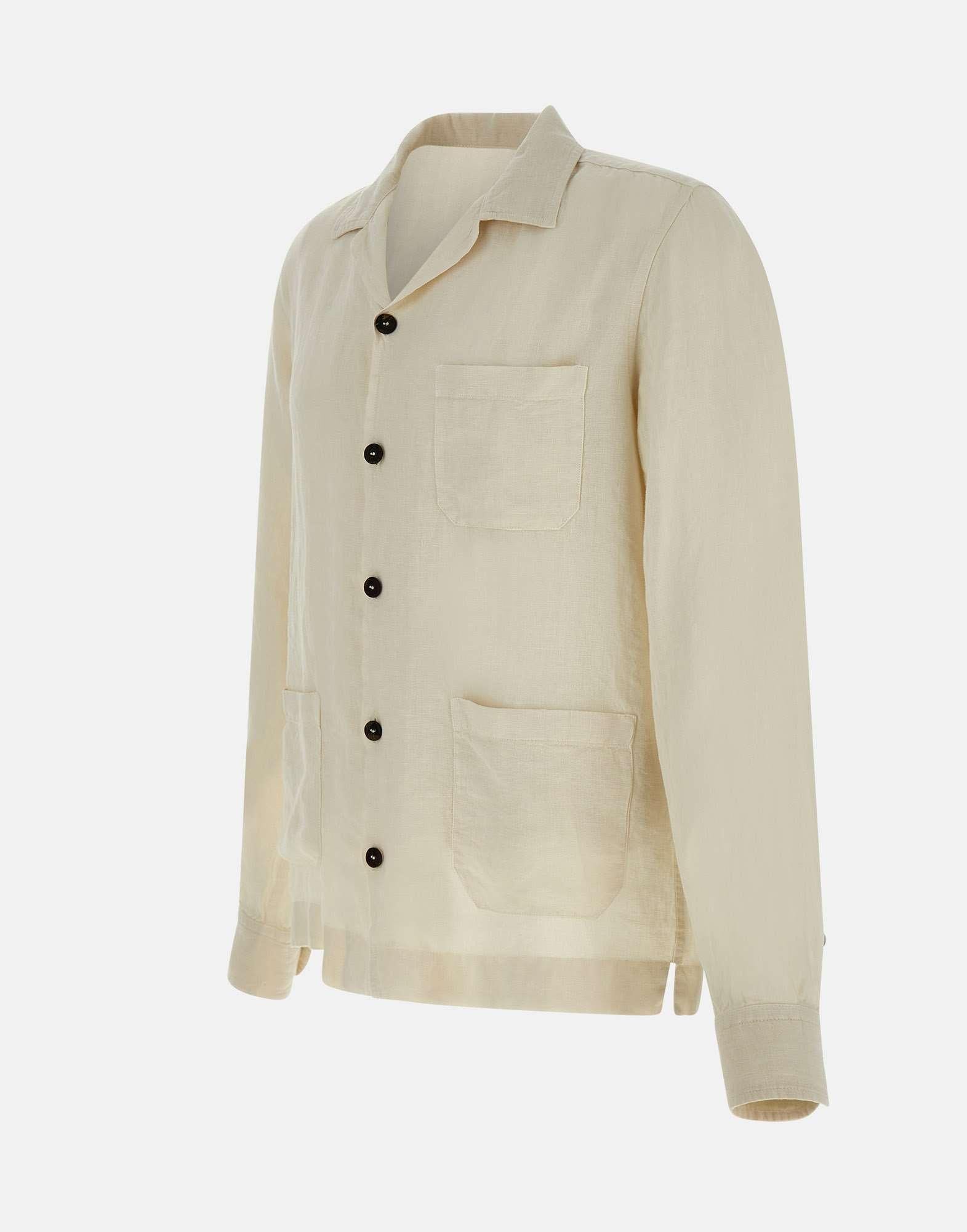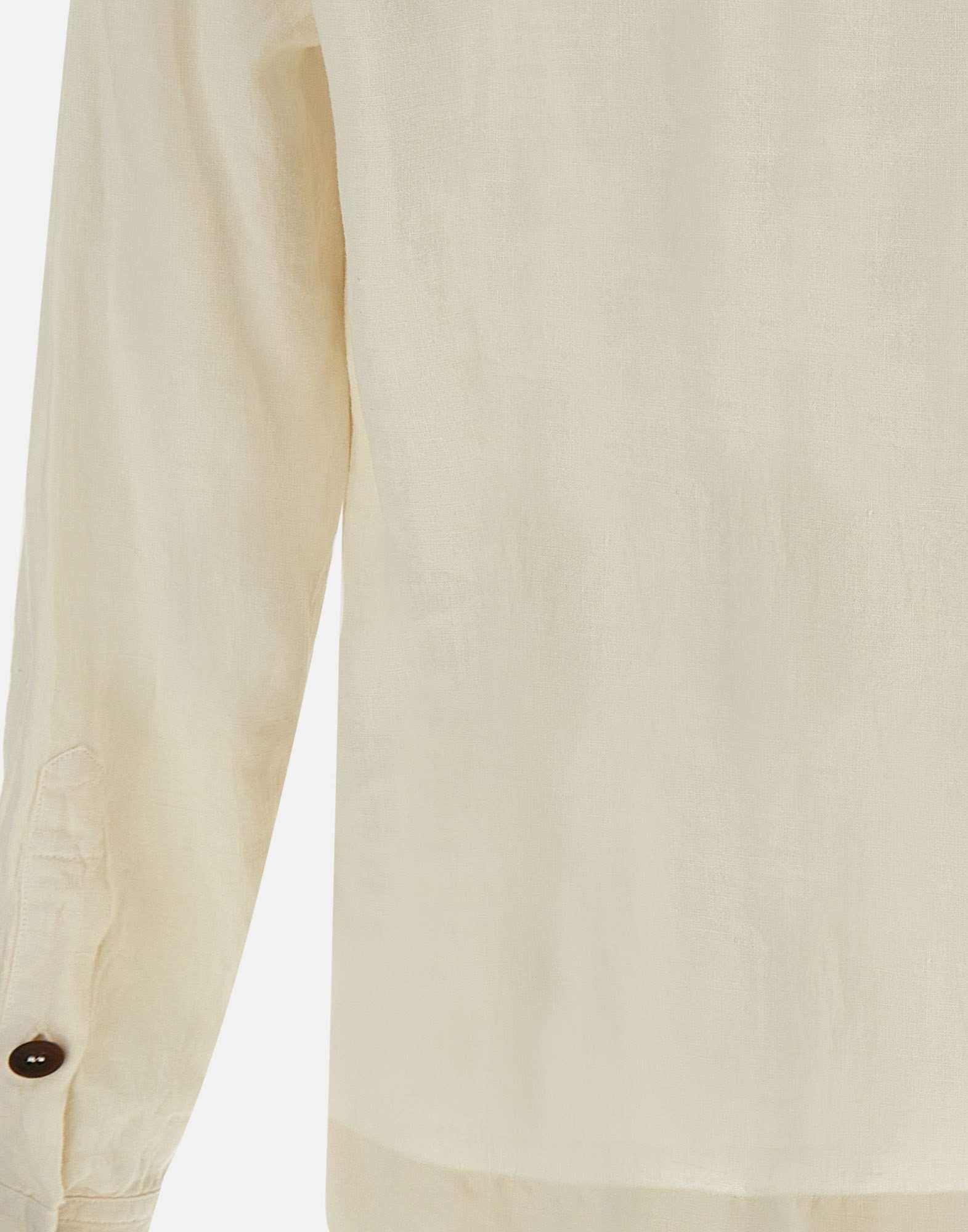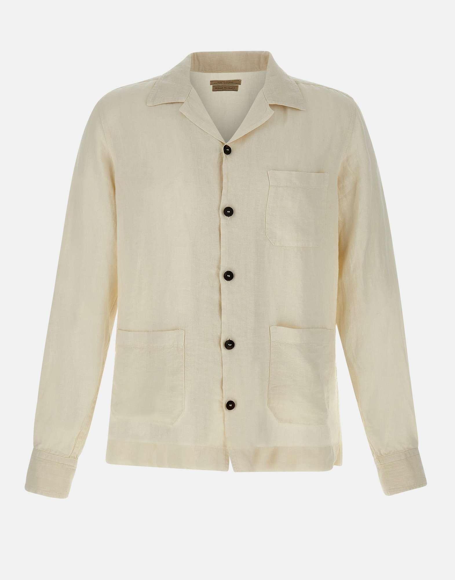 Devorè Incipit "Dvg4 Rick" men's linen shirt, cream, long sleeves, classic collar, contrasting button closure, cuffs with dual-use buttons, front pockets, chest pocket, vents at hem, made in Italy, perfect companion for summer season, regular fit.