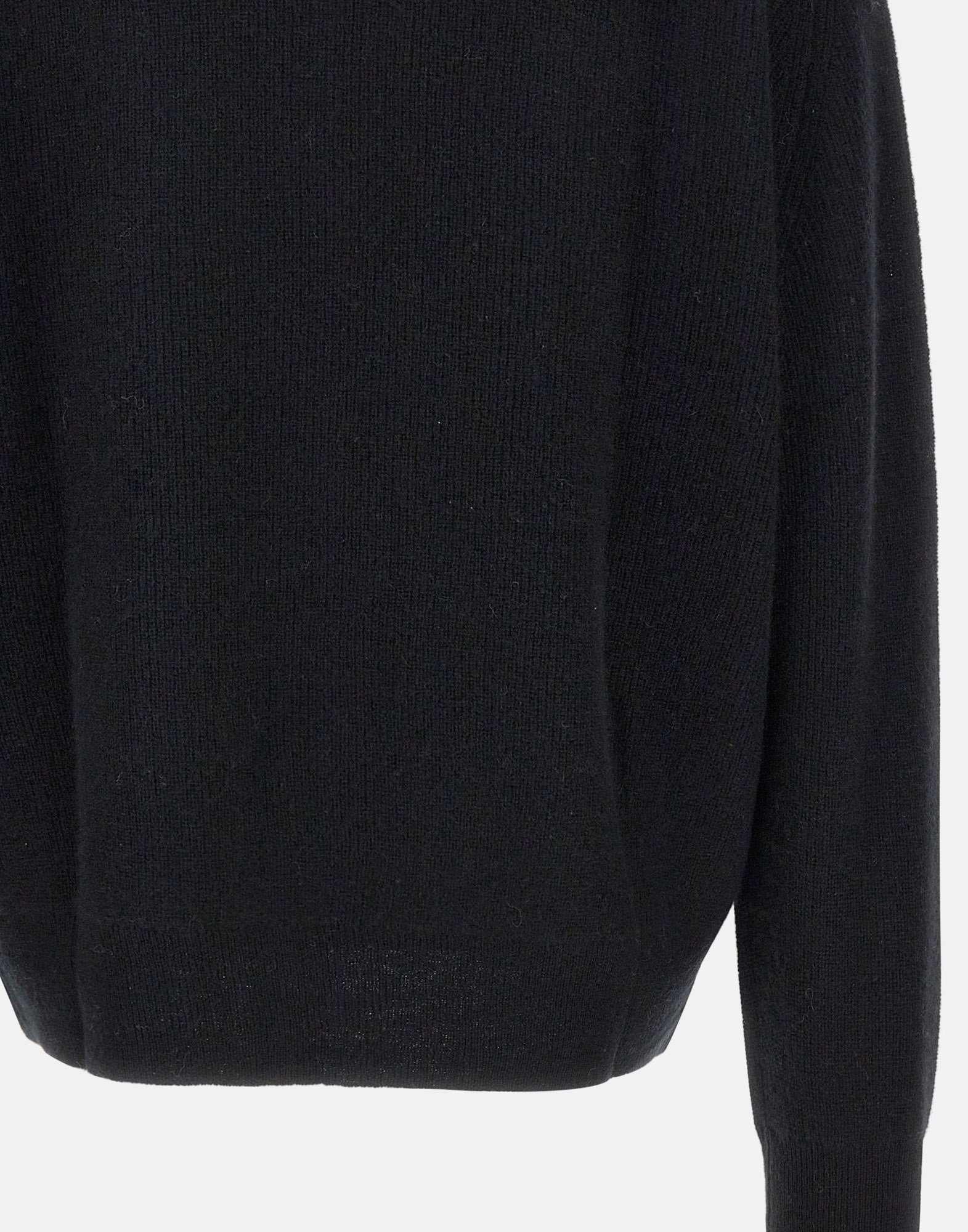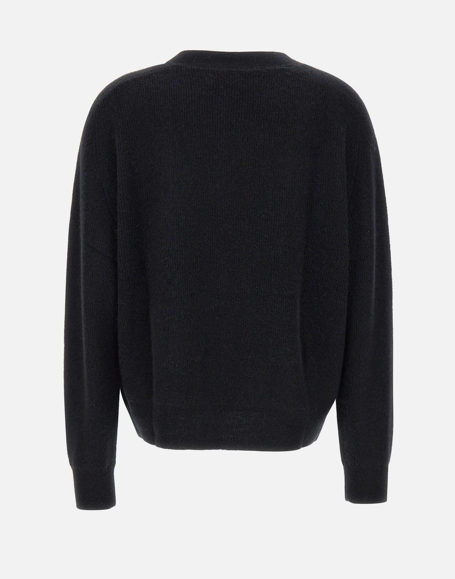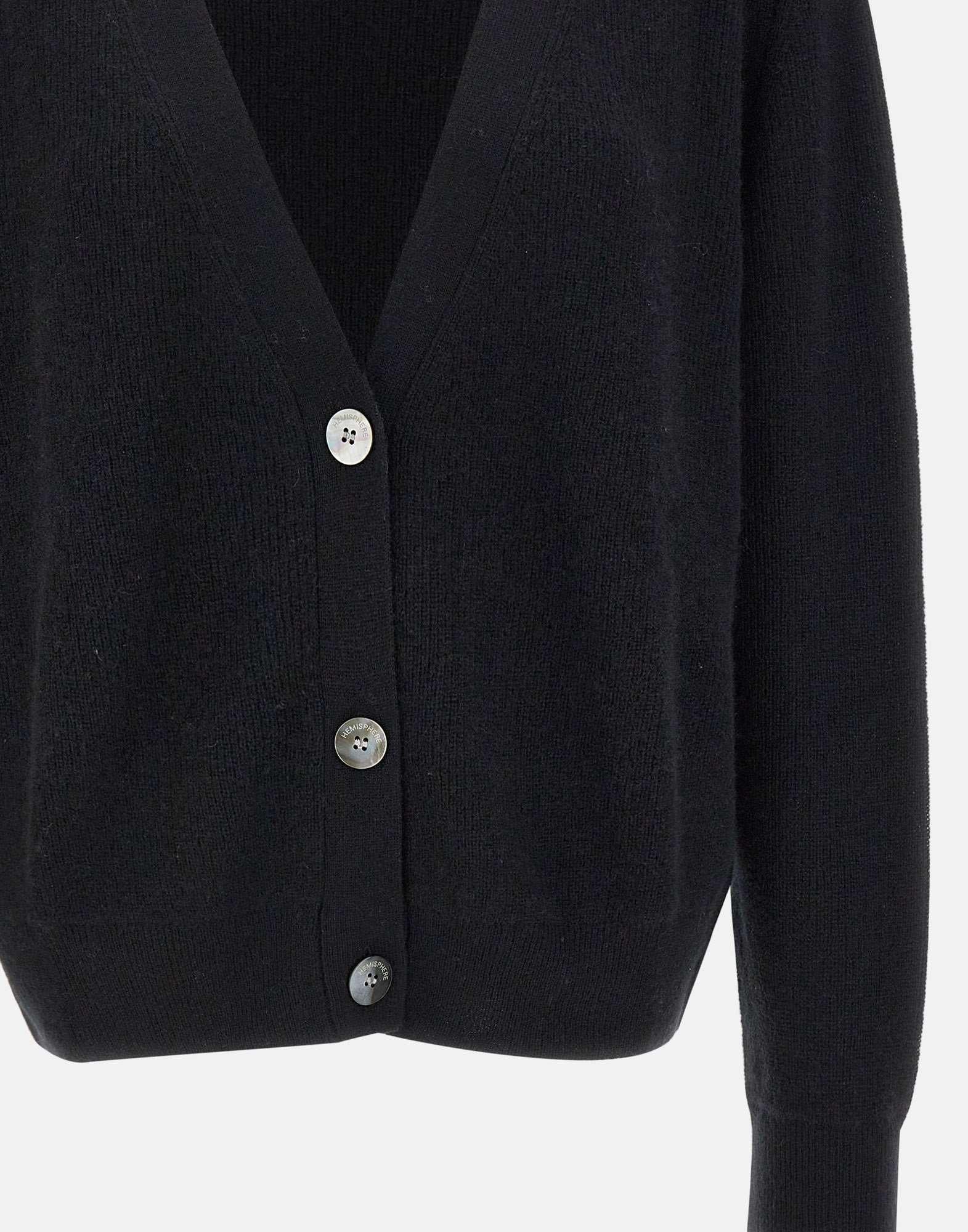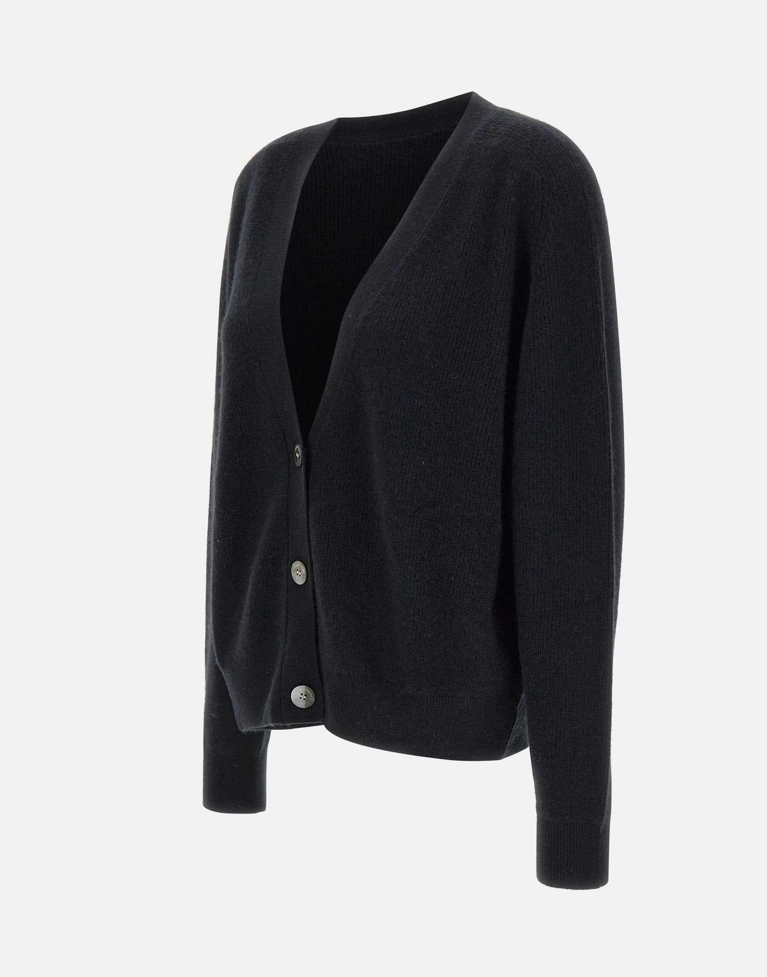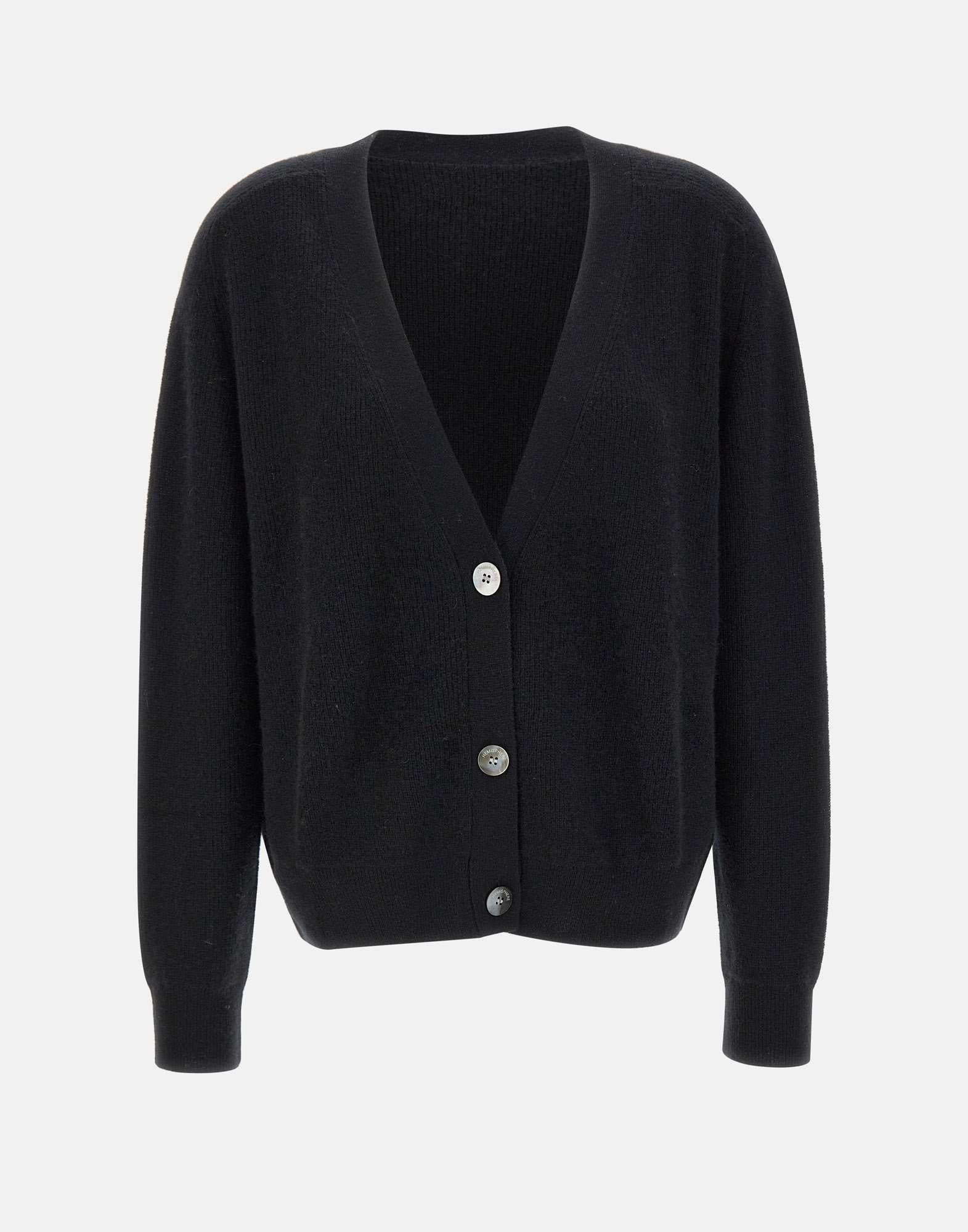 This elegant and enveloping women's Hemisphere cardigan in pure black cashmere features a V-neck, a front closure with large mother-of-pearl buttons, long sleeves, and raglan shoulders for a comfortable fit. Ribbed edges complete design, adding structure and a touch of sophistication. The relaxed fit is ideal for casual-chic looks and seasonal layering.