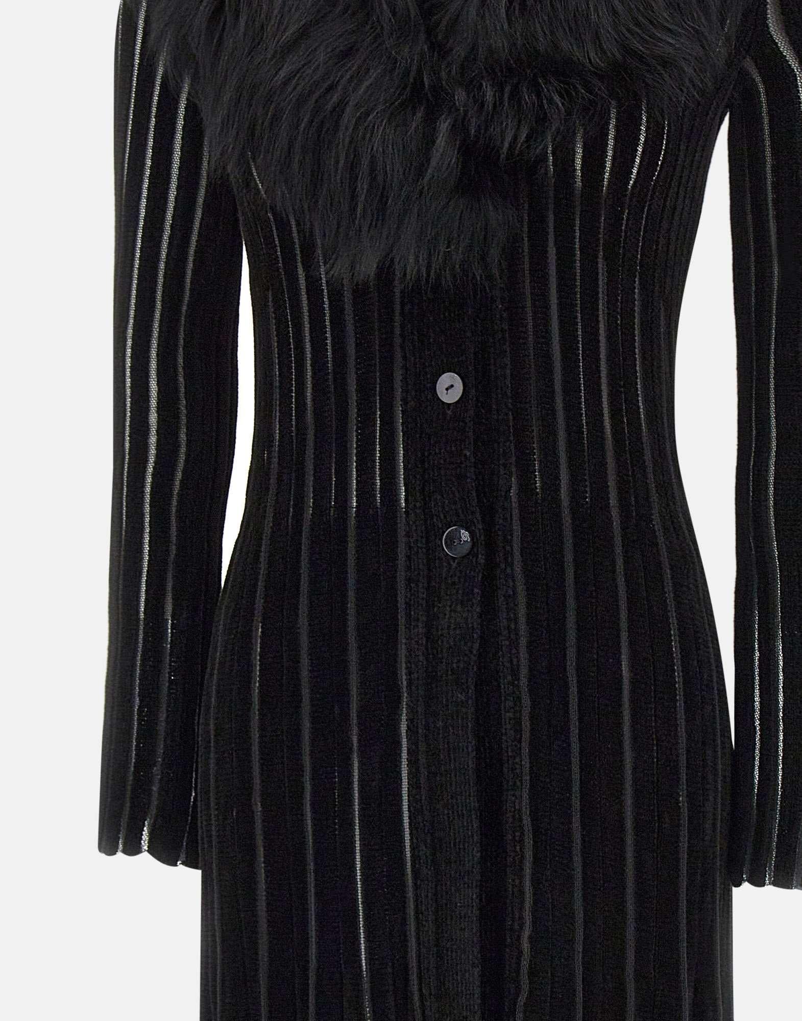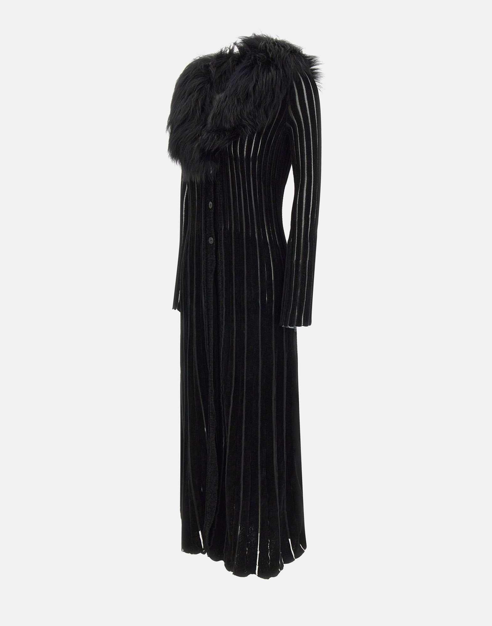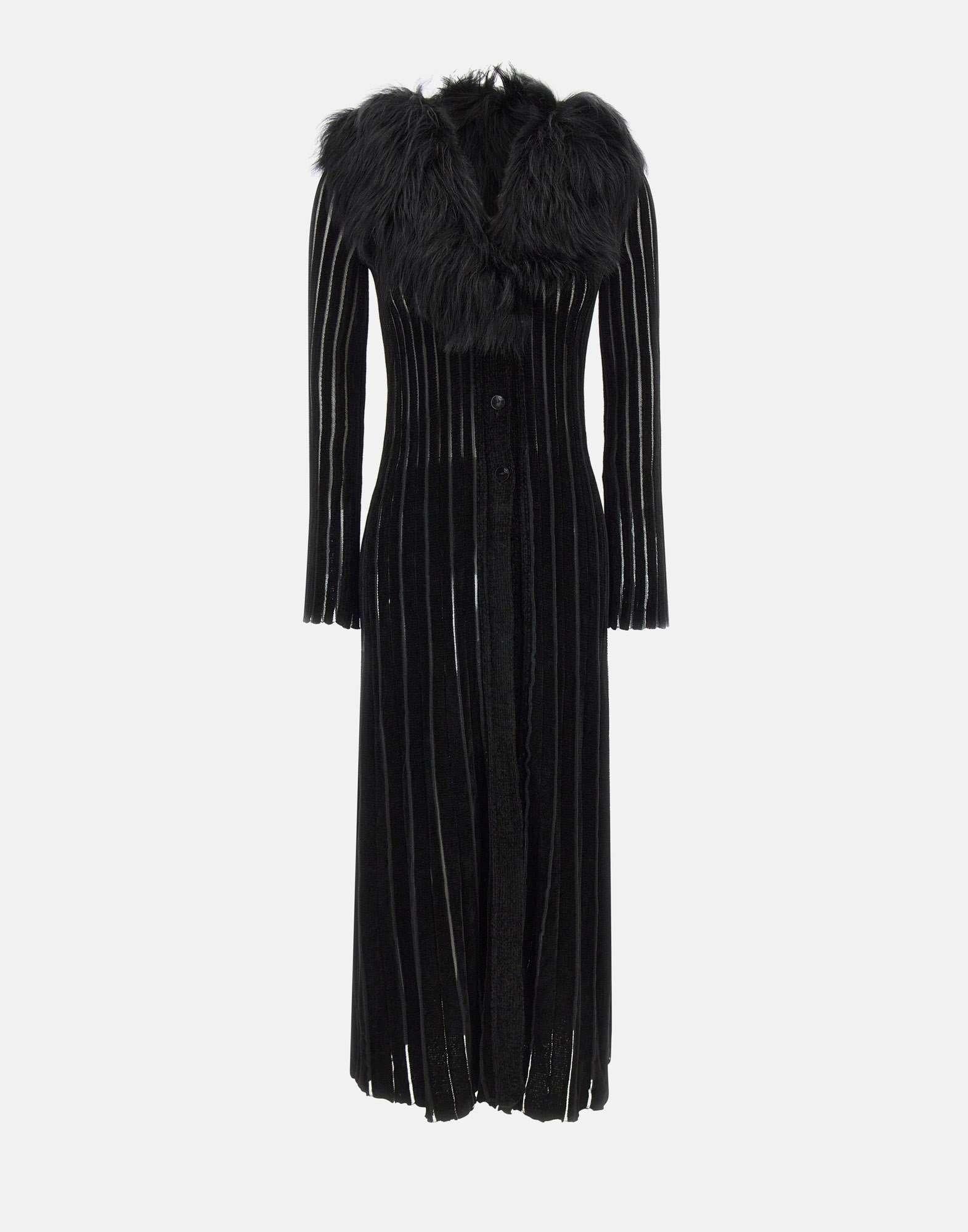 Long Blumarine cardigan crafted from viscose chenille-effect knit in timeless black. Featuring a removable faux-fur collar for a sophisticated touch, tonal logo buttons, long sleeves, and vertical ribbed texture that enhances the silhouette. Regular fit. Made in Italy.