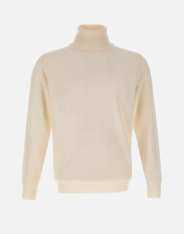 Kangra men's pure cashmere turtleneck sweater in cream, featuring a high neck and long sleeves. Finished with ribbed edges at collar, cuffs, and hem for an elegant touch and impeccable fit. A winter wardrobe staple, warm and soft against skin. Made in Italy with highest-quality yarns.