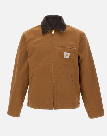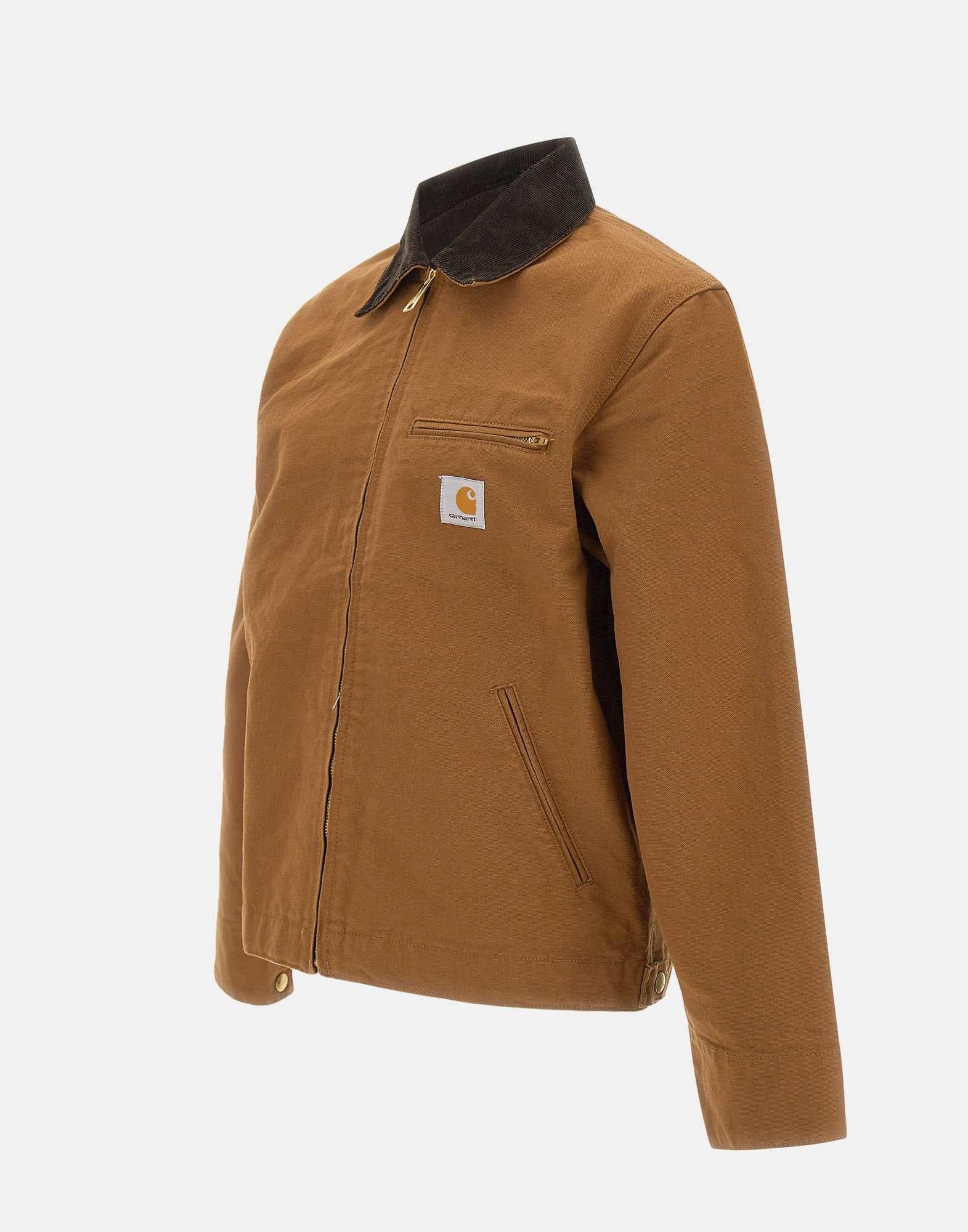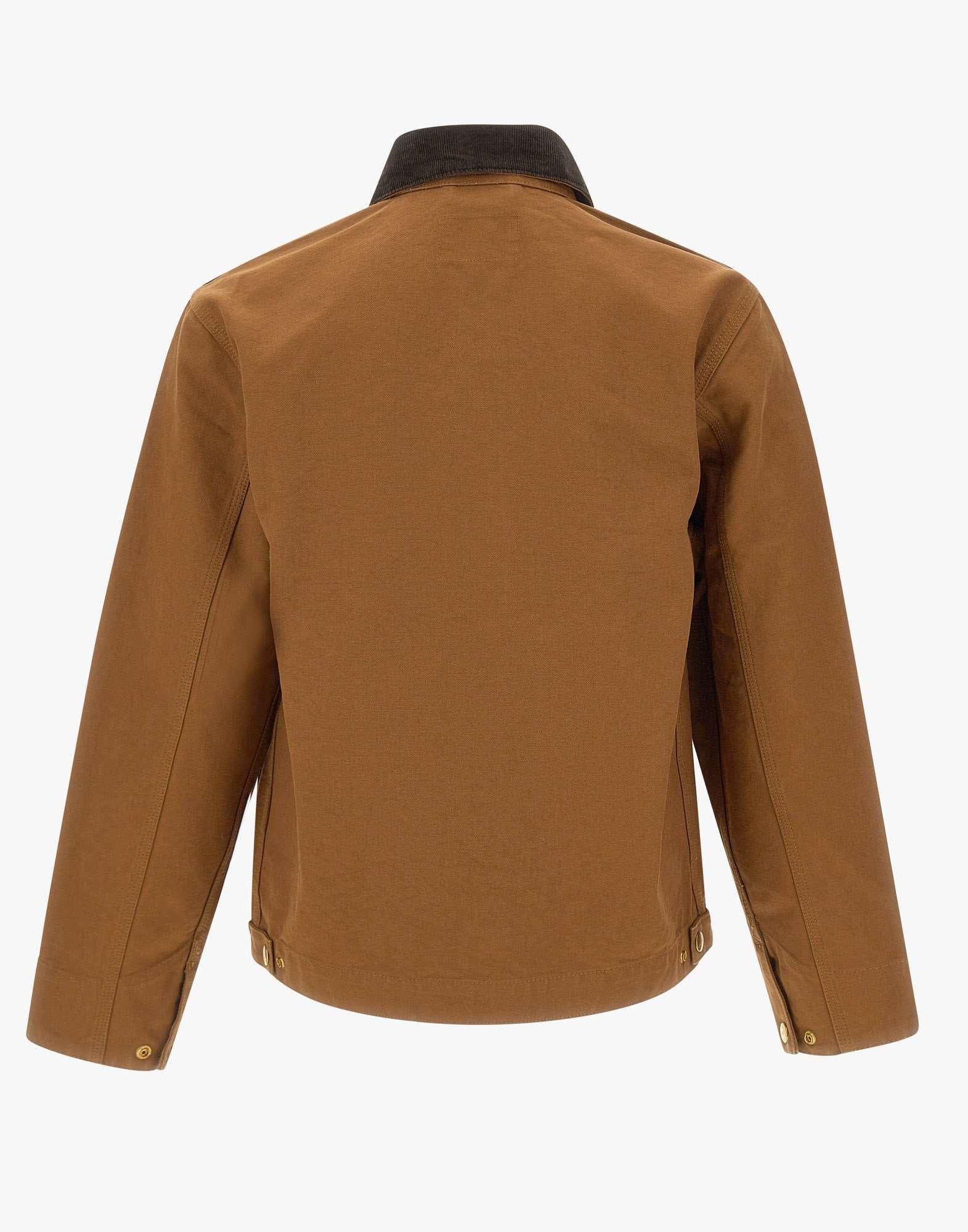 Carhartt Wip men's "Detroit" jacket in brown, crafted from heavyweight Dearborn canvas with an unlined construction. Features a dark brown corduroy collar, front zip closure, zipped chest pocket, and welt side pockets. Adjustable cuffs and hem with snap buttons ensure a tailored fit. Finished with the signature square Carhartt fabric label on the chest. A timeless workwear staple with rugged appeal.