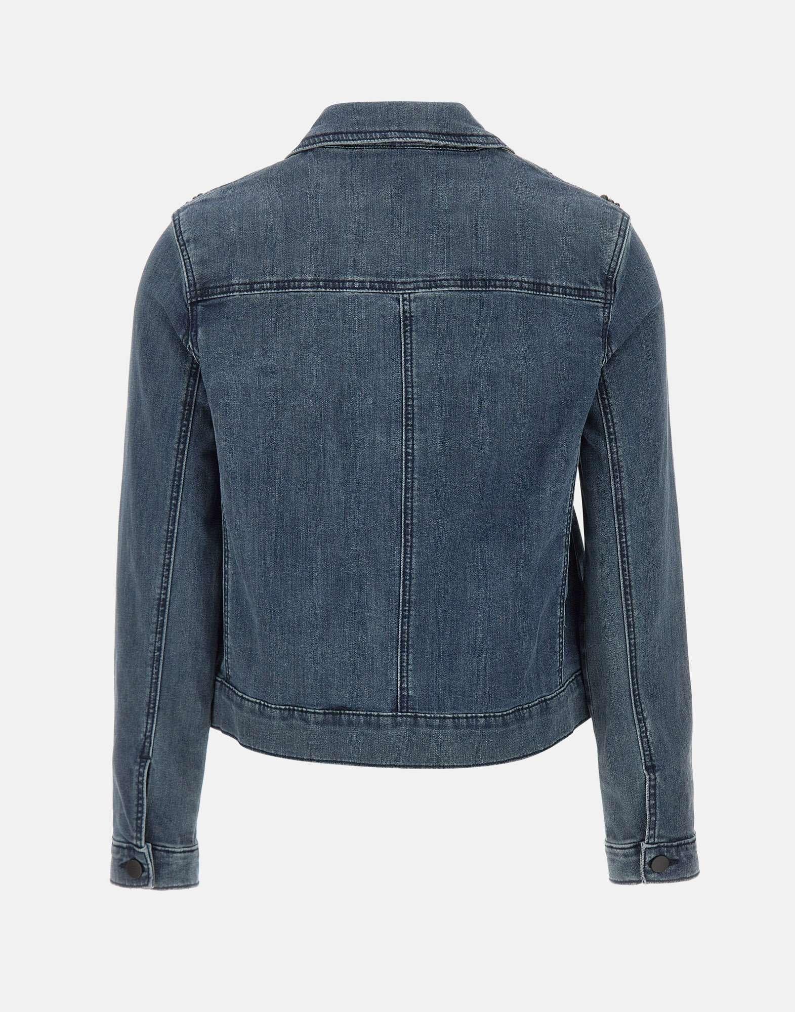 Elena Miro women's jacket crafted from dark blue stretch cotton-blend denim, embellished with floral decorations made of black sequins and beads. Designed with a shirt collar and a front button fastening with satin black buttons, it features two front patch pockets. Buttoned cuffs complete the look for a refined, versatile finish. Regular fit.