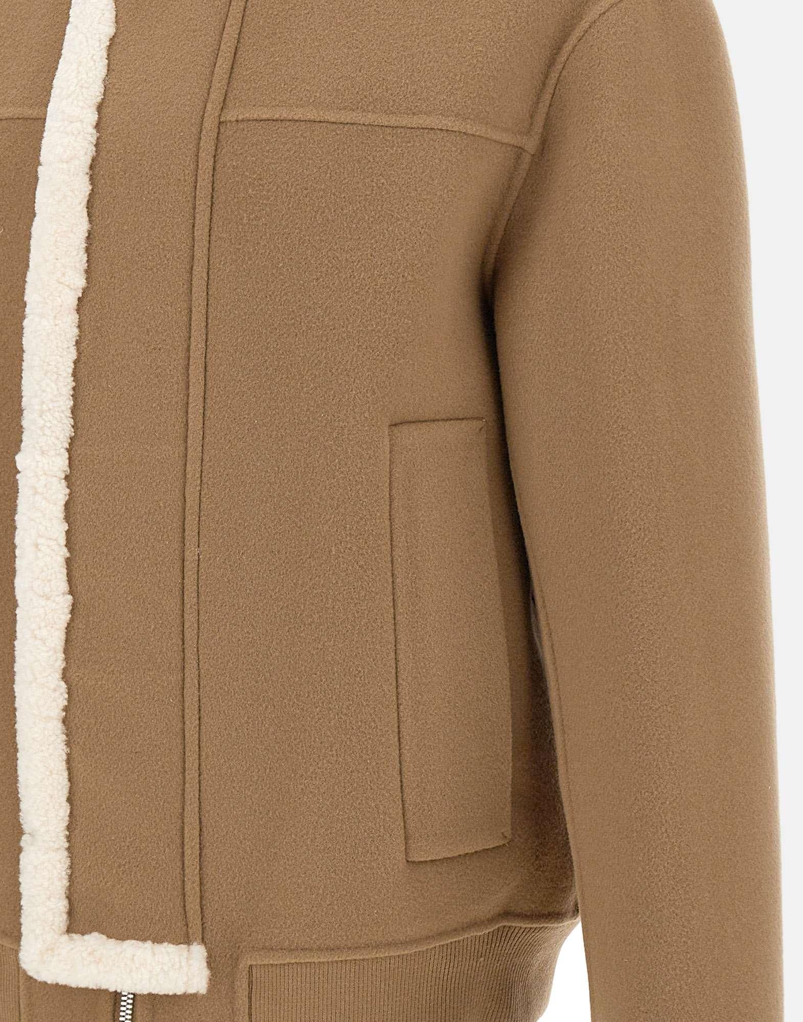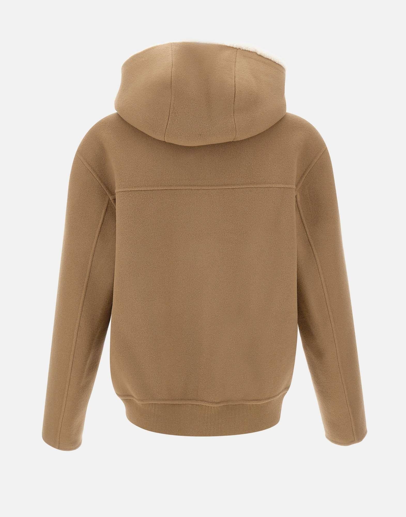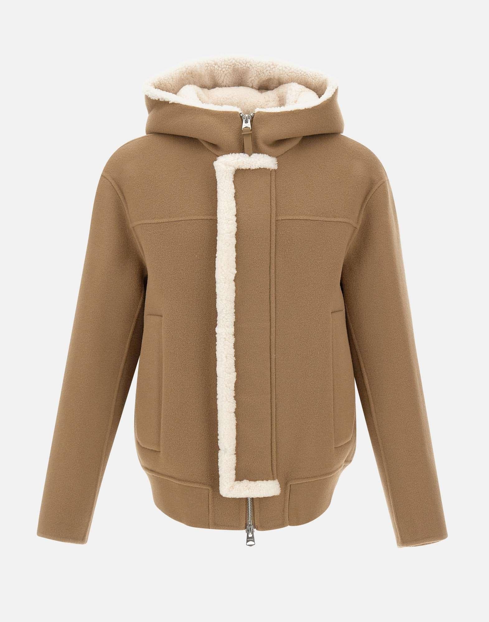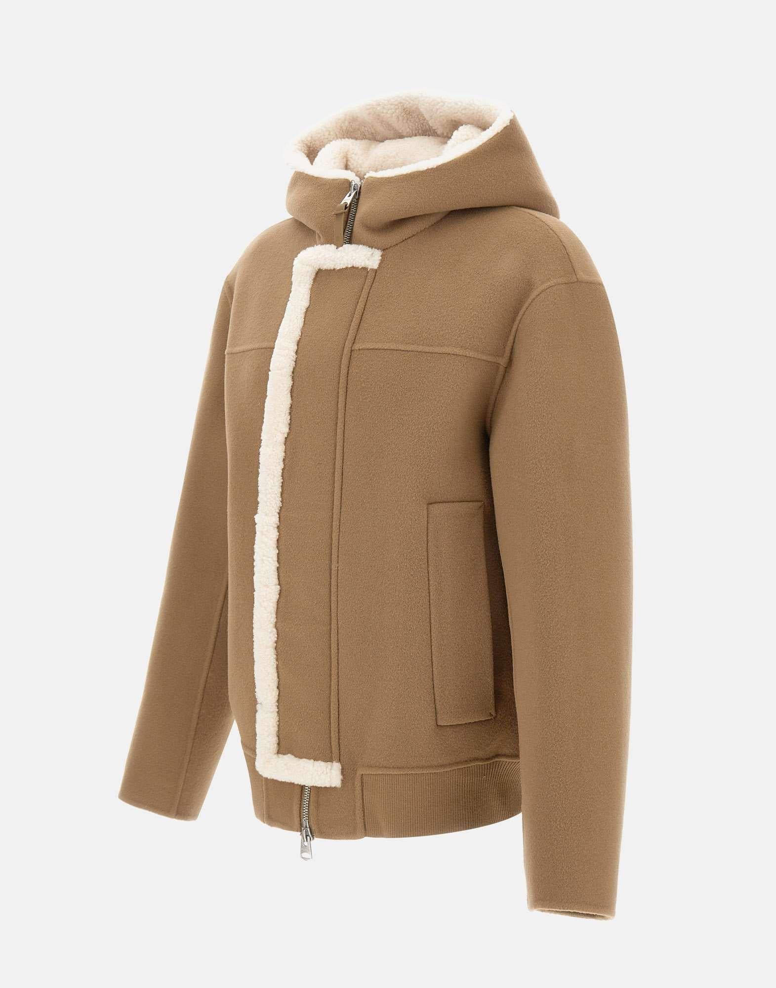 Mackage "Jay" men’s coat in heavy RWS-certified double-face wool, camel color. Designed with a non-removable hood lined in shearling, two-way front zip closure, concealed snap-button placket and leather strap with snaps. Finished with ribbed knit belt, shearling insert under the front placket and side welt pockets. Unlined. Relaxed fit. Temperature rating: -5 °C. Dry clean only by a leather care specialist.