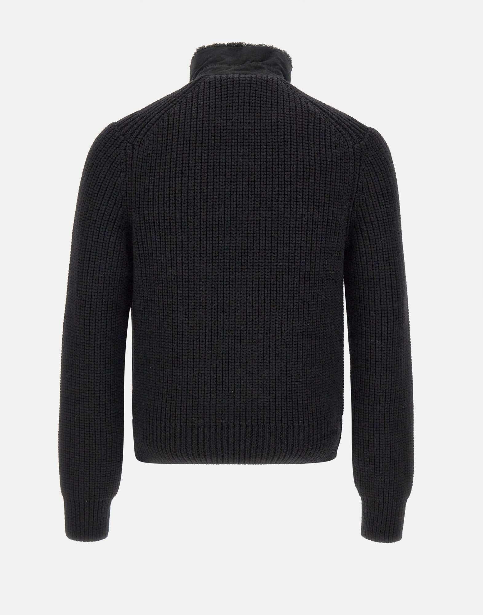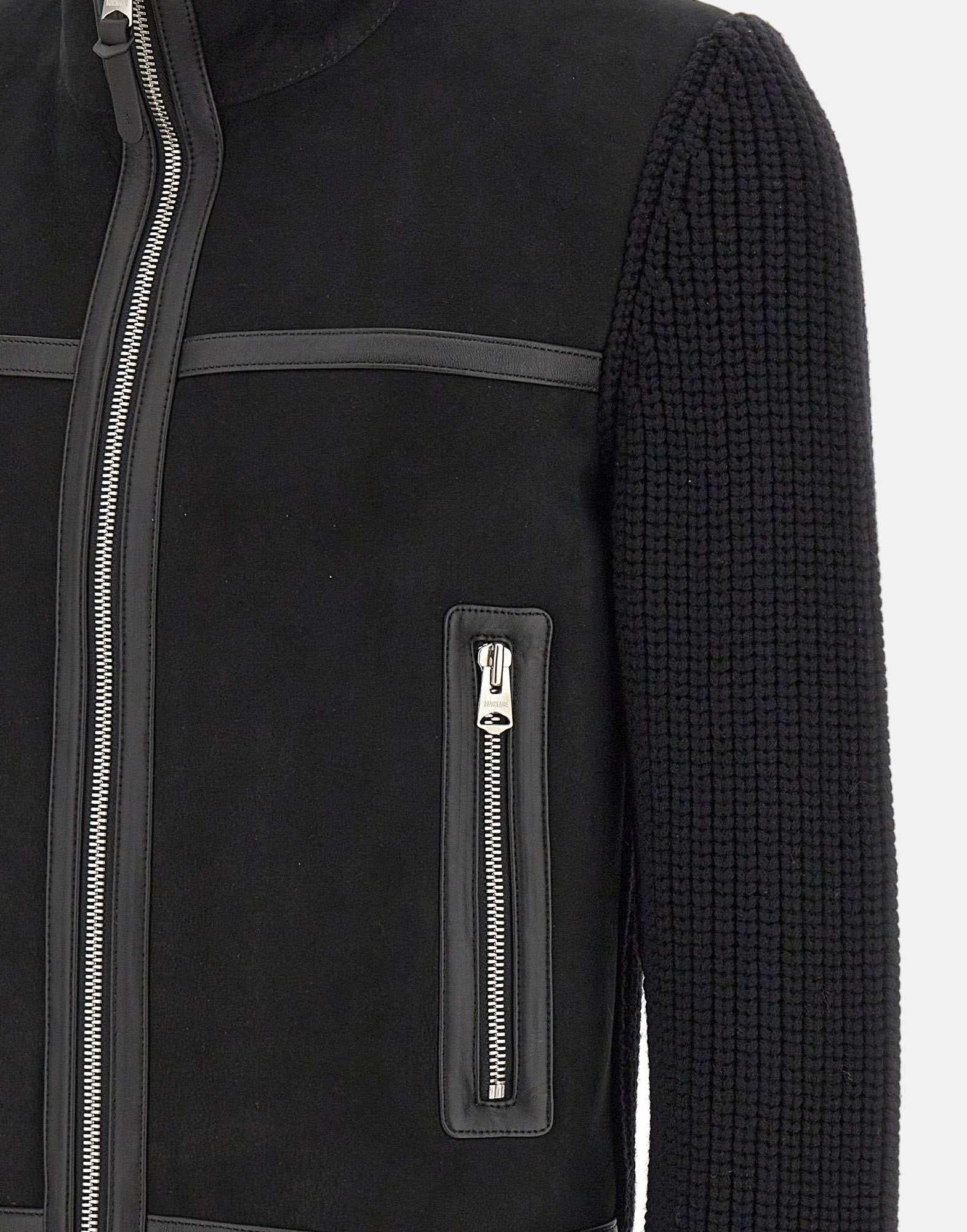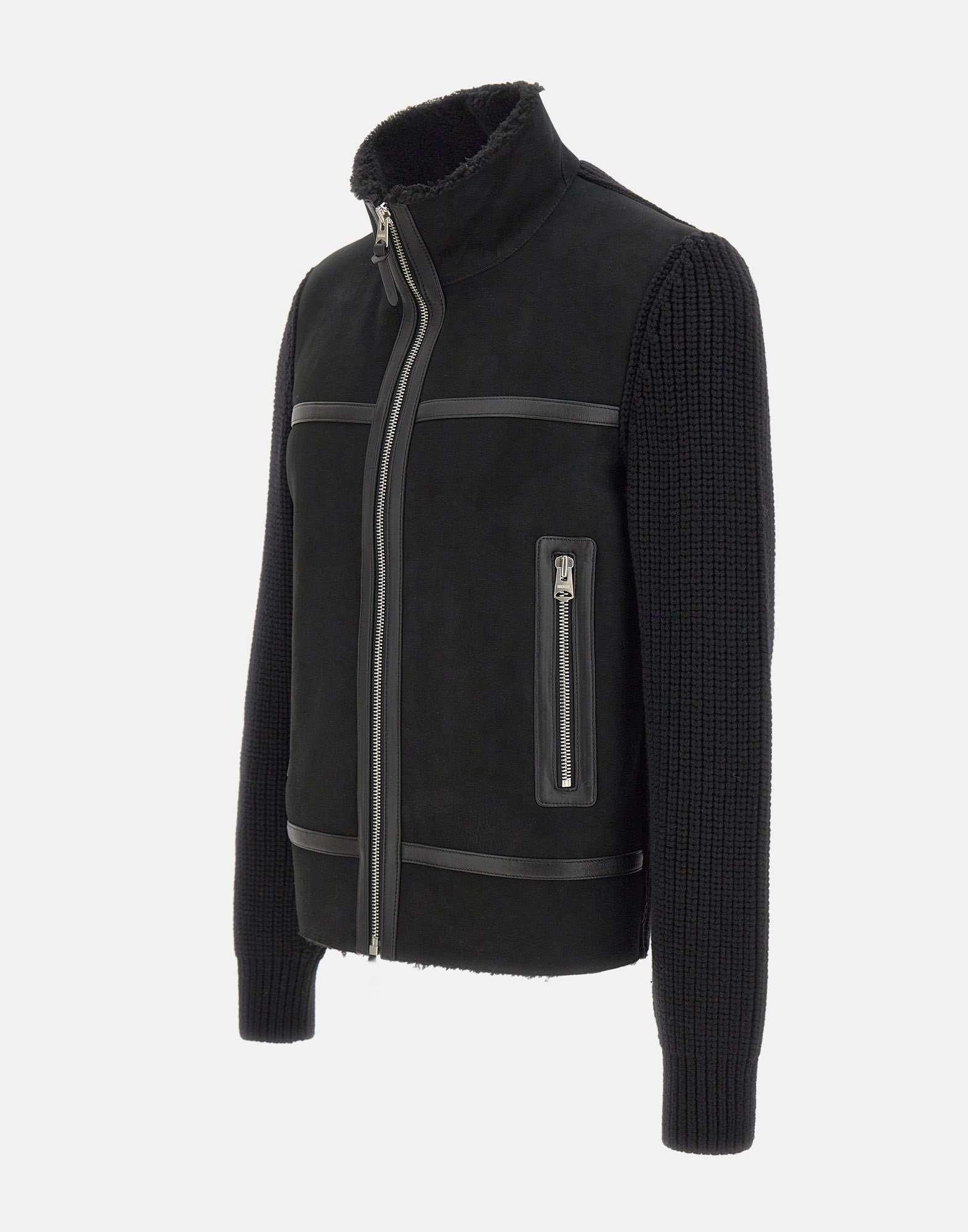 Mackage "Jonathan" men's jacket in mixed technique, crafted in black. Made of 100% knitted merino wool with shearling collar and panels for warmth and luxury. Features knitted sleeves, front zip closure with leather trim, and silver-tone hardware. Front zip pockets. Unlined for a lightweight feel. Dry clean only. Regular fit.