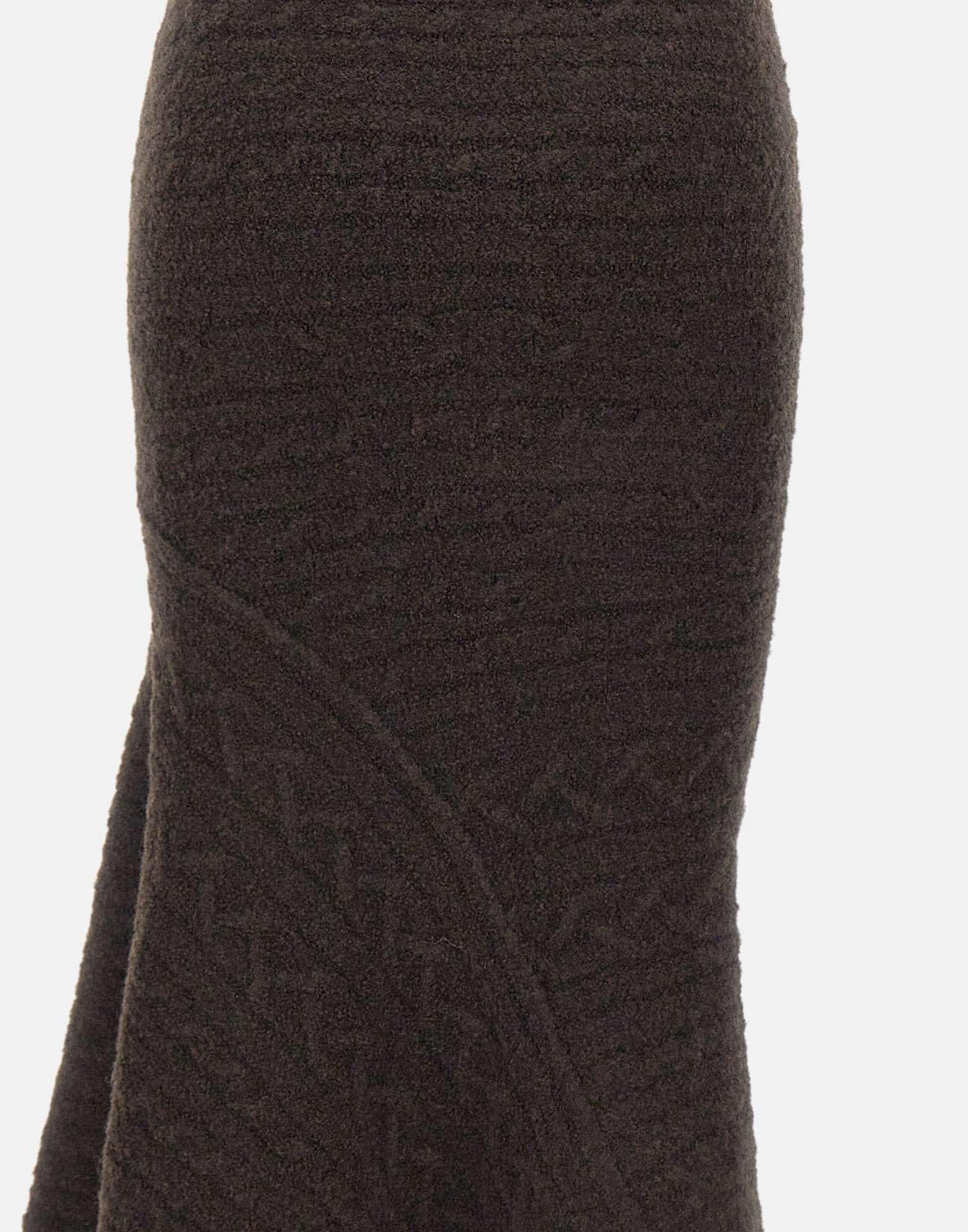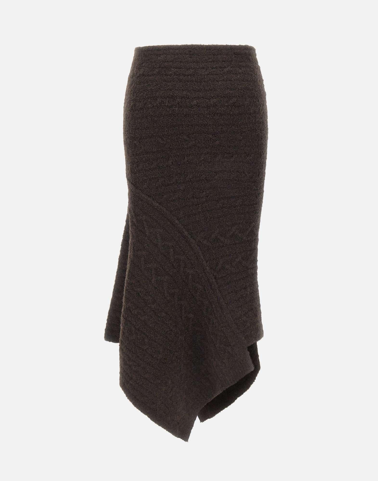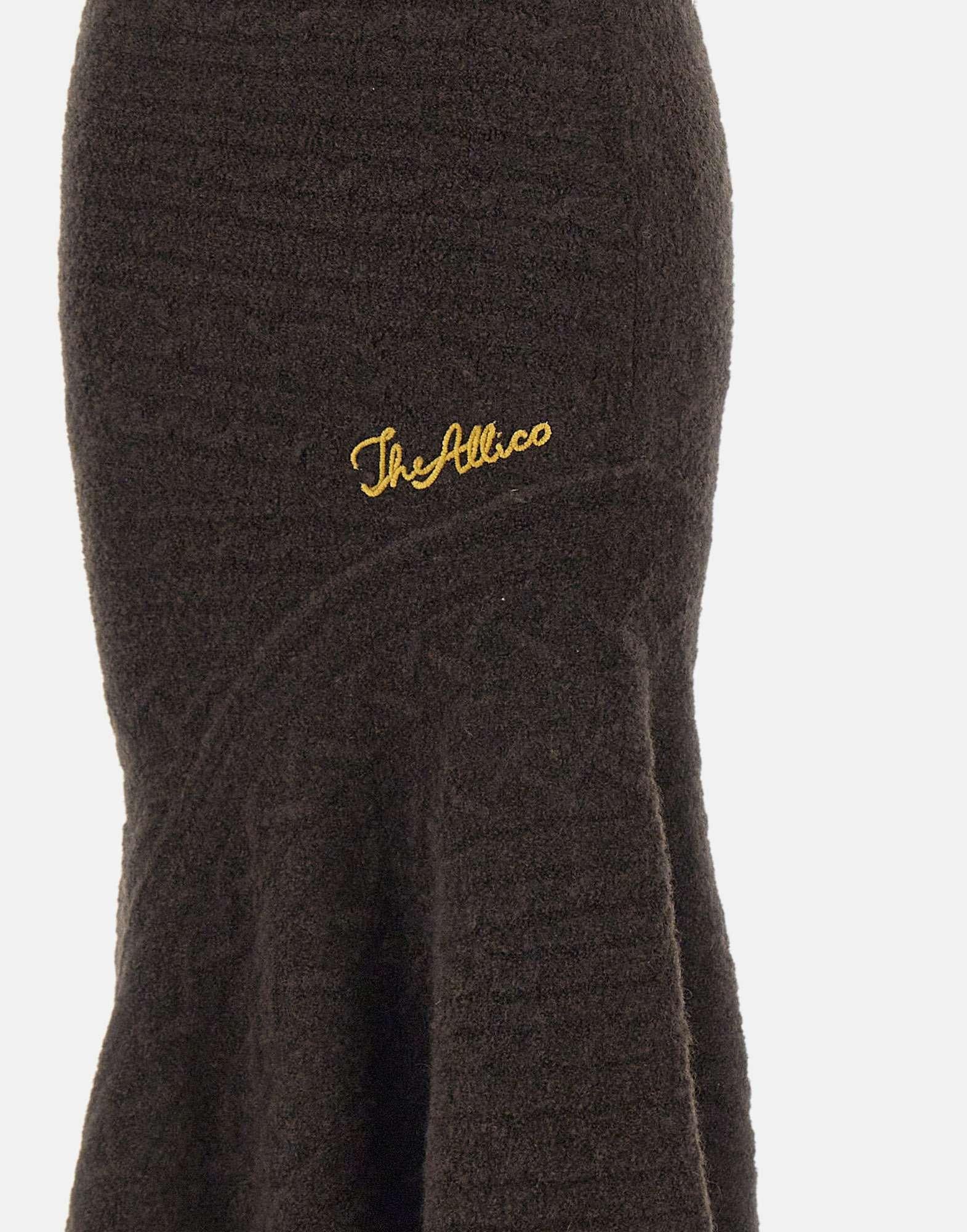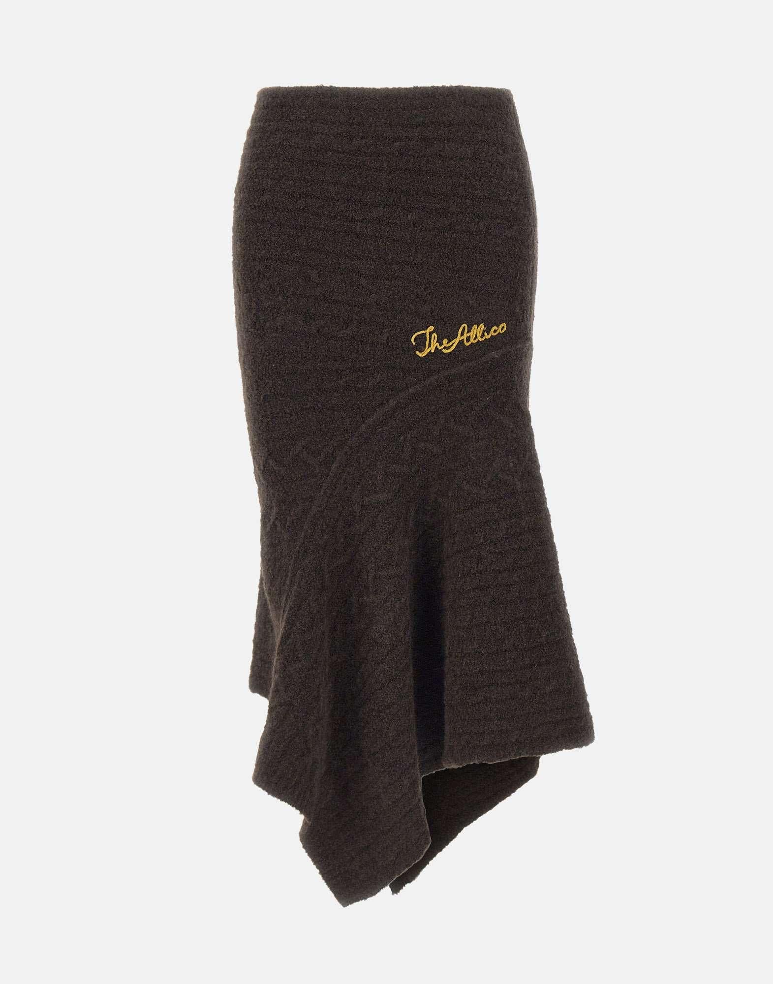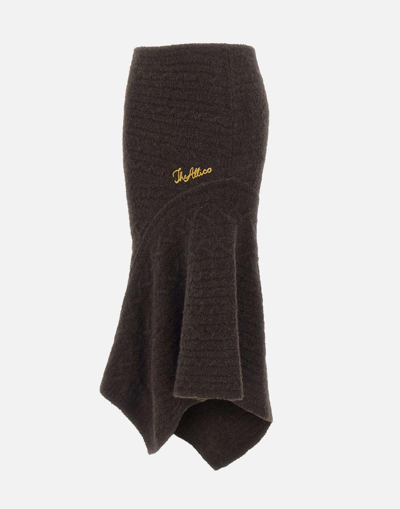 The Attico midi knit skirt, crafted from a brown wool blend with a cable knit, is perfect for a sophisticated and textured look. The asymmetrical design adds movement and character to the silhouette, while the mustard-colored embroidered logo on the front adds a distinctive detail. Made in Italy, it features a regular fit.