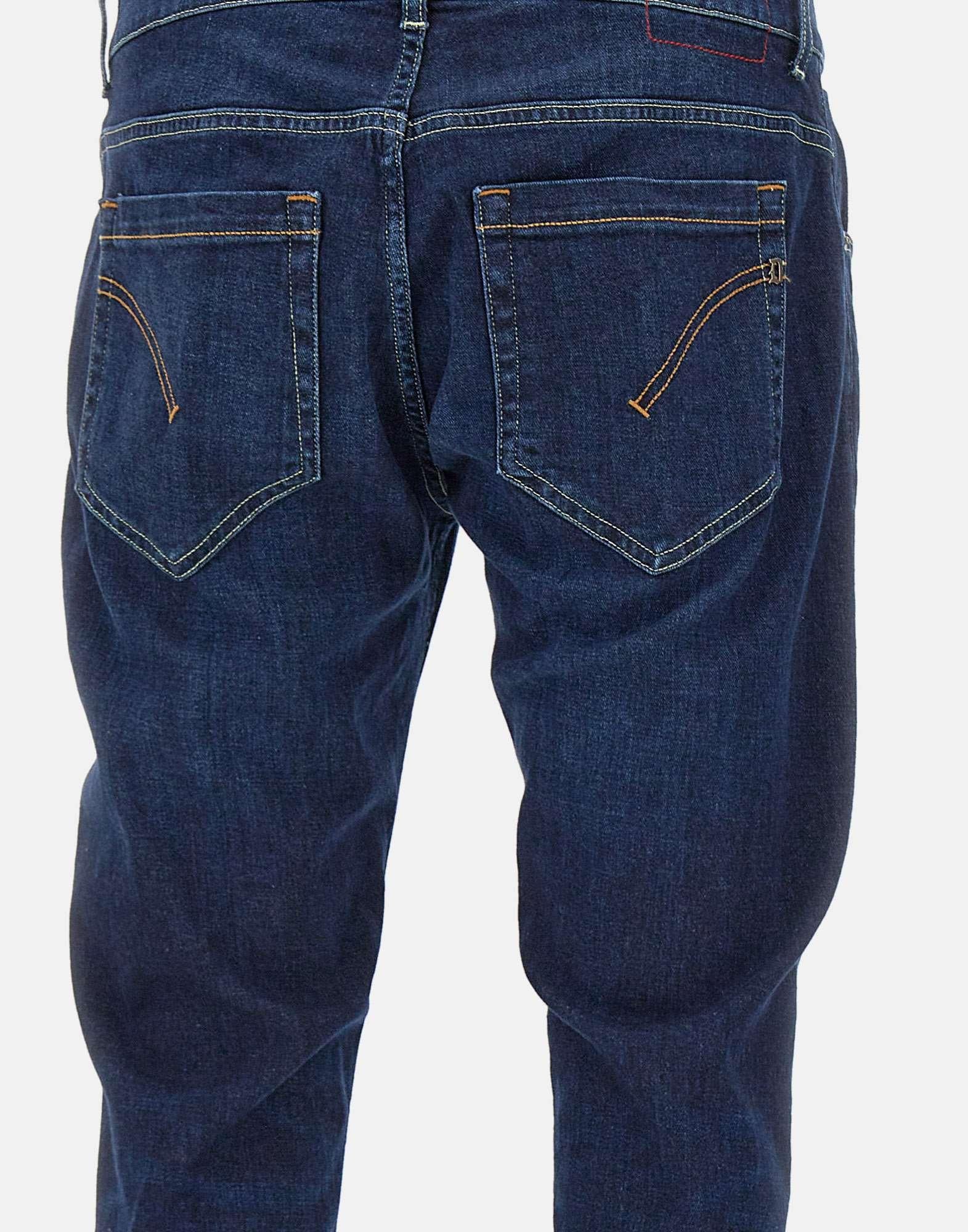 Dondup "George" men's cotton jeans, dark blue and contrasting yellow stitching, five pockets, closure with logoed buttons, waist with belt loops, straight leg, mini metal D logo on back, skinny fit, made in Italy