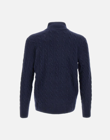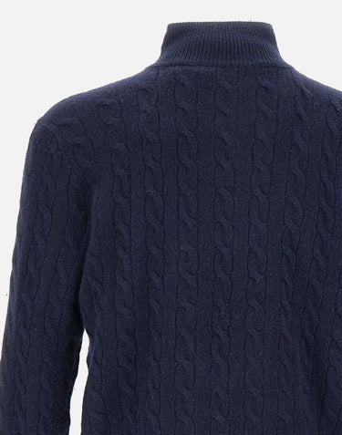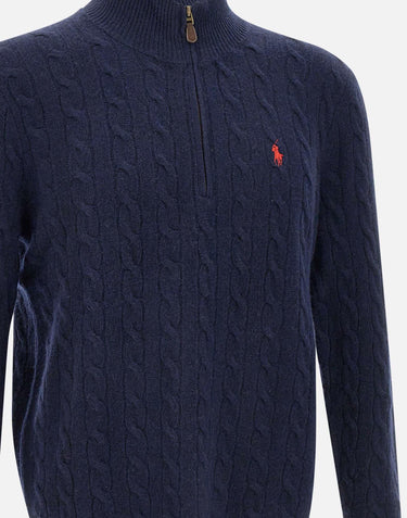 Polo Ralph Lauren "Classics" mens sweater in navy blue wool and cashmere. Features cable-knit design, stand-up collar with half-zip closure, long sleeves and ribbed trims. Embellished with the iconic red embroidered pony logo on the chest. Regular fit.