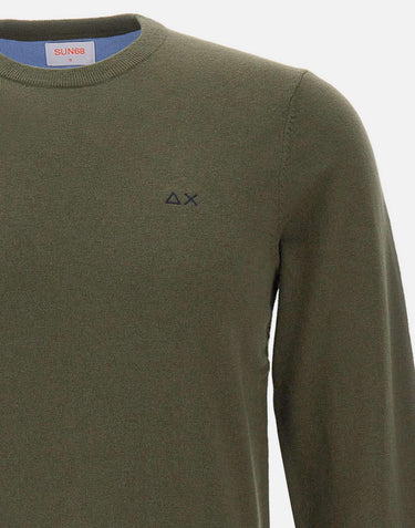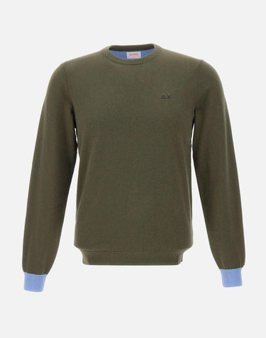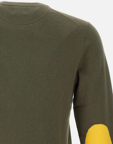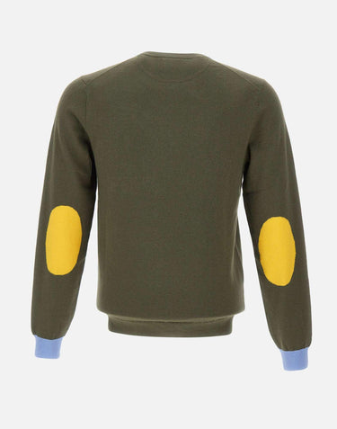 Sun68 men's wool and cotton sweater, green, long sleeves, crew neck, contrasting elbow patches and cuffs, logo on chest, ribbed cuffs, regular fit