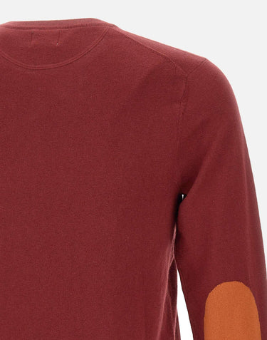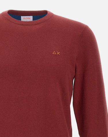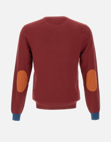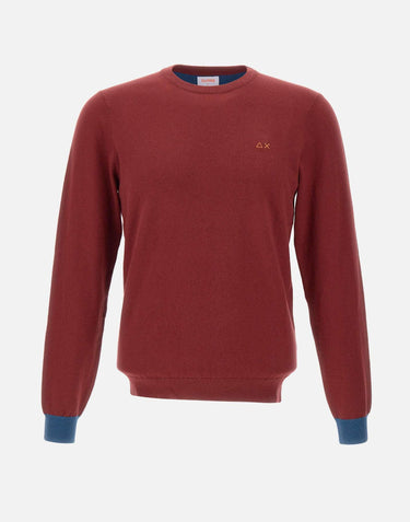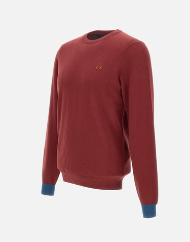 Sun68 men's wool and cotton sweater, burgundy, long sleeves, crew neck, contrasting elbow patches and cuffs, logo on chest, ribbed cuffs, regular fit