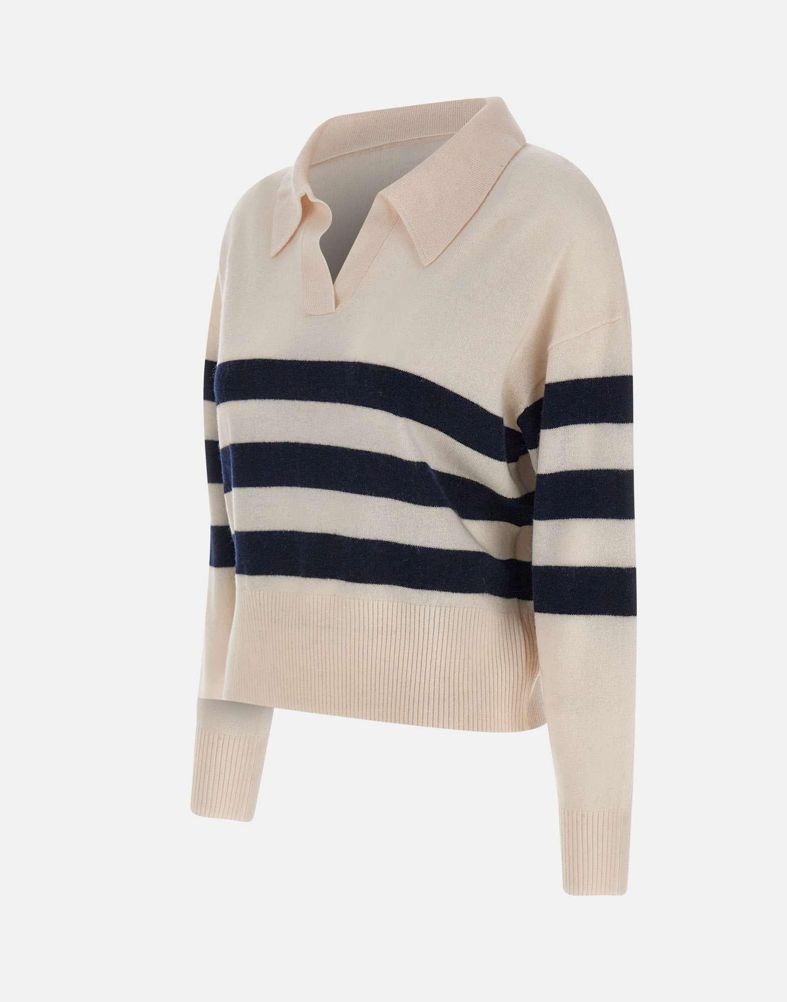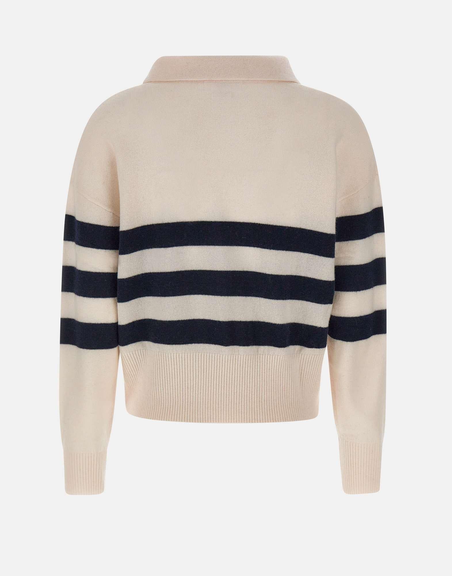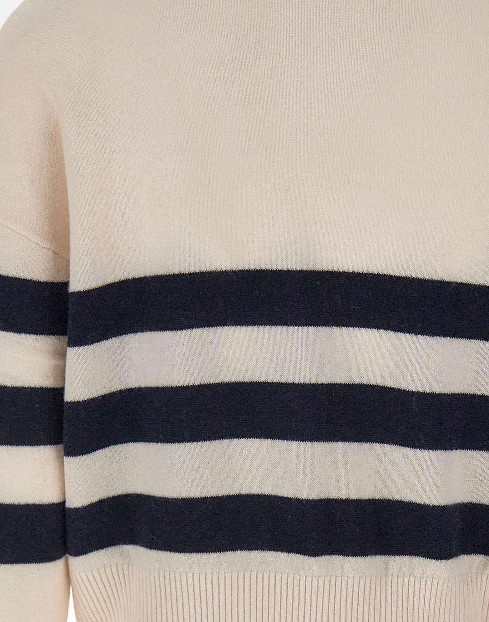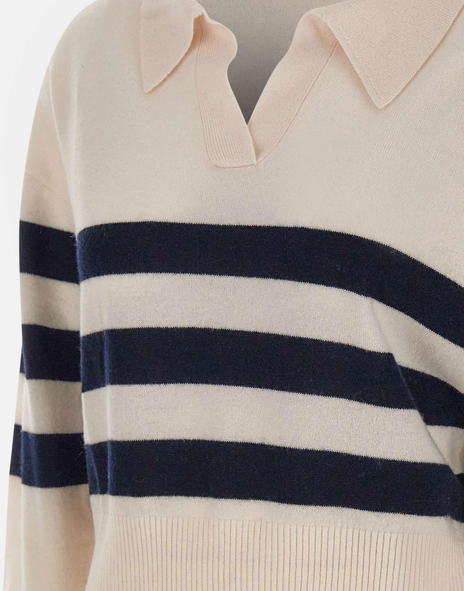 Not Shy Cashmere "Irina" women's jumper in white cashmere blend with navy horizontal stripes. Features a trucker collar, long sleeves, straight cut, and ribbed finishes on the cuffs and hem. A sporty yet refined piece, ideal for a casual chic wardrobe with a graphic twist.