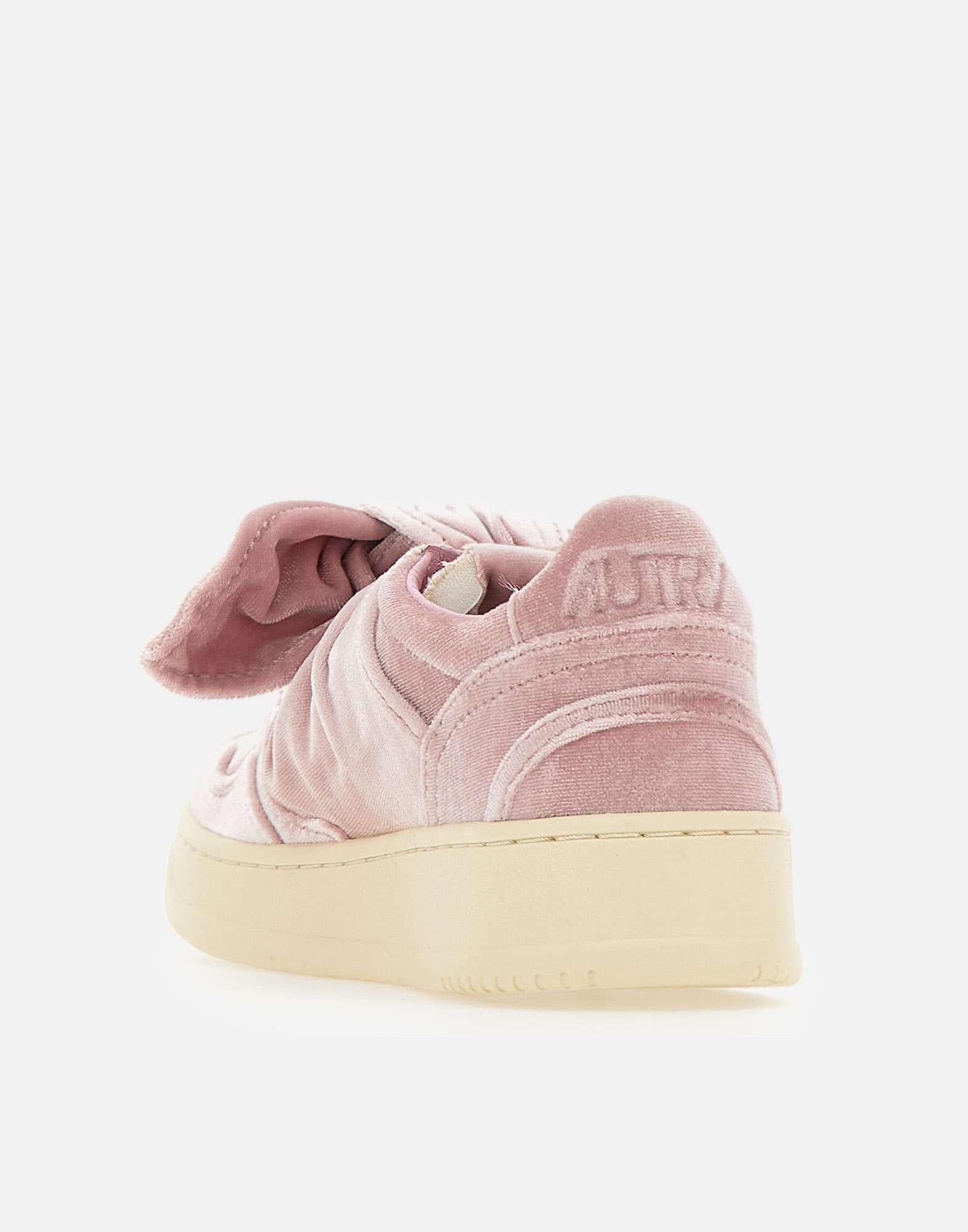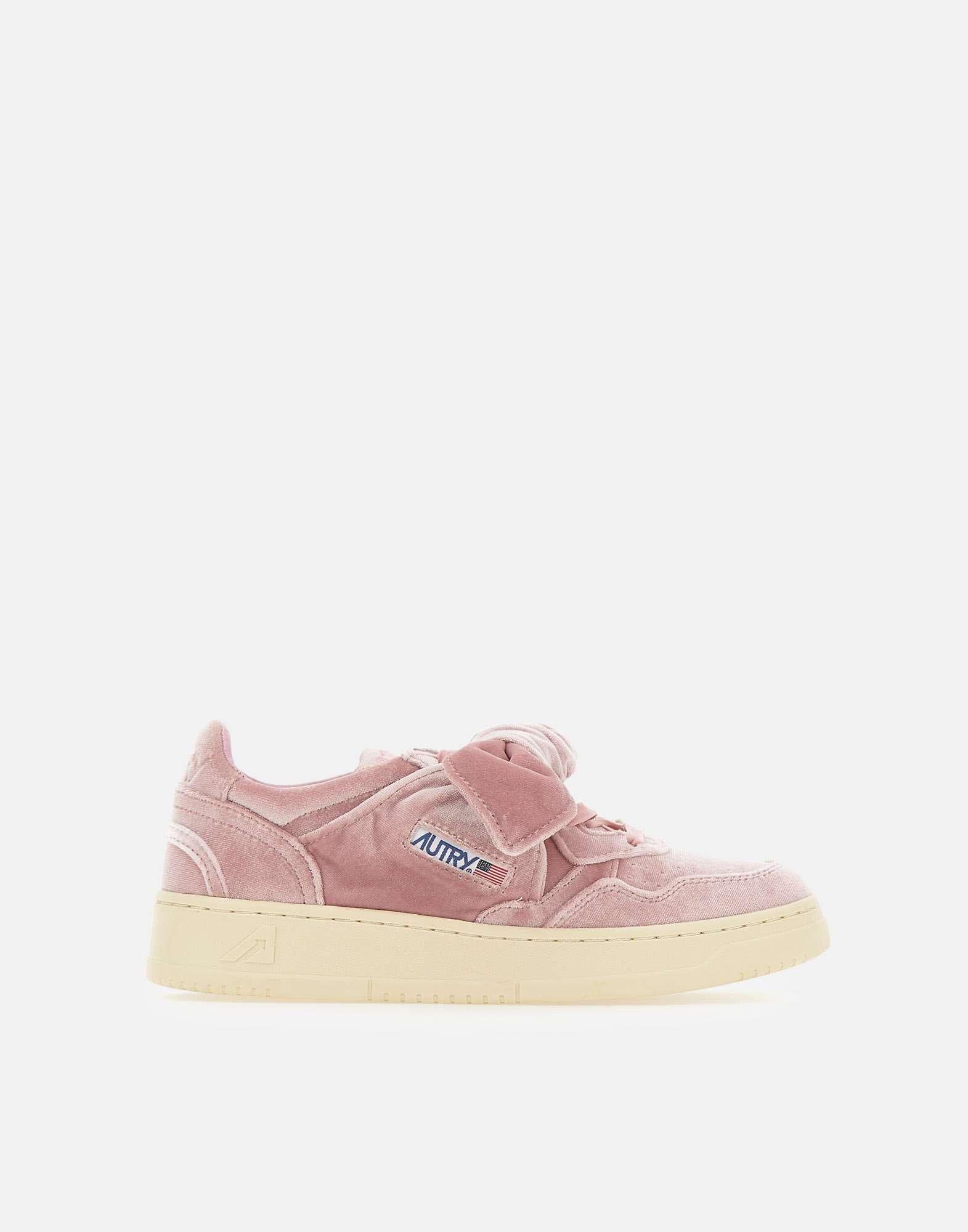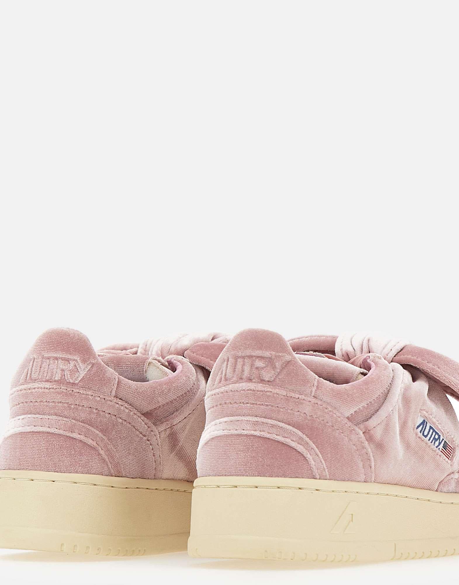 Women's Autry "Medalist Low Velvet Pink" sneakers from Bloom capsule collection, crafted in soft pink velvet for a refined touch. Featuring flat velvet laces, an embroidered label on tongue, jacquard logo, and a padded collar for enhanced comfort. The leather and cotton terry lining and 2 cm raised insole ensure a smooth, supportive fit. Finished with a rubber sole (height 2.5–3.5 cm). Regular fit, dust bag included.