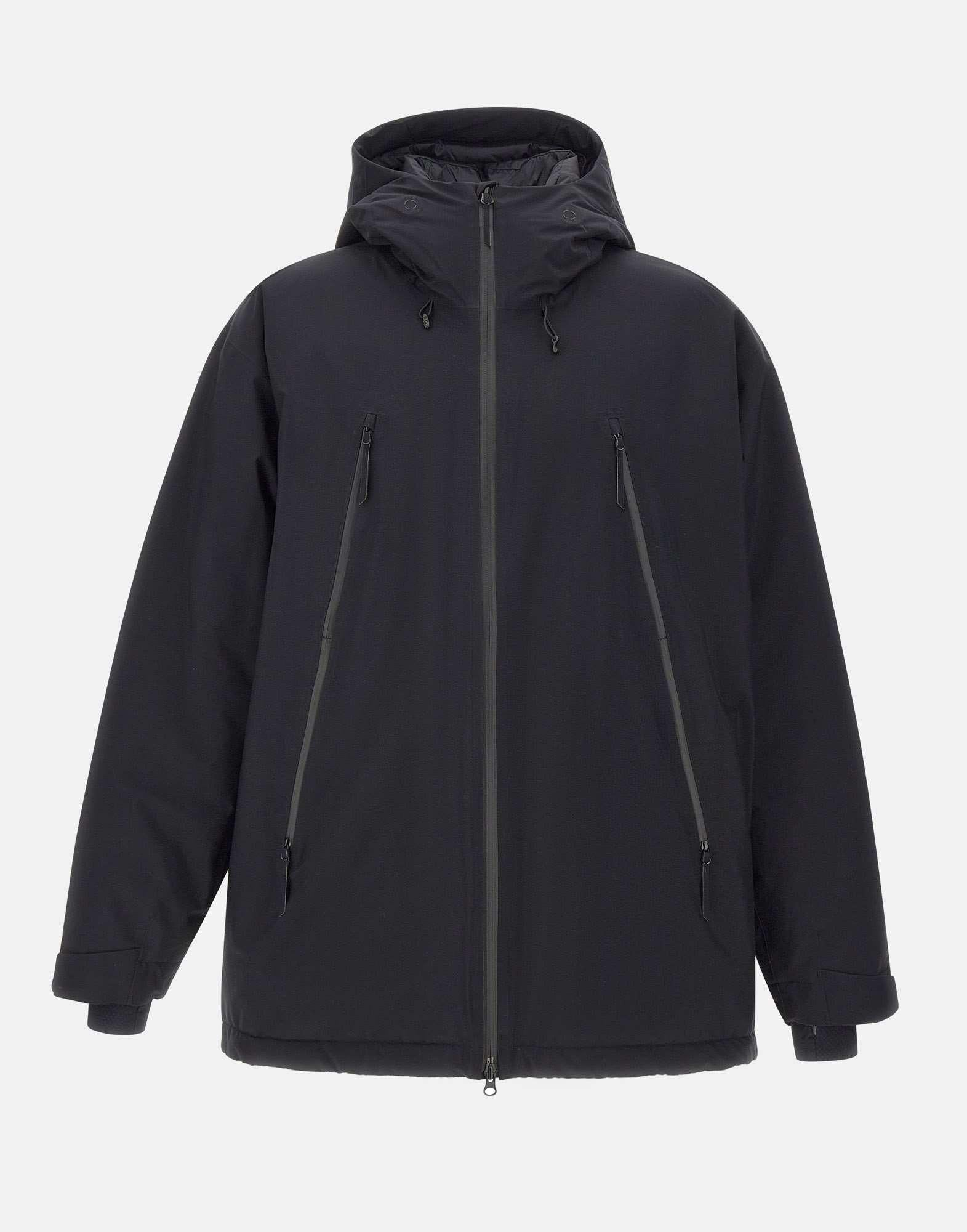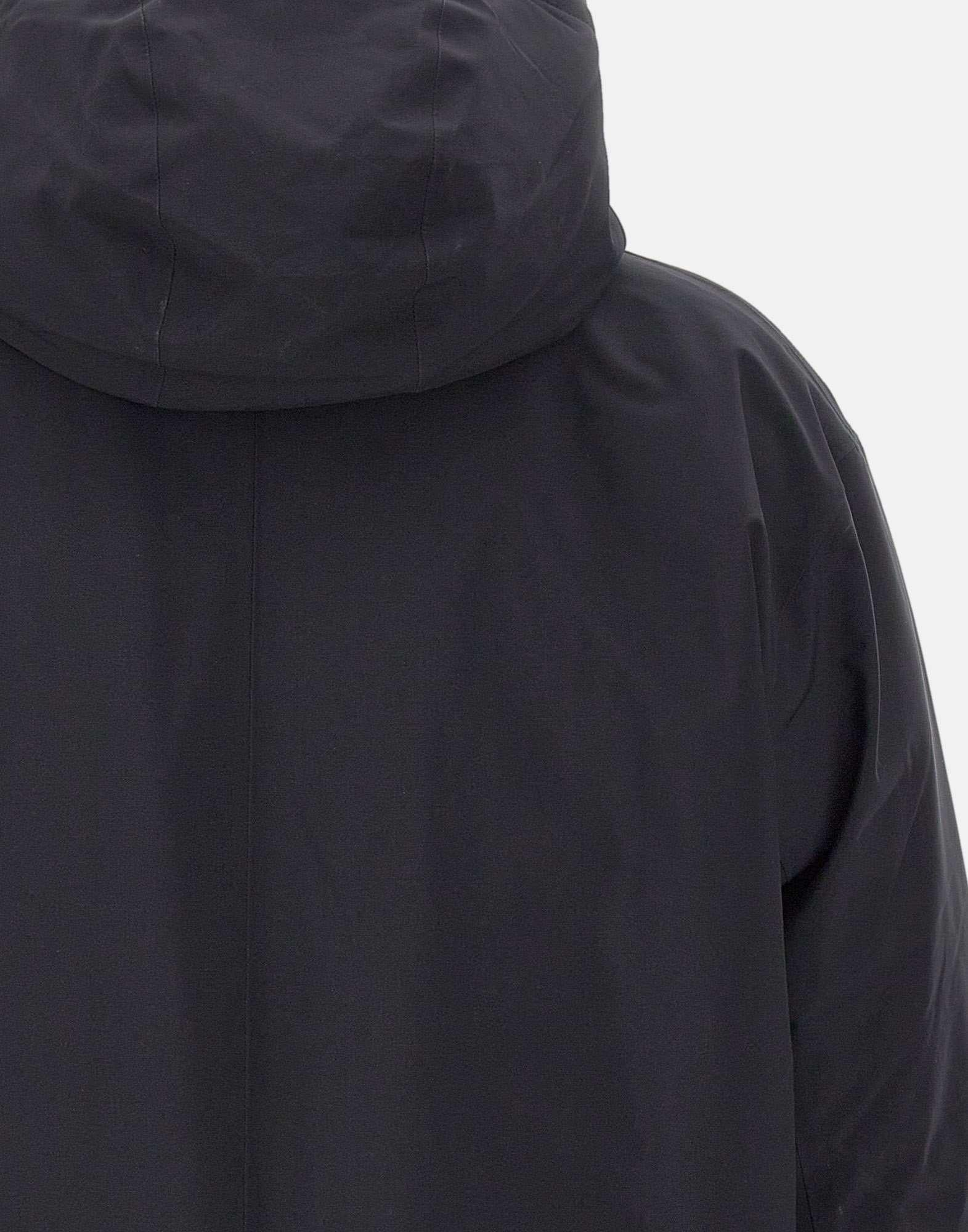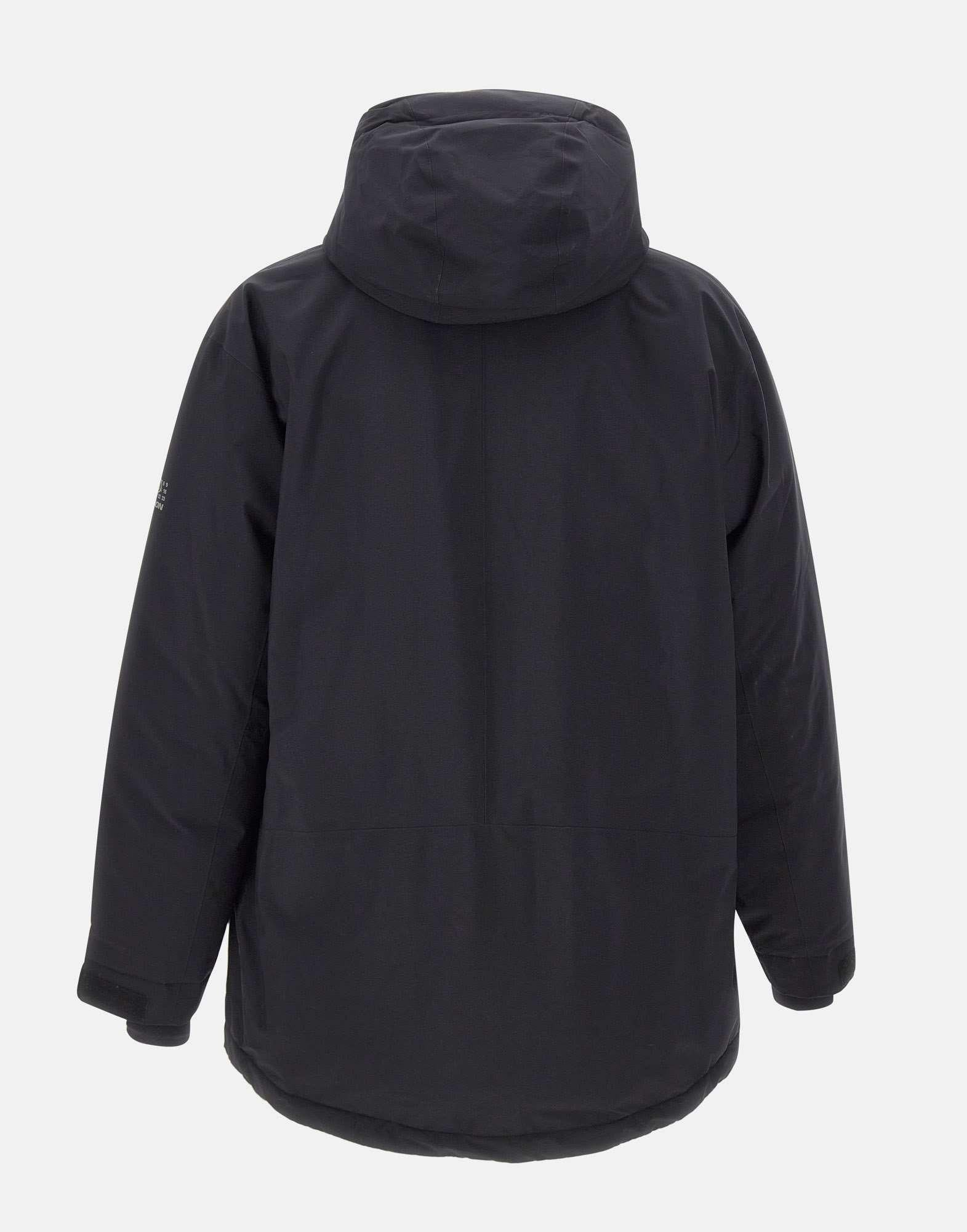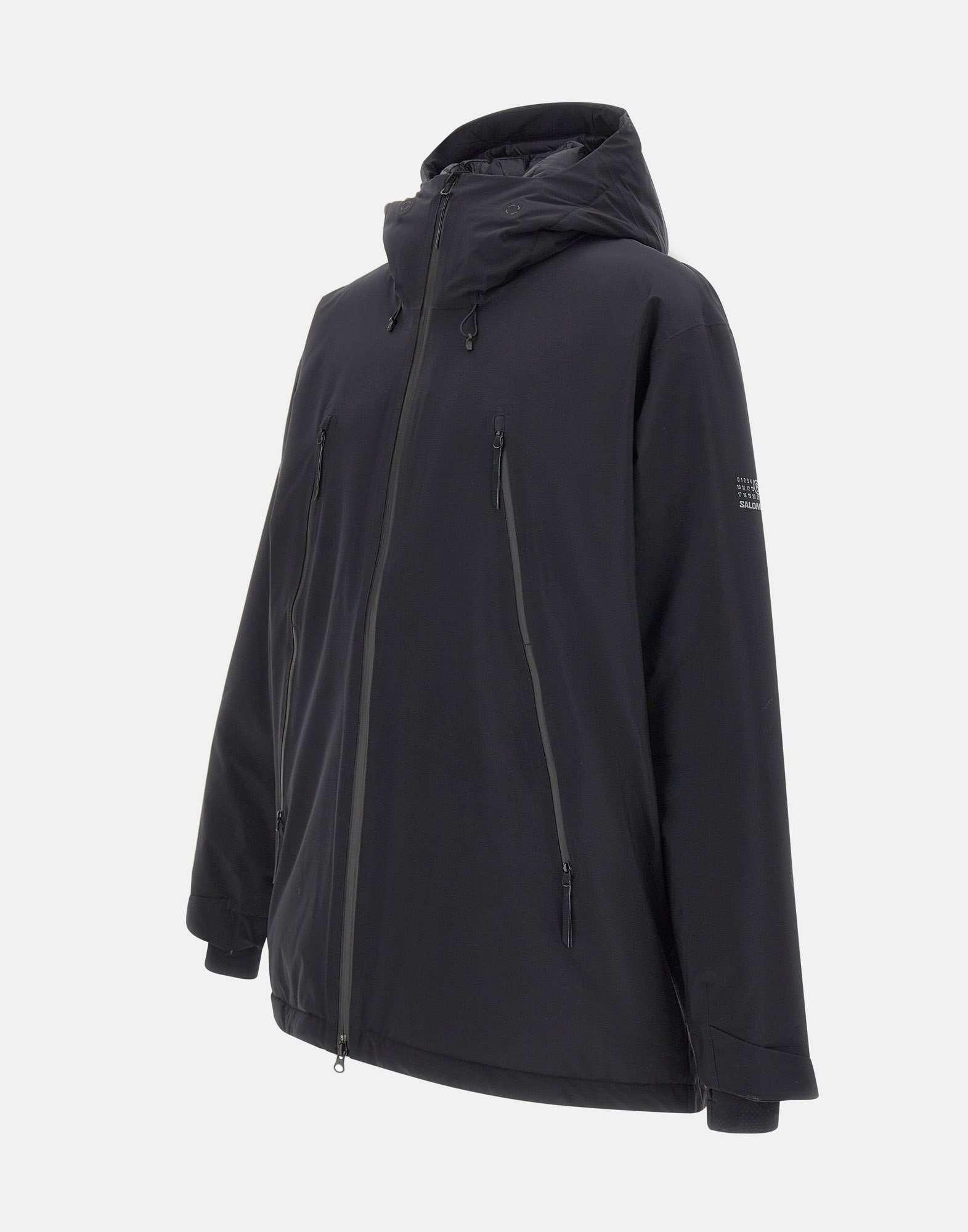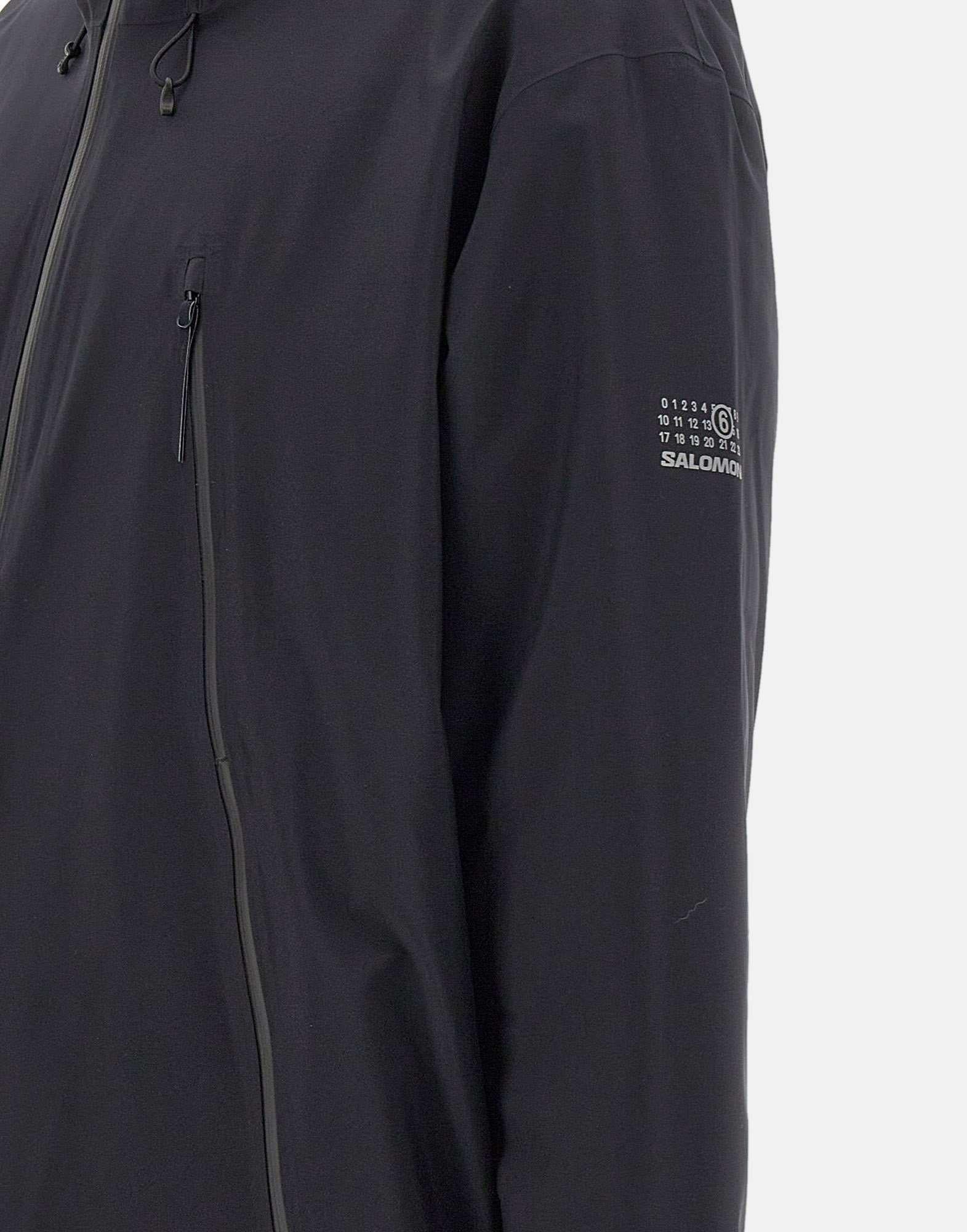 The MM6 Maison Margiela x Salomon parka, in black water-resistant and windproof nylon, fuses technical innovation with avant-garde design. Filled with down padding and horizontal quilting, it provides warmth and lightweight comfort. Features include a drawstring hood, taped seams, and a two-way front zip for enhanced functionality. Four zipped front pockets, adjustable Velcro cuffs, and a drawstring hem ensure a customized fit. Finished with MM6 x Salomon label on left sleeve and the Maison’s signature white stitches on back. Relaxed fit.