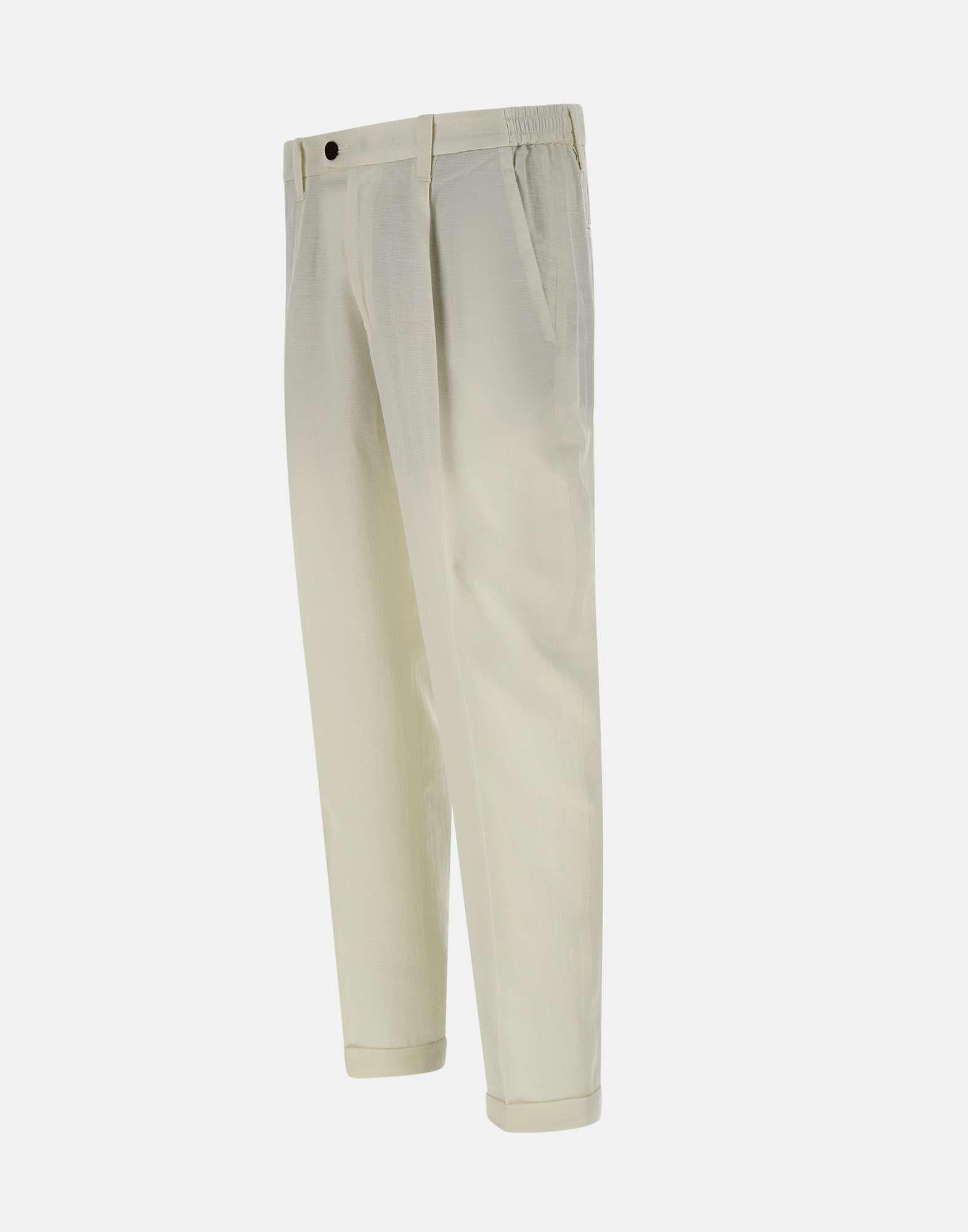 Men's Devore Incipit "Dvr47" trousers, white milk, linen and tencel, extra soft and luxurious fabric to touch and wear, single front dart, side French pockets, single back pockets, waistband with belt loops and elastic insert, zip and button fastening, straight leg with 18cm hem and 3cm turn-up, slim fit, made in Italy