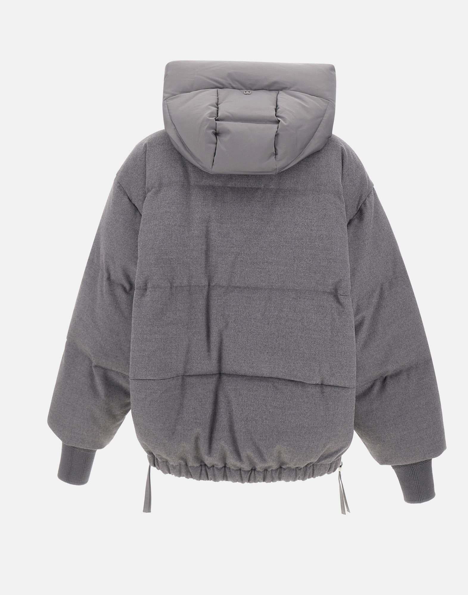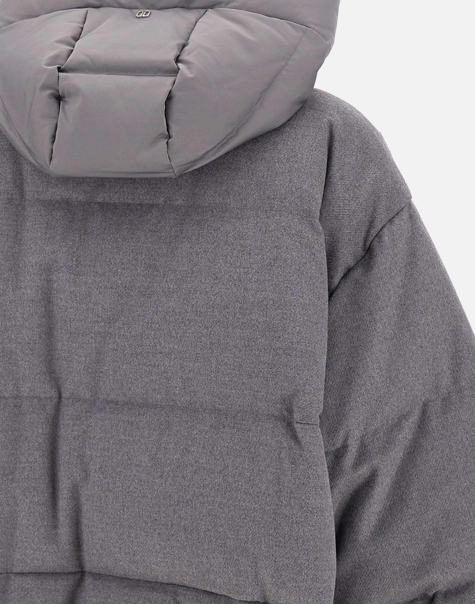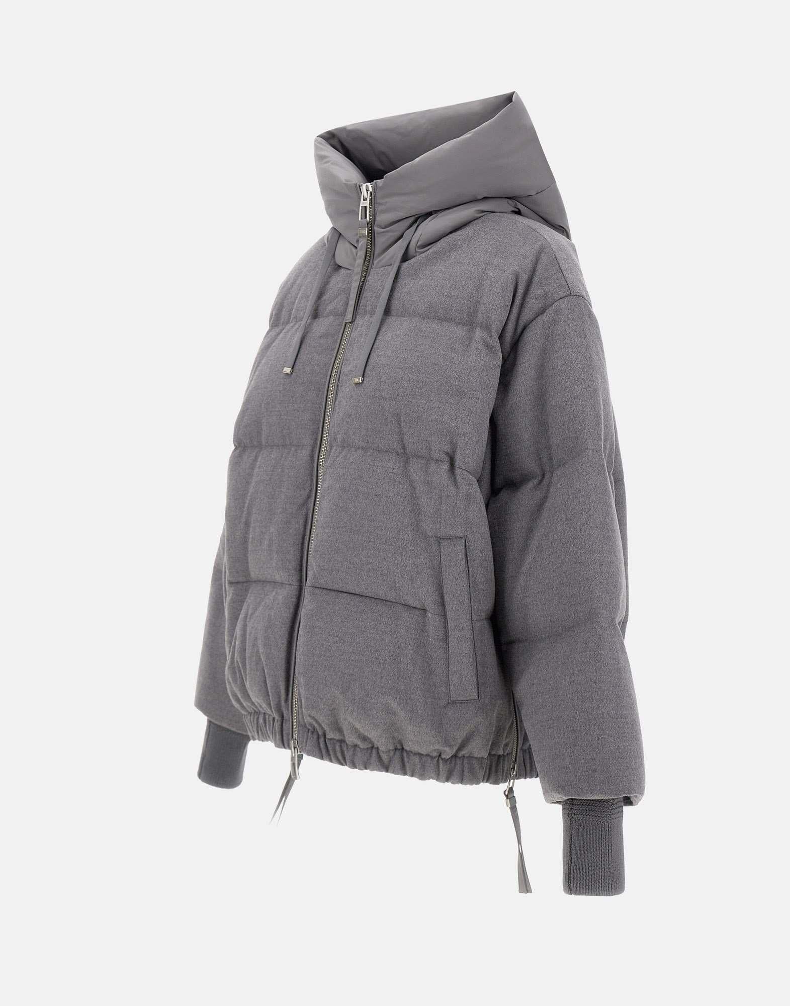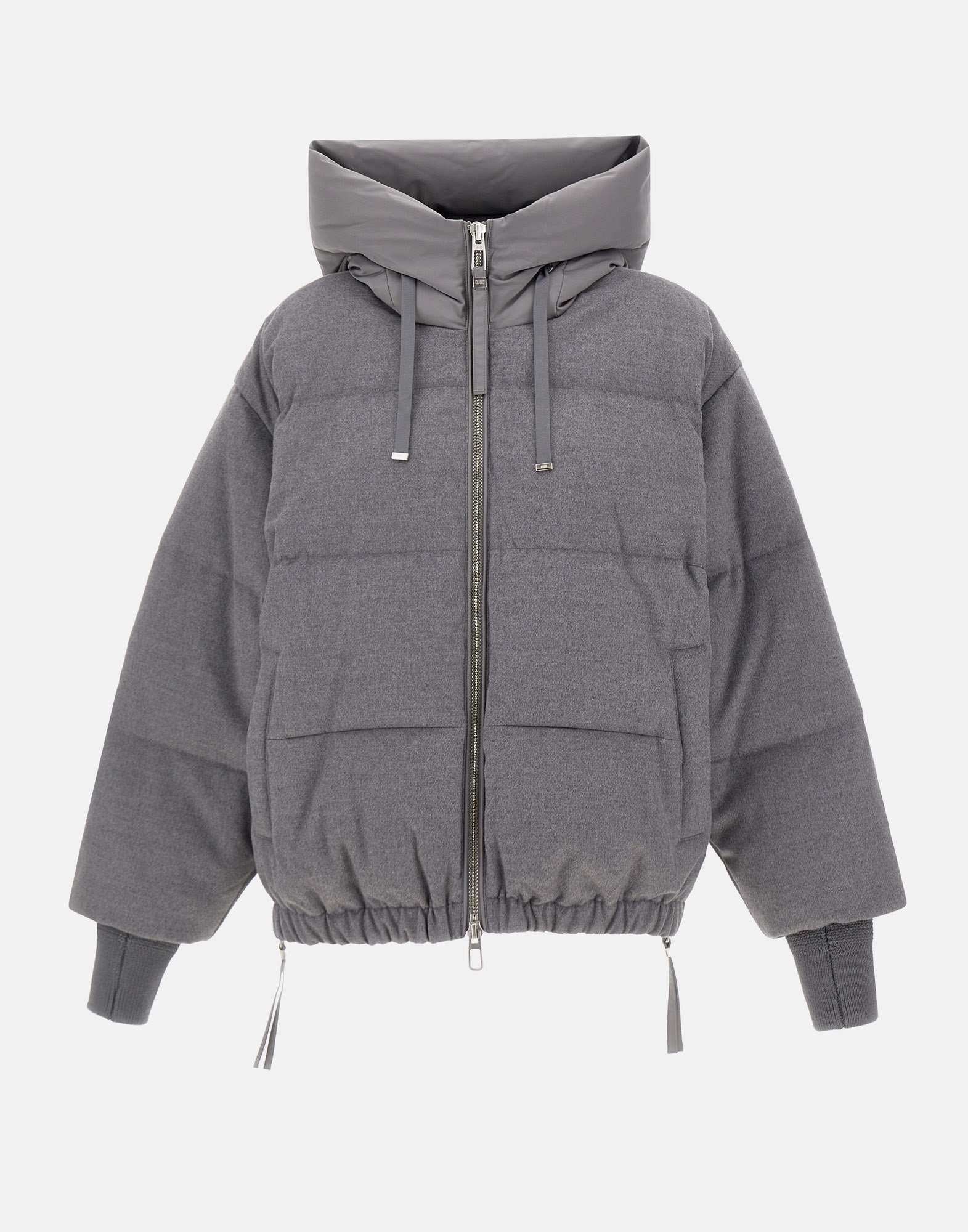 Duno "Heka Prato" women's wool down jacket, grey, technical satin hood with adjustable drawstring, logoed double zip closure, knitted cuffs with thumb loop, elasticated hem, side pockets with button, side vents with zip, oversized fit .
