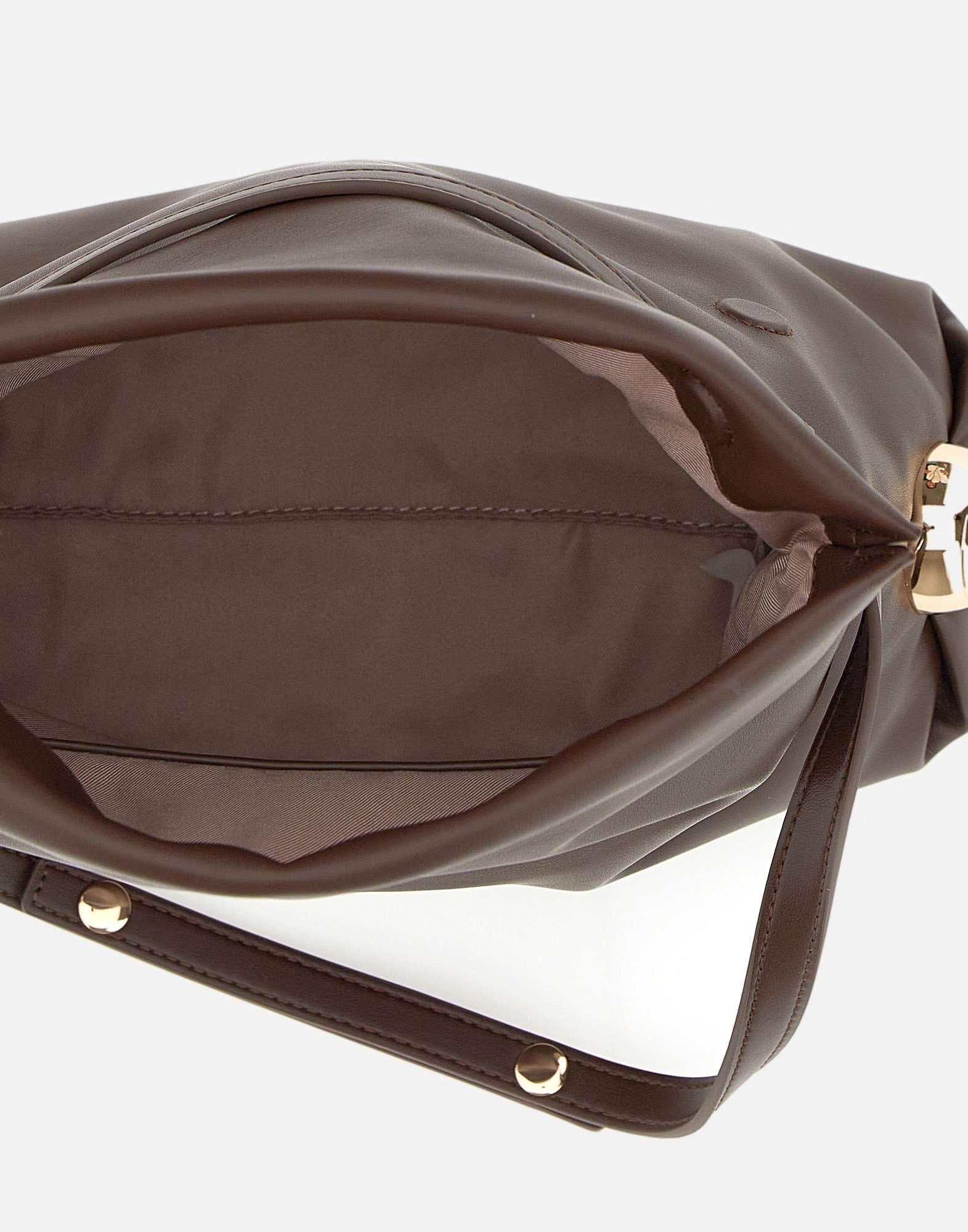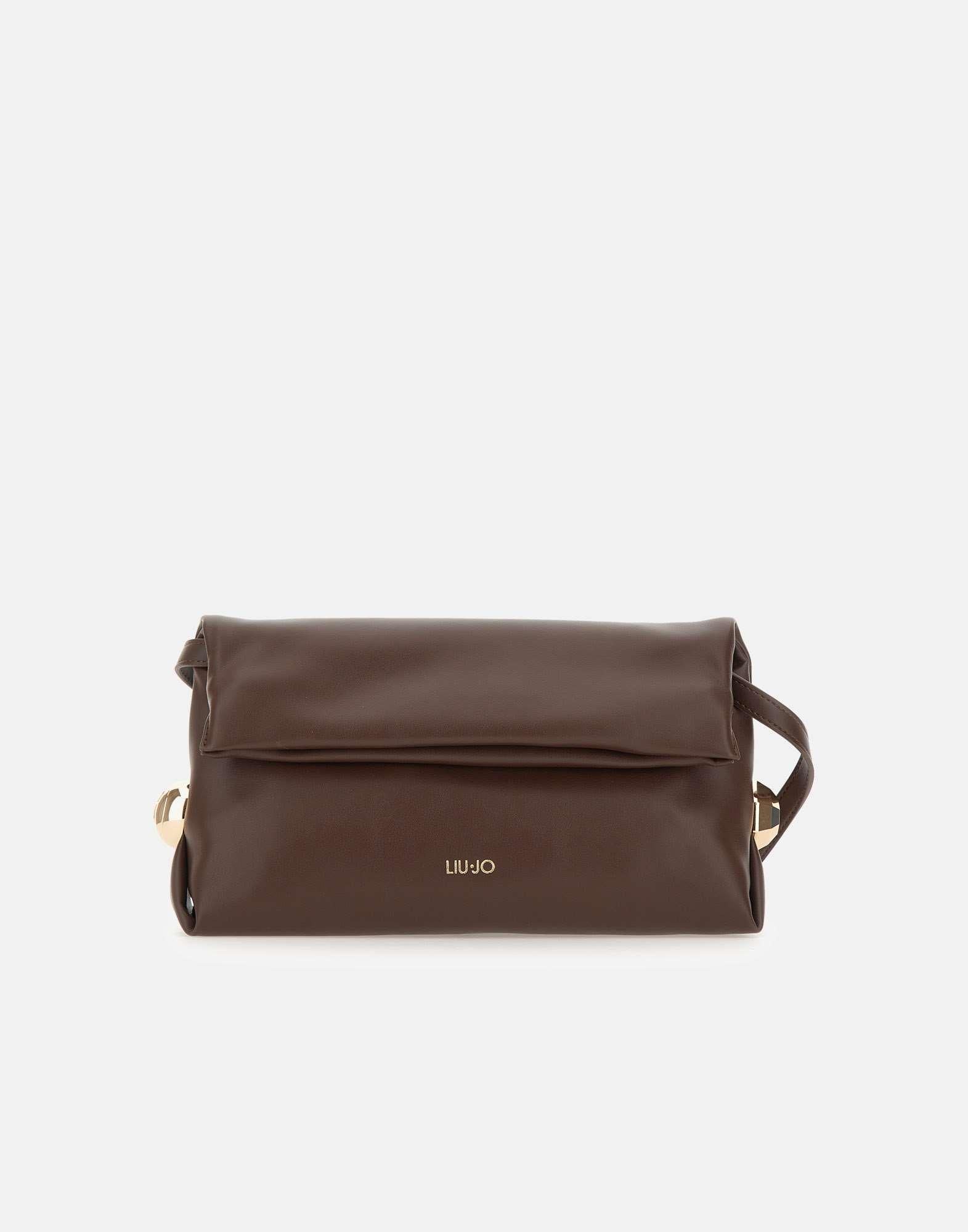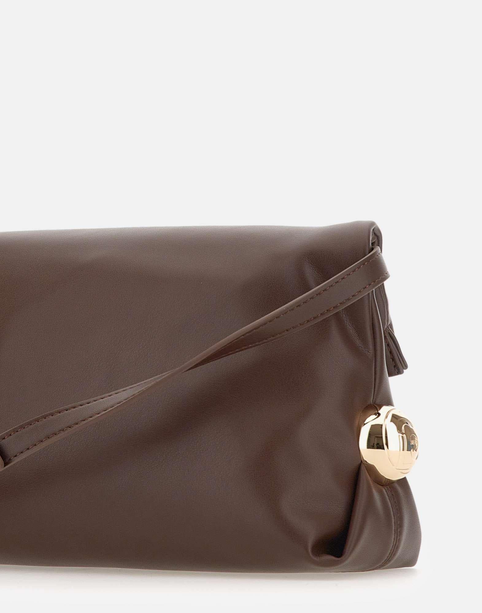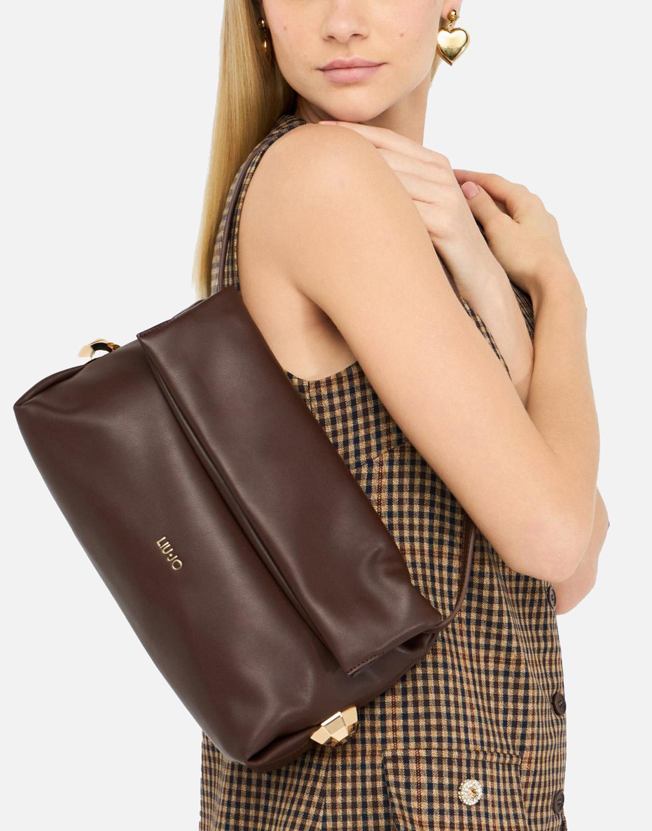Liu-Jo "Riccy" bag, chocolate brown, made of high-quality synthetic leather-like material, part of sustainable Liu Jo Better line. The soft structure with a folded flap and magnetic buttons is embellished with a gold-tone metal logo on front and gold-tone side details for a sophisticated touch. It features a removable shoulder strap, an internal pocket, and a dust bag. Dimensions: 31 x 11 x 18 cm.