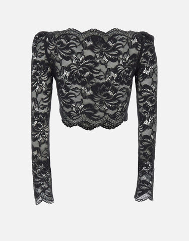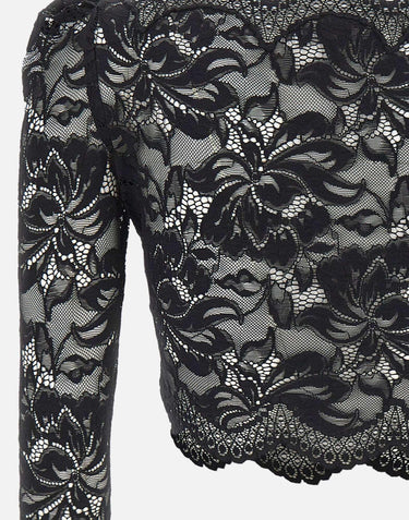 "Short Top", black, stretch lace, long sleeves, wide neckline, double-layer fabric, scalloped hem, slightly cropped cut, regular fit