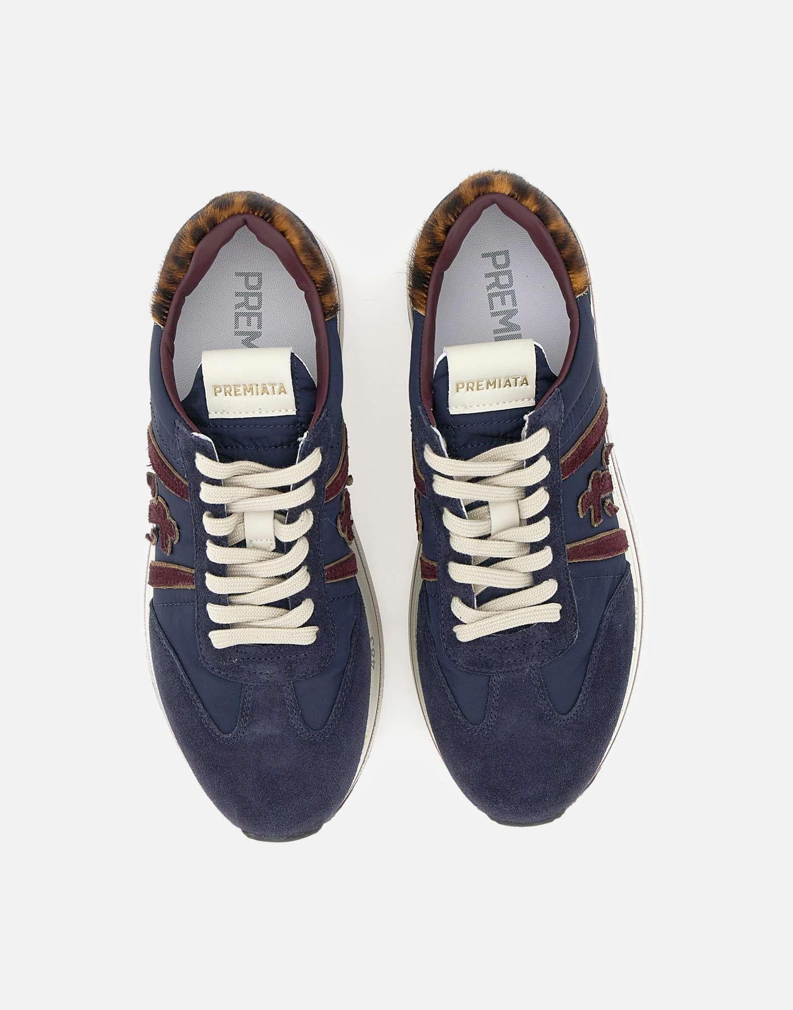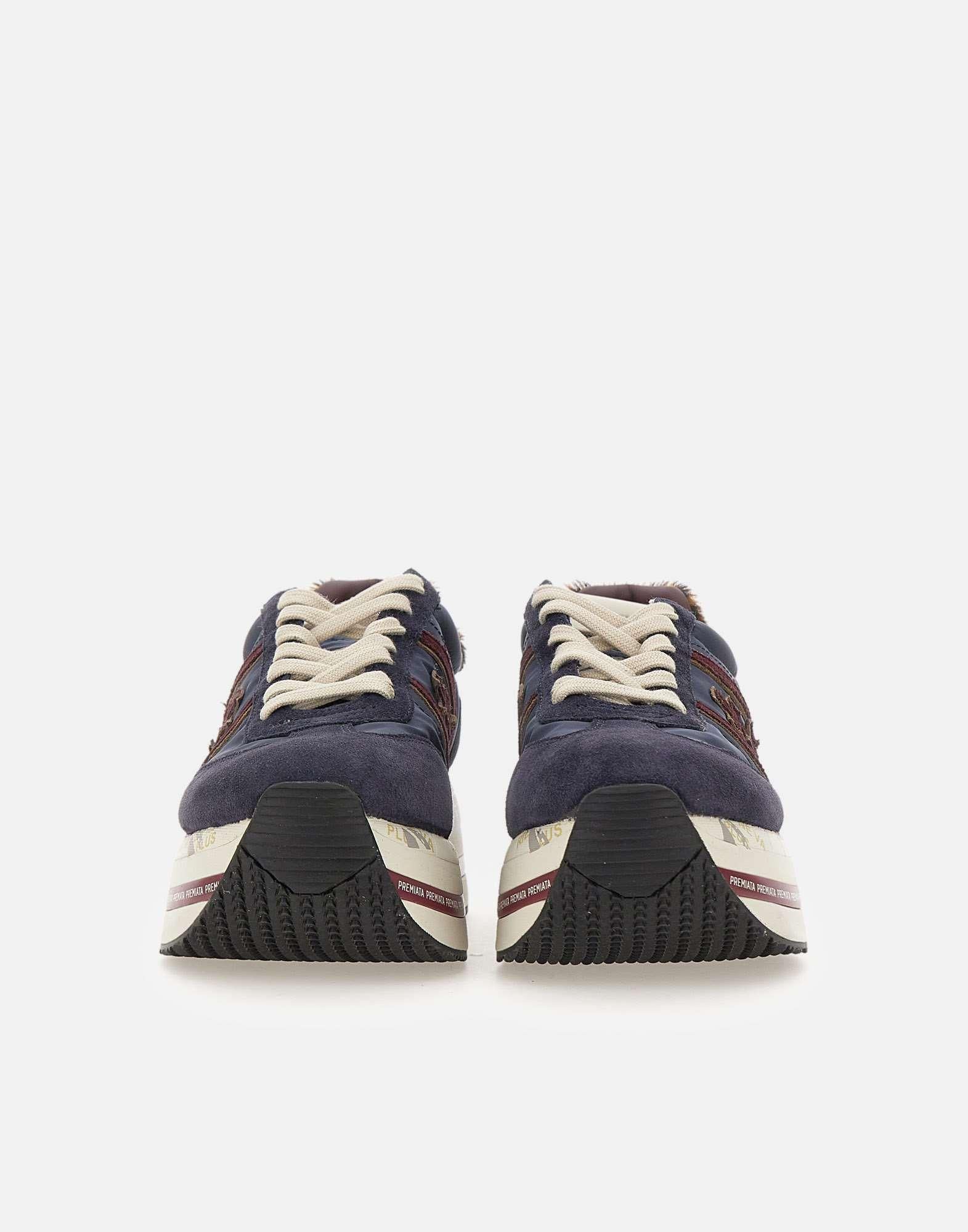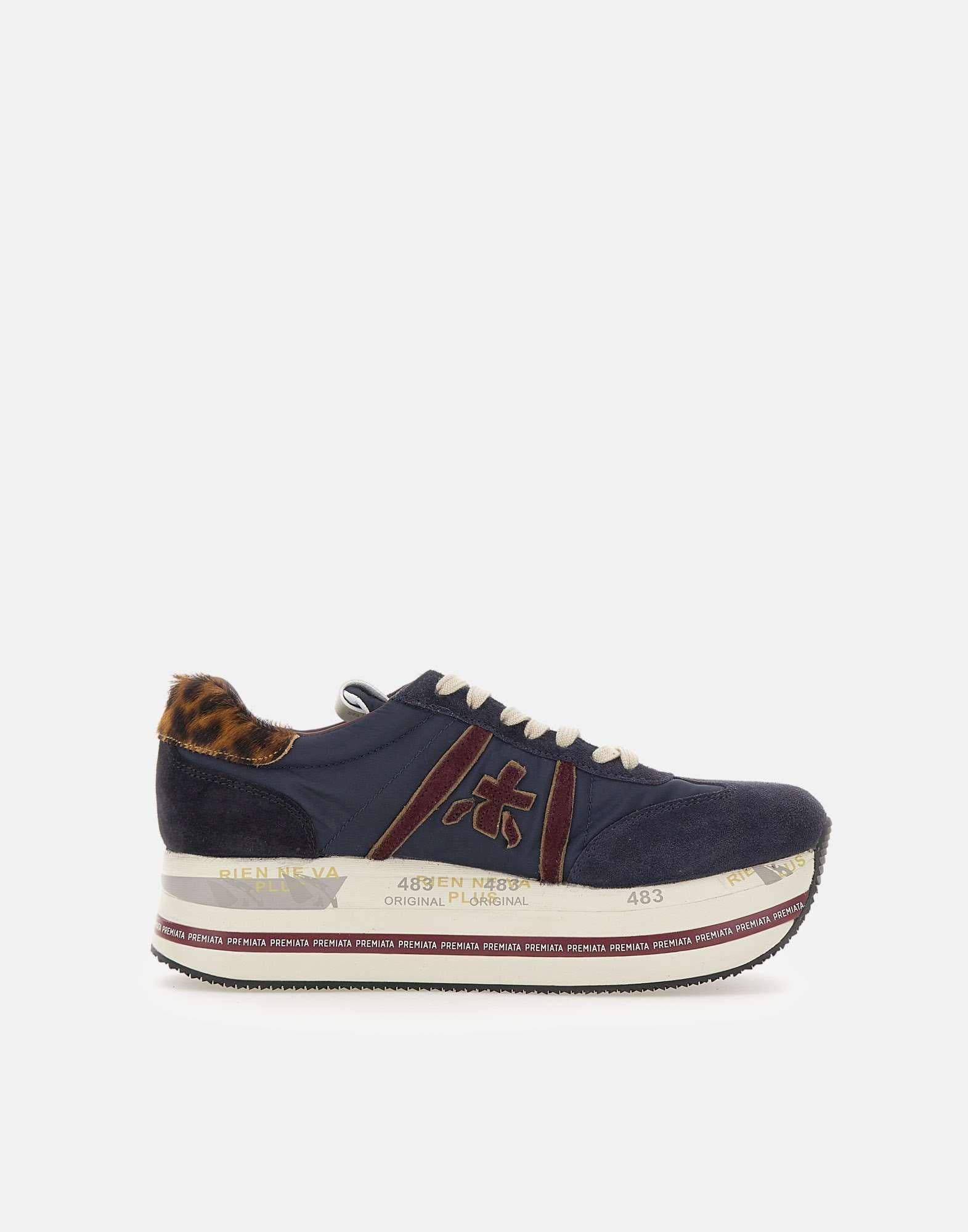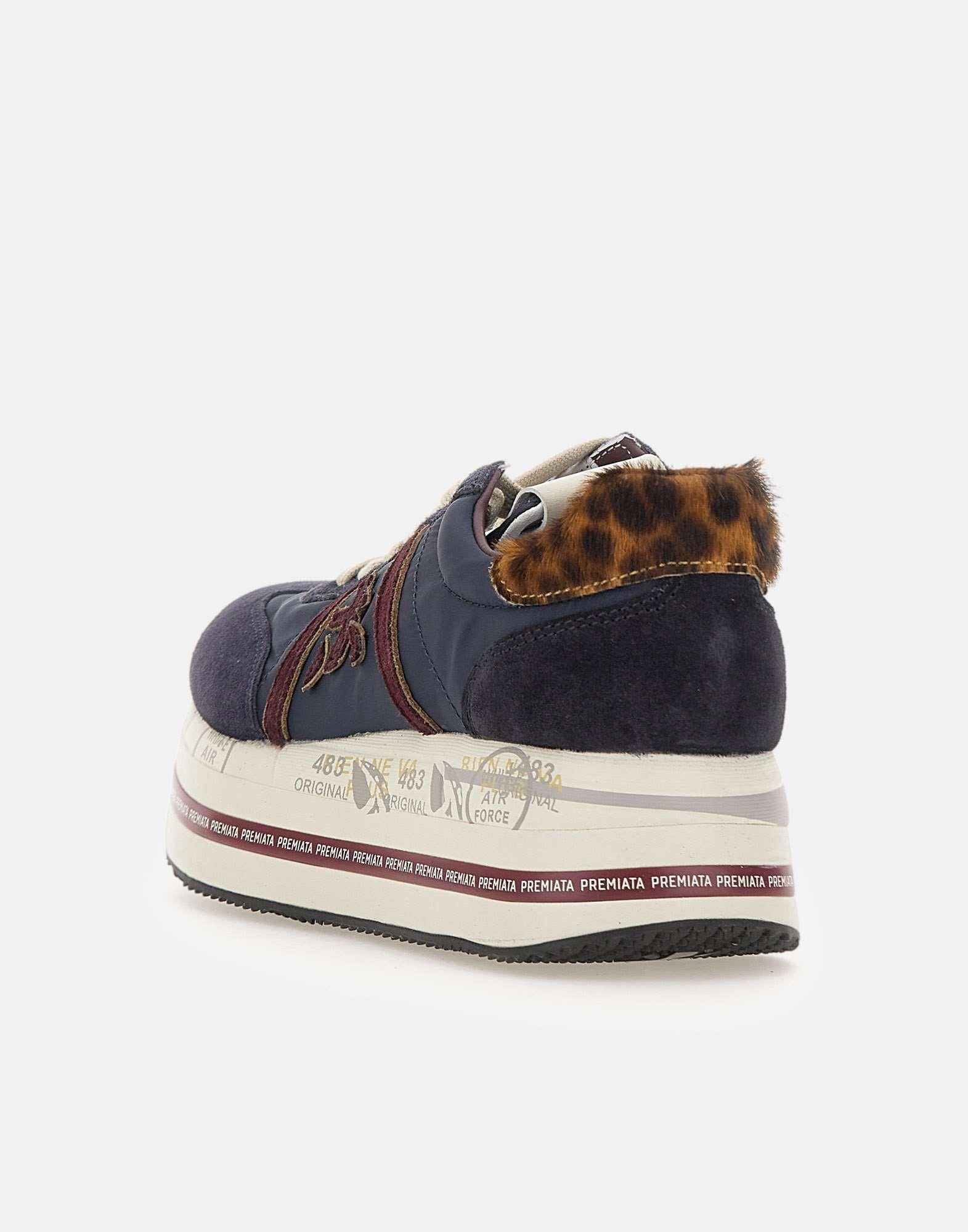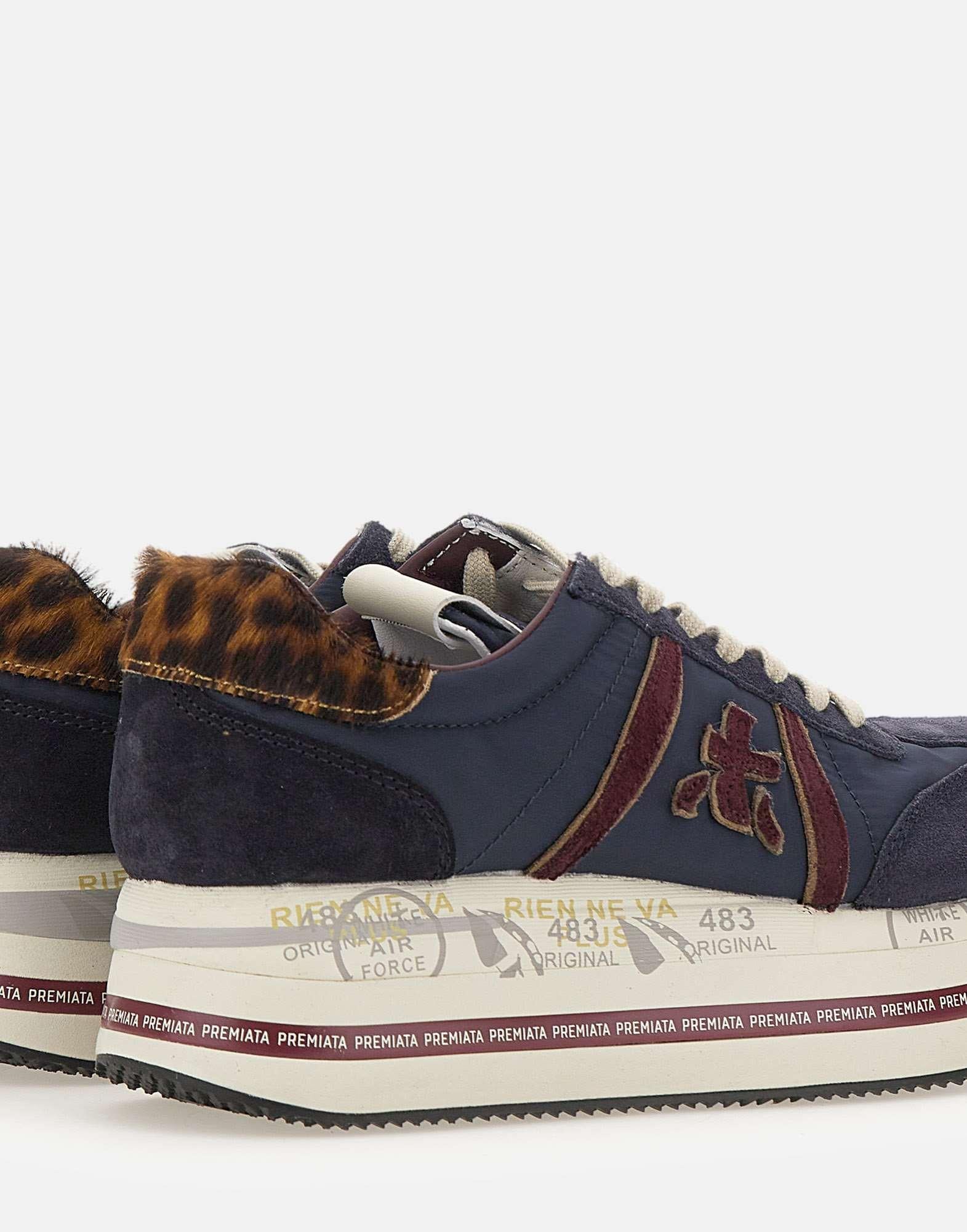 Premiata "Beth7743" women's sneakers interpret contemporary style with a bold personality. The blue suede and nylon upper, enriched with contrasting details and an animal-print ponyskin heel tab, lends elegance and versatility. Flat cotton laces and a logo on the tongue enhance the design. The round toe and 4.5 cm EVA platform sole with Premiata screen printing ensure comfort and momentum. Regular fit.