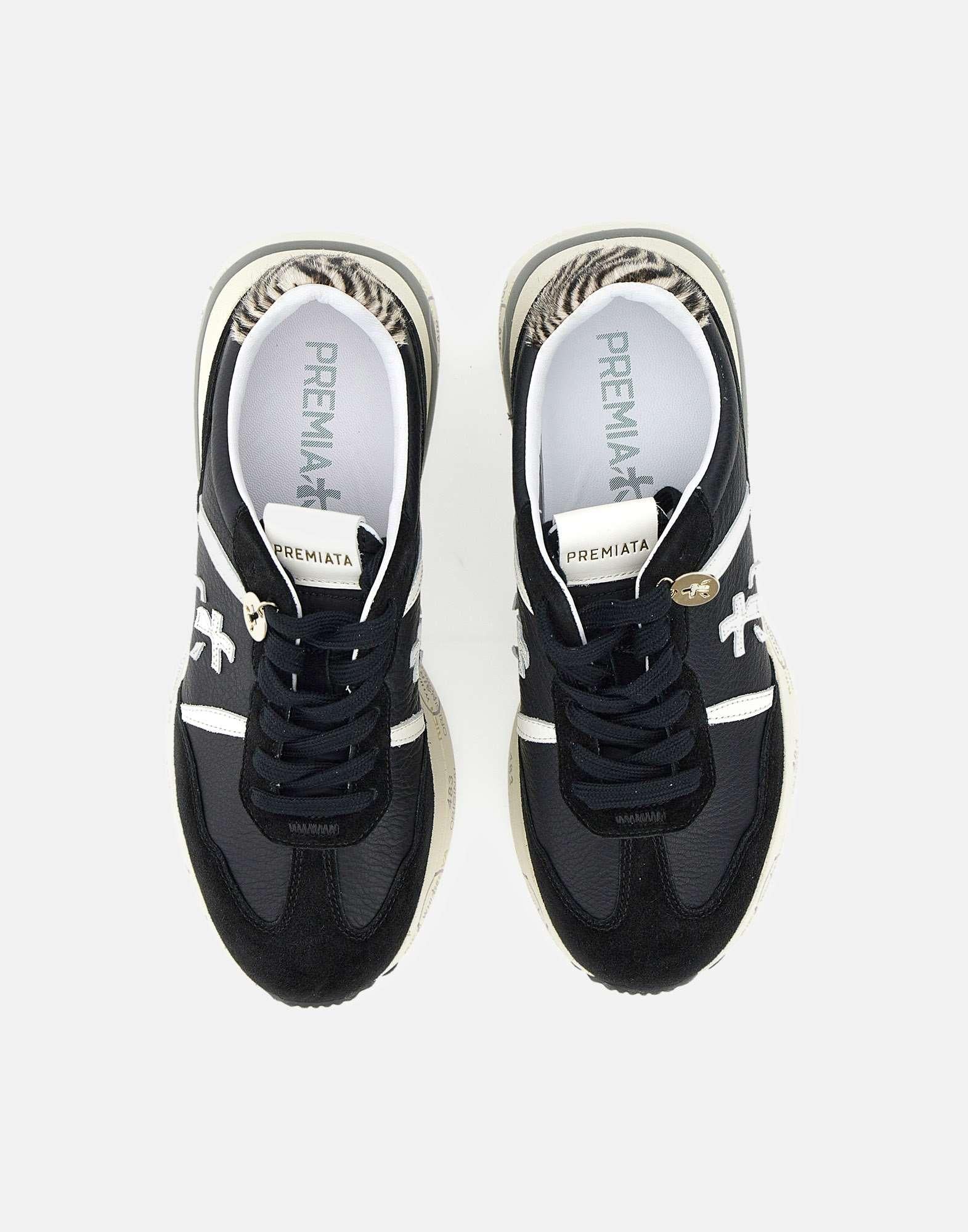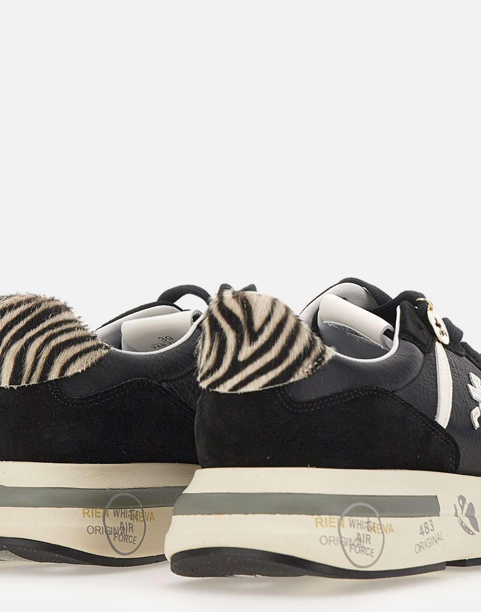 Premiata "Cassie" women's sneakers add a sophisticated and original touch to your casual wardrobe. The suede and leather upper in black and white pairs with a zebra-print ponyskin heel tab for a distinctive design. Featuring a soft leather lining, a rounded toe, and flat laces, they offer comfort and everyday style. Side logos. The 4.2 cm rubber platform sole with Premiata screen printing ensures stability and character. Regular fit.