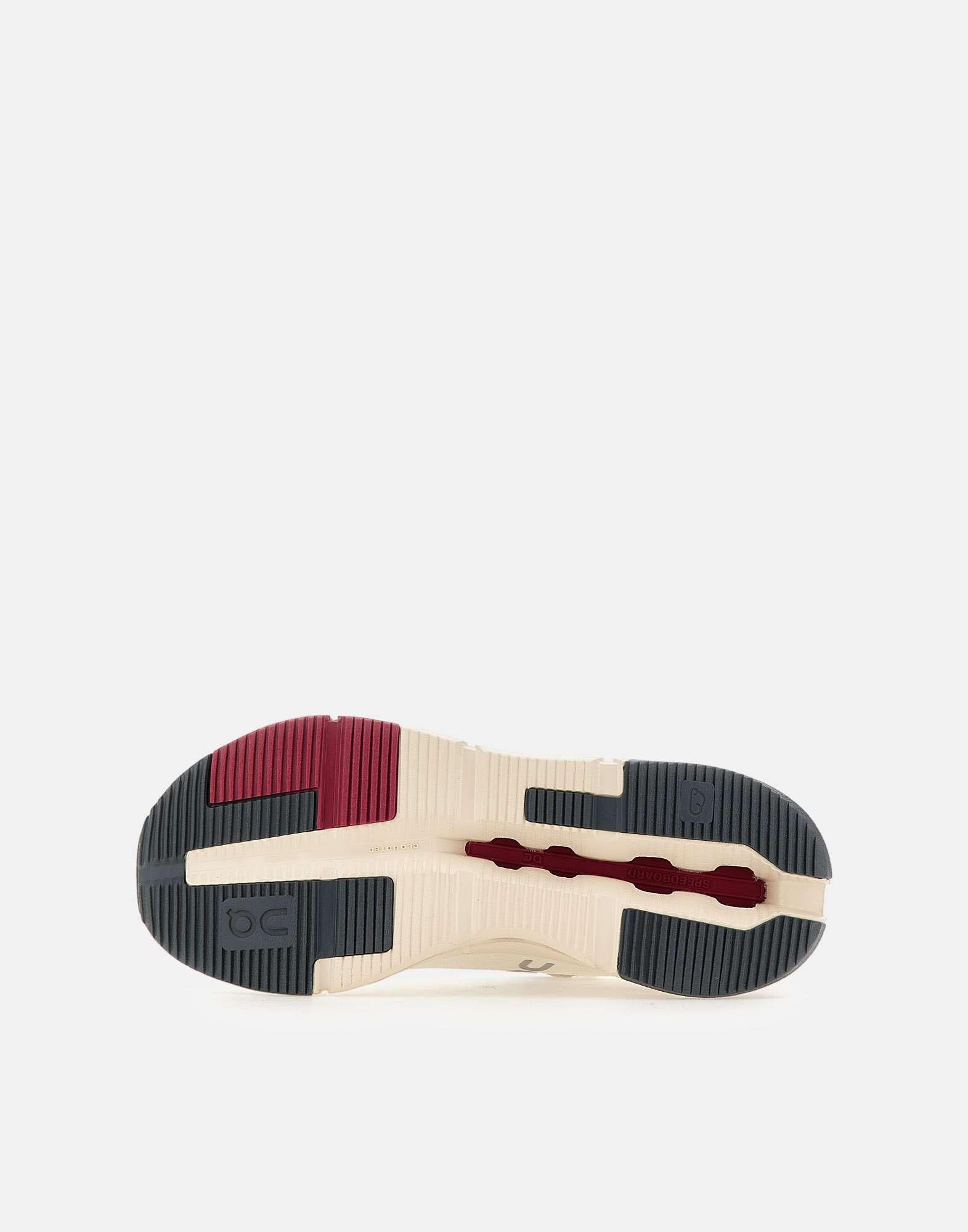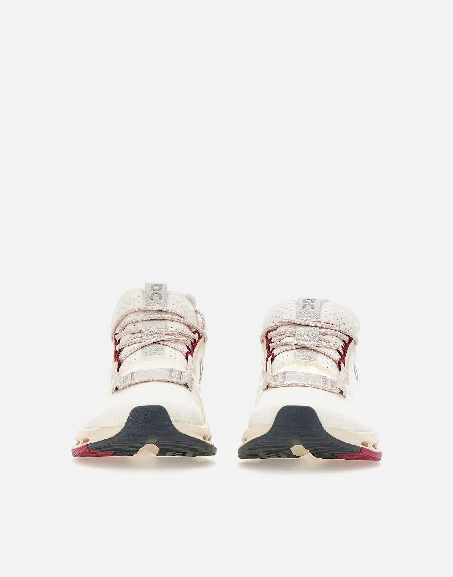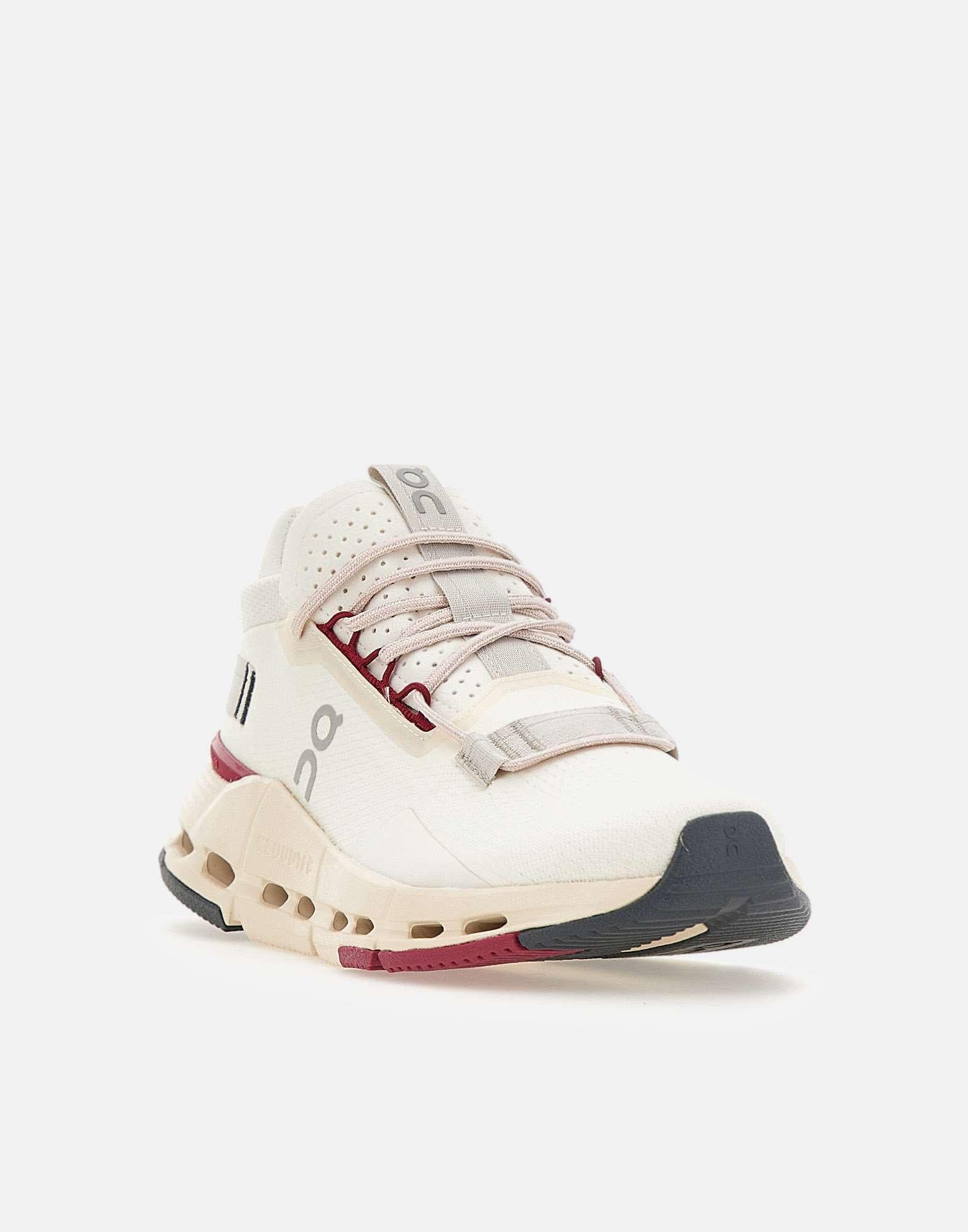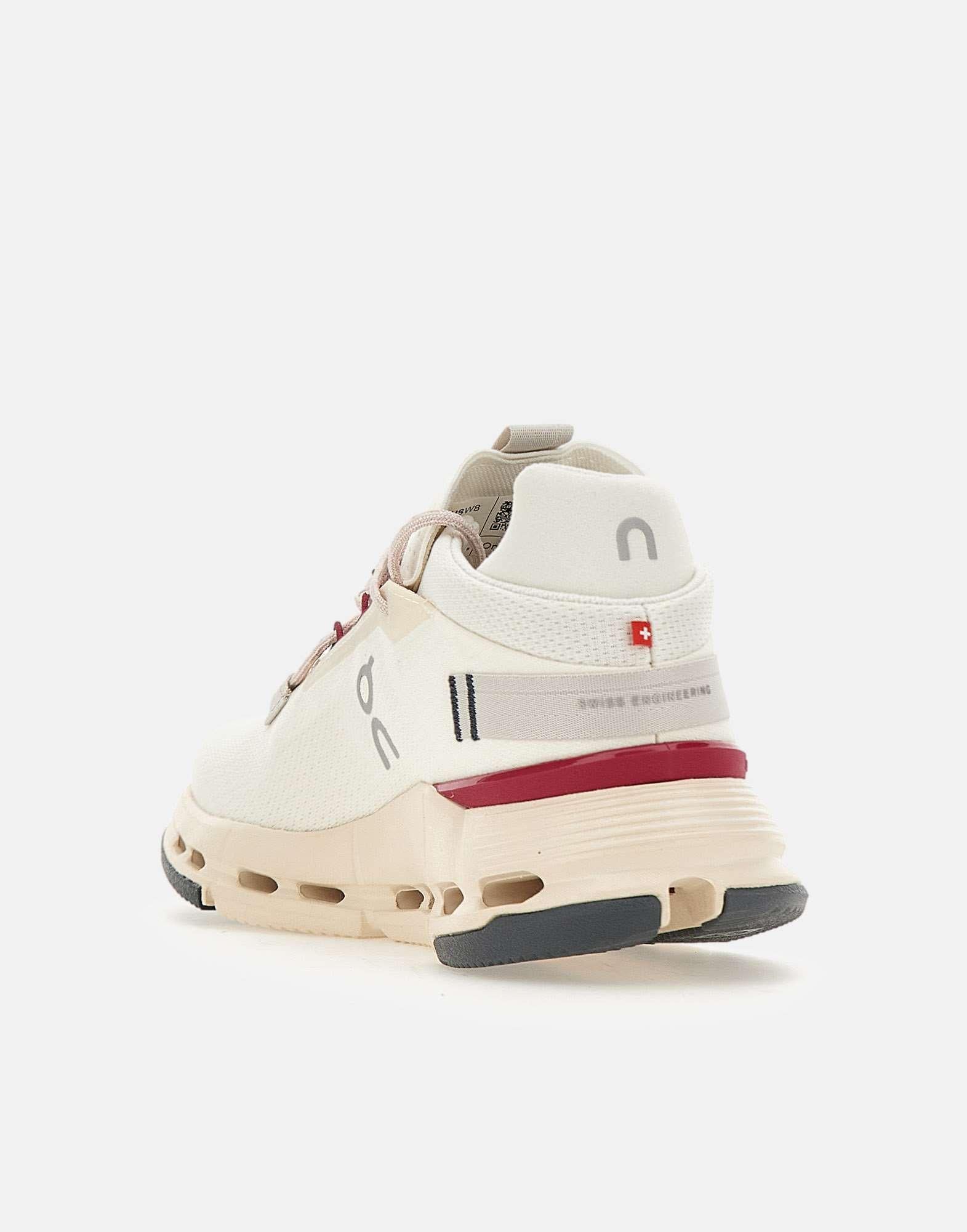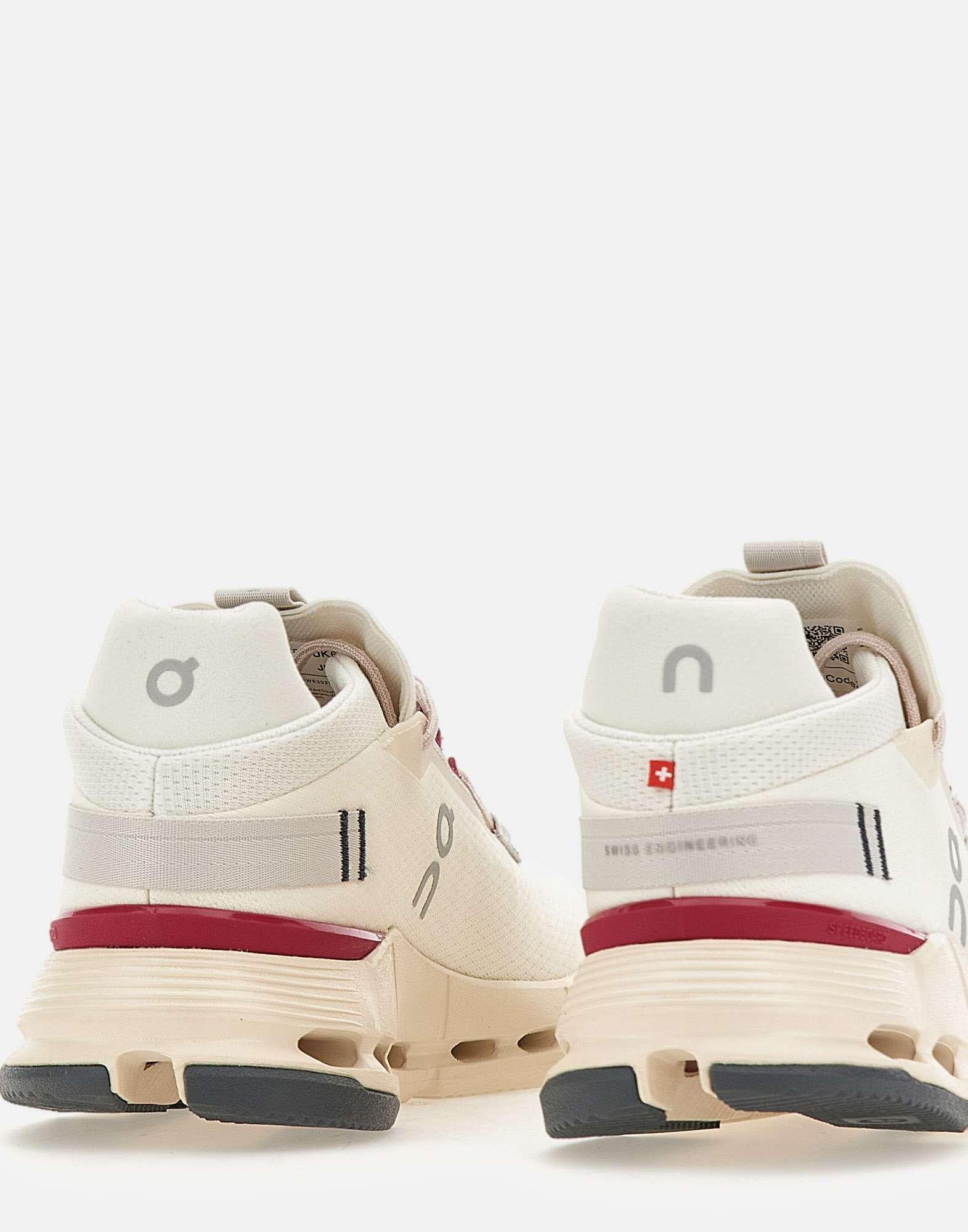 On "Cloud Nova2" women's sneakers, white with cyclamen details, recycled polyester and spandex upper, weight 314.6 grams, original and bold design, speedboard connected to the heel for added stability, 50% bio-attributed Zero-Gravity foam midsole, pink laces, 4cm lightweight outsole, logo on the tongue and side. Fits small: we recommend going at least a half size up. Size US 8 corresponds to EU/IT 39. Convert your size using the conversion table: ON WOMEN'S FOOTWEAR USA