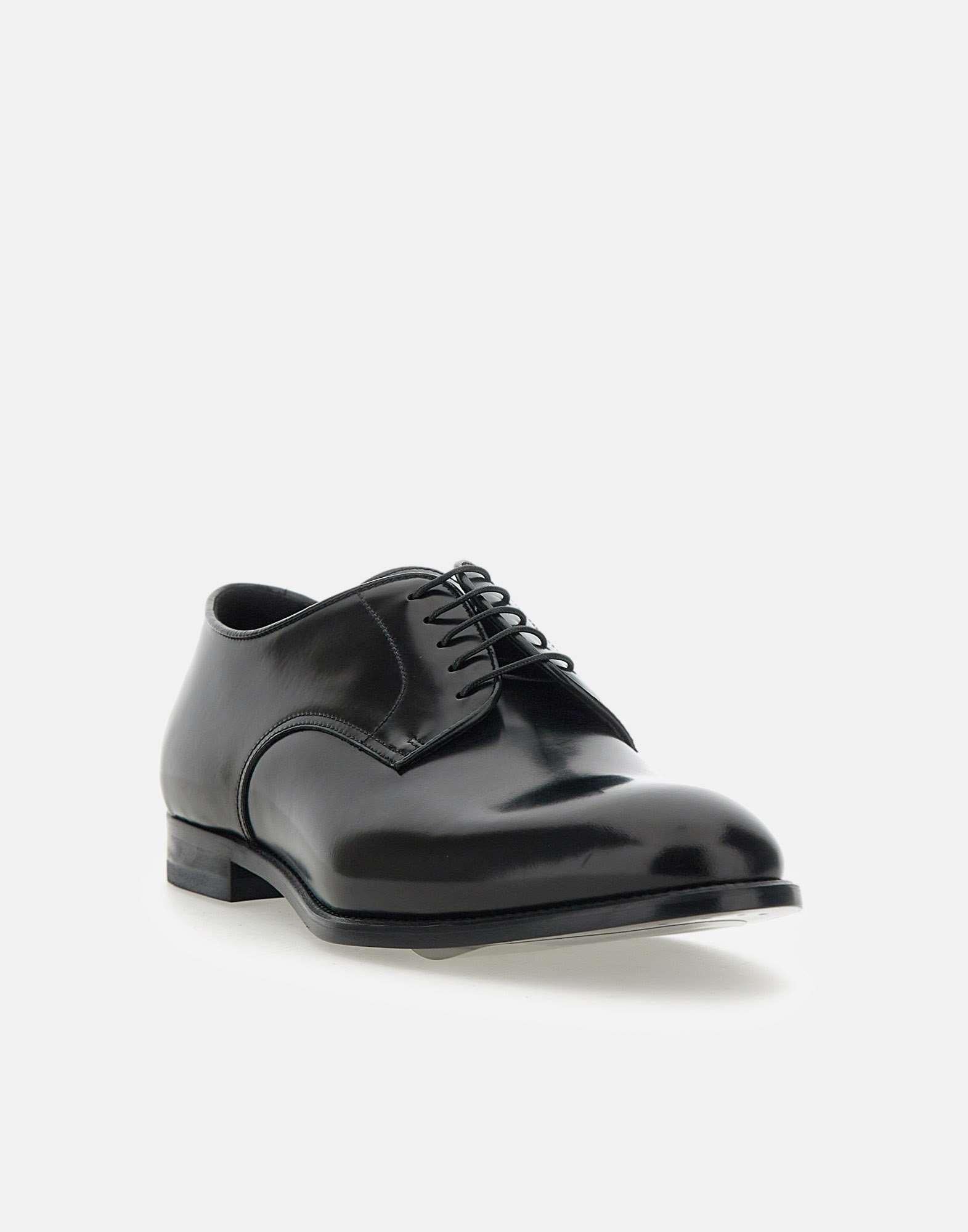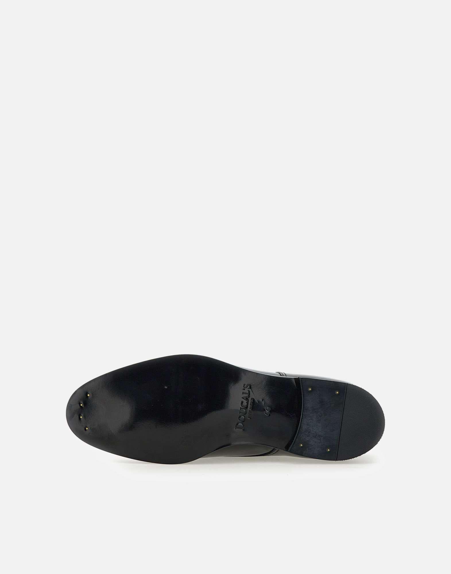 Stringate uomo Doucal's in pelle spazzolata, colore nero, cinque fori, modello Derby, tomaia liscia e forme arrotondate, chiusura con lacci, suola in cuoio, lavorazione Ago, fondo incollato, tacco 2cm, calzata regolare. Made in Italy.