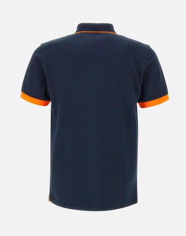 Sun68 "Stripe Fluo" men's organic cotton polo, midnight blue and contrasting fluorescent orange profiles, short sleeves, crew neck, embroidered logo on chest, mini slits at hem, regular fit.