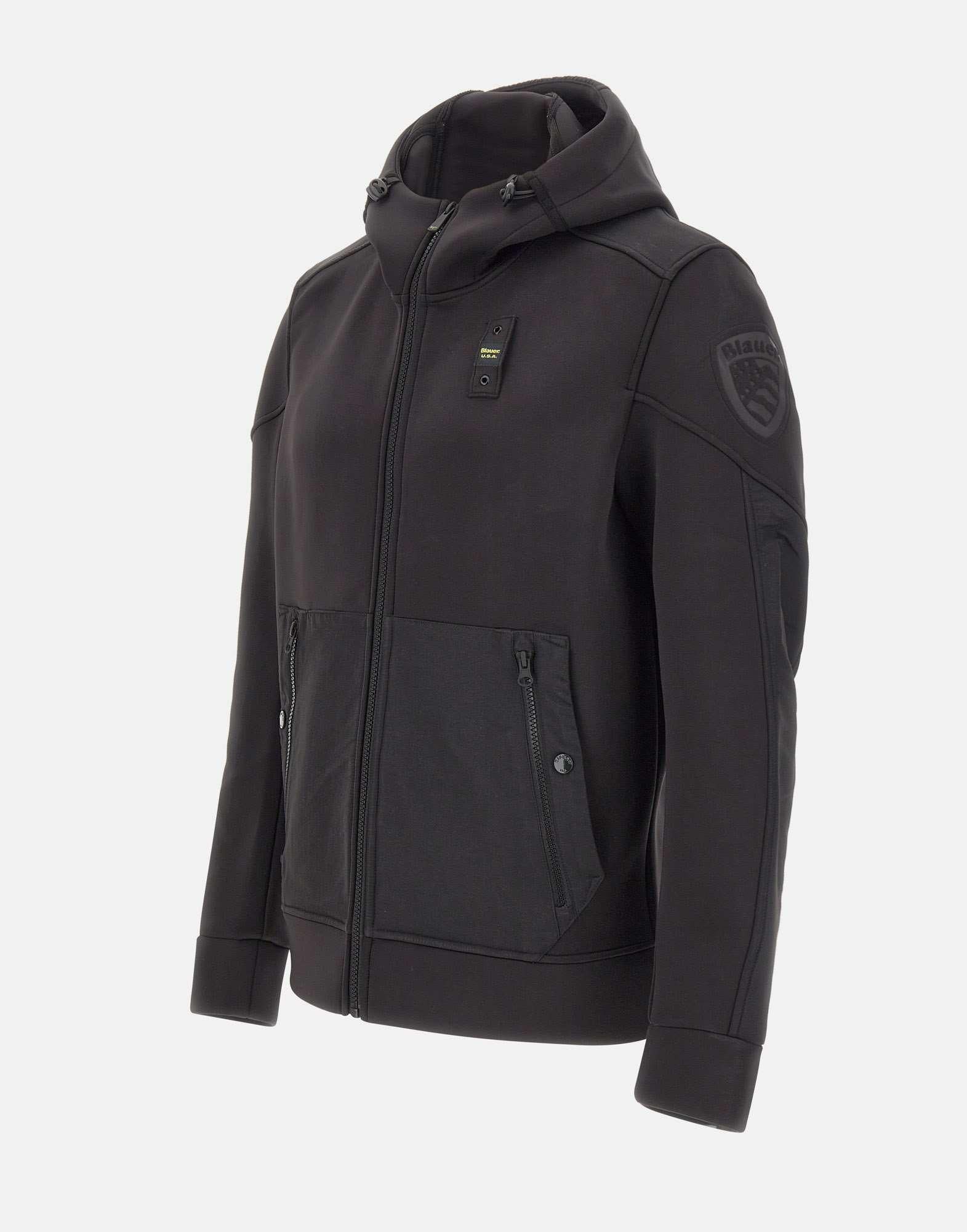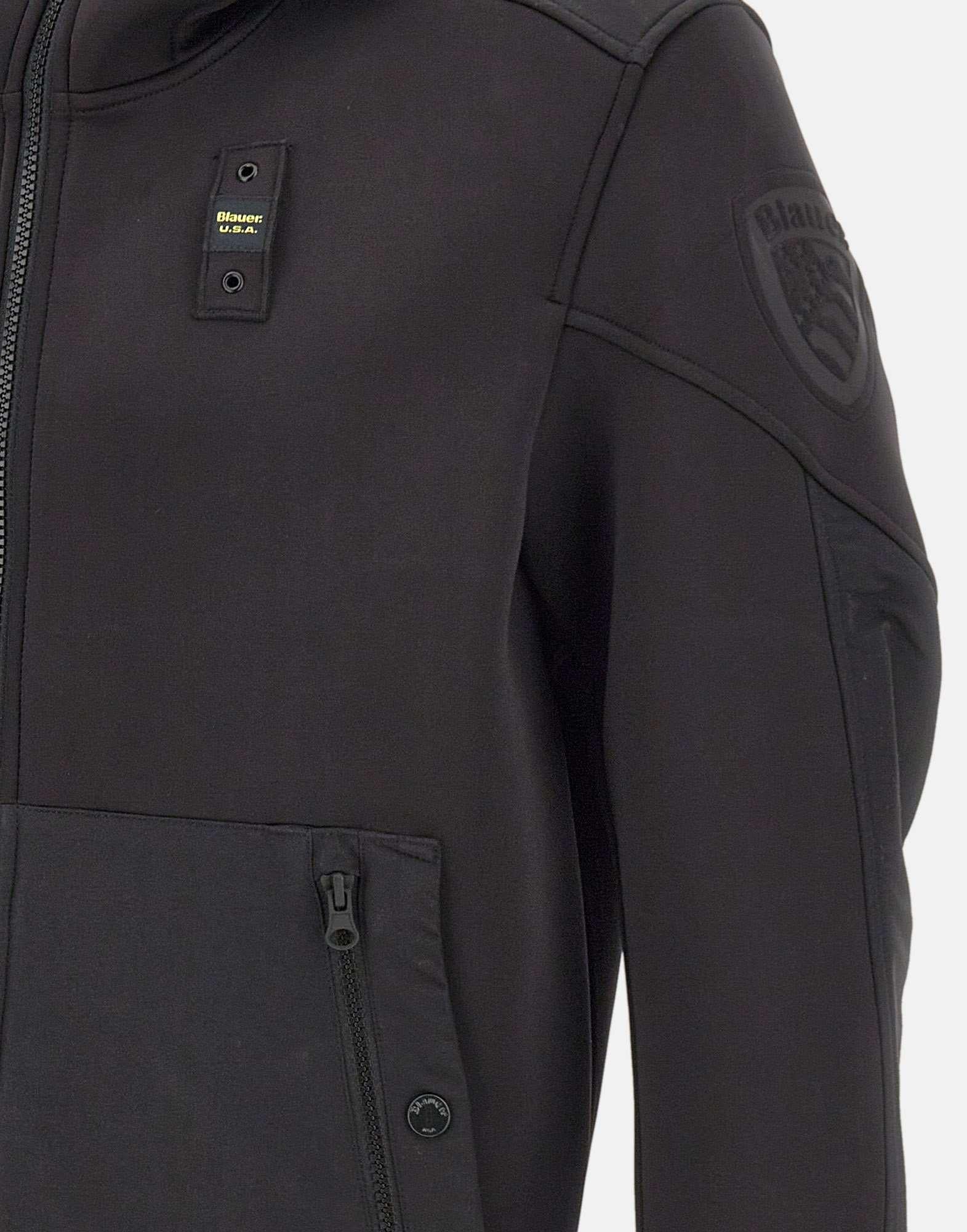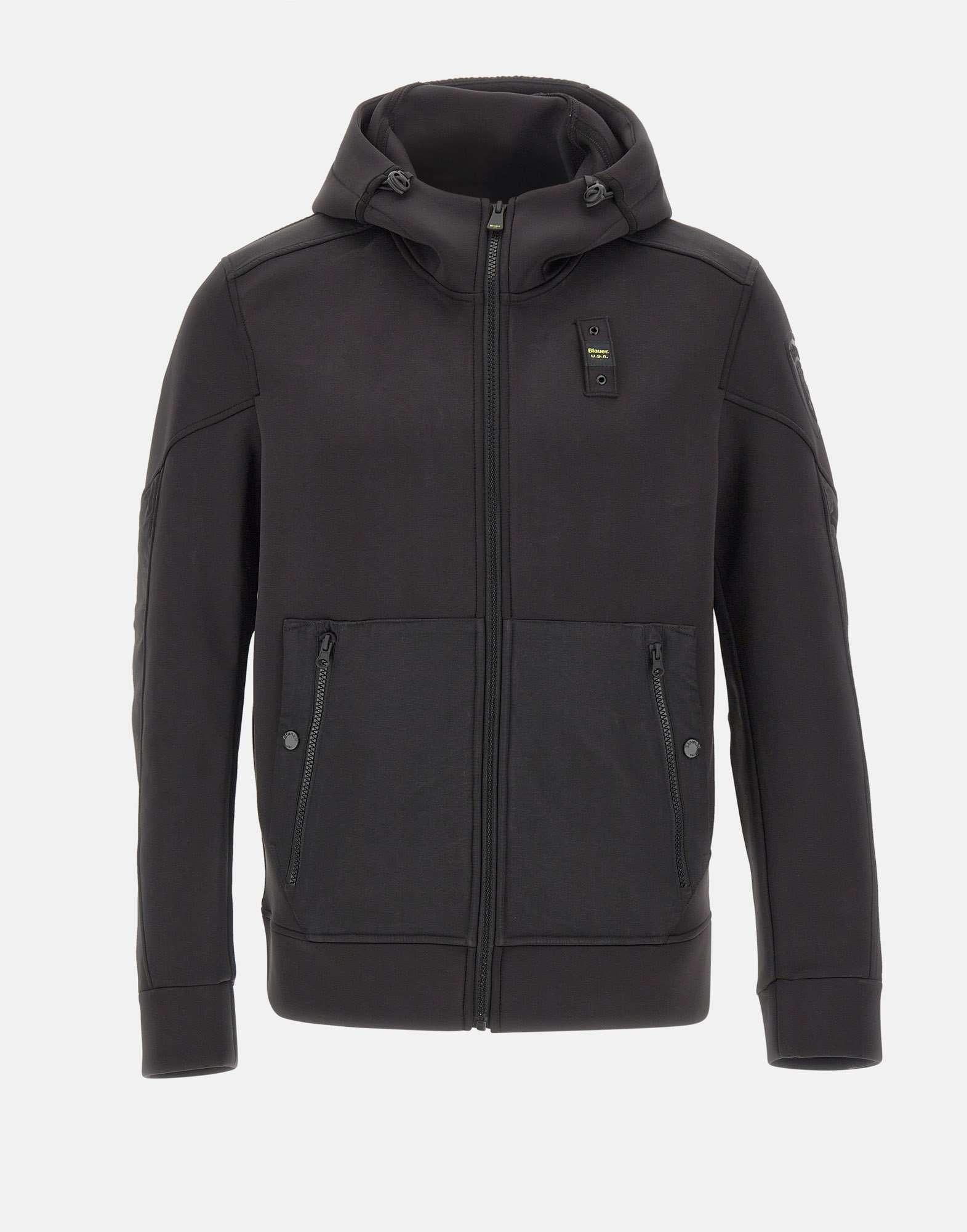 Men's Blauer "Surface" jacket in black scuba fabric with contrasting inserts, combining sporty style and modern design. Features a front zip closure, adjustable drawstring hood, and four side pockets with zip and button closures. Finished with the signature Blauer chest loop and embossed shield on the left sleeve. The regular fit provides comfort and versatility for everyday wear.