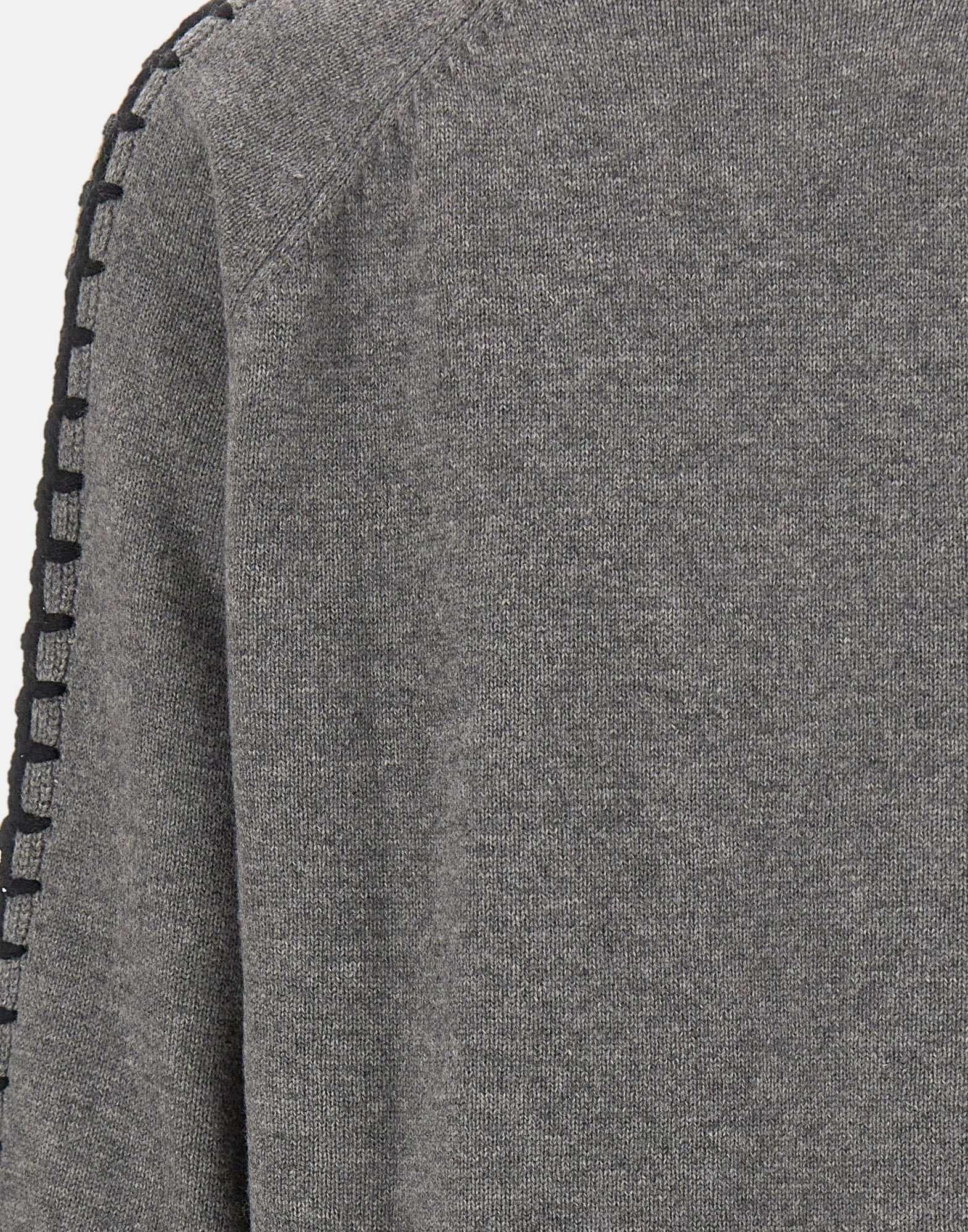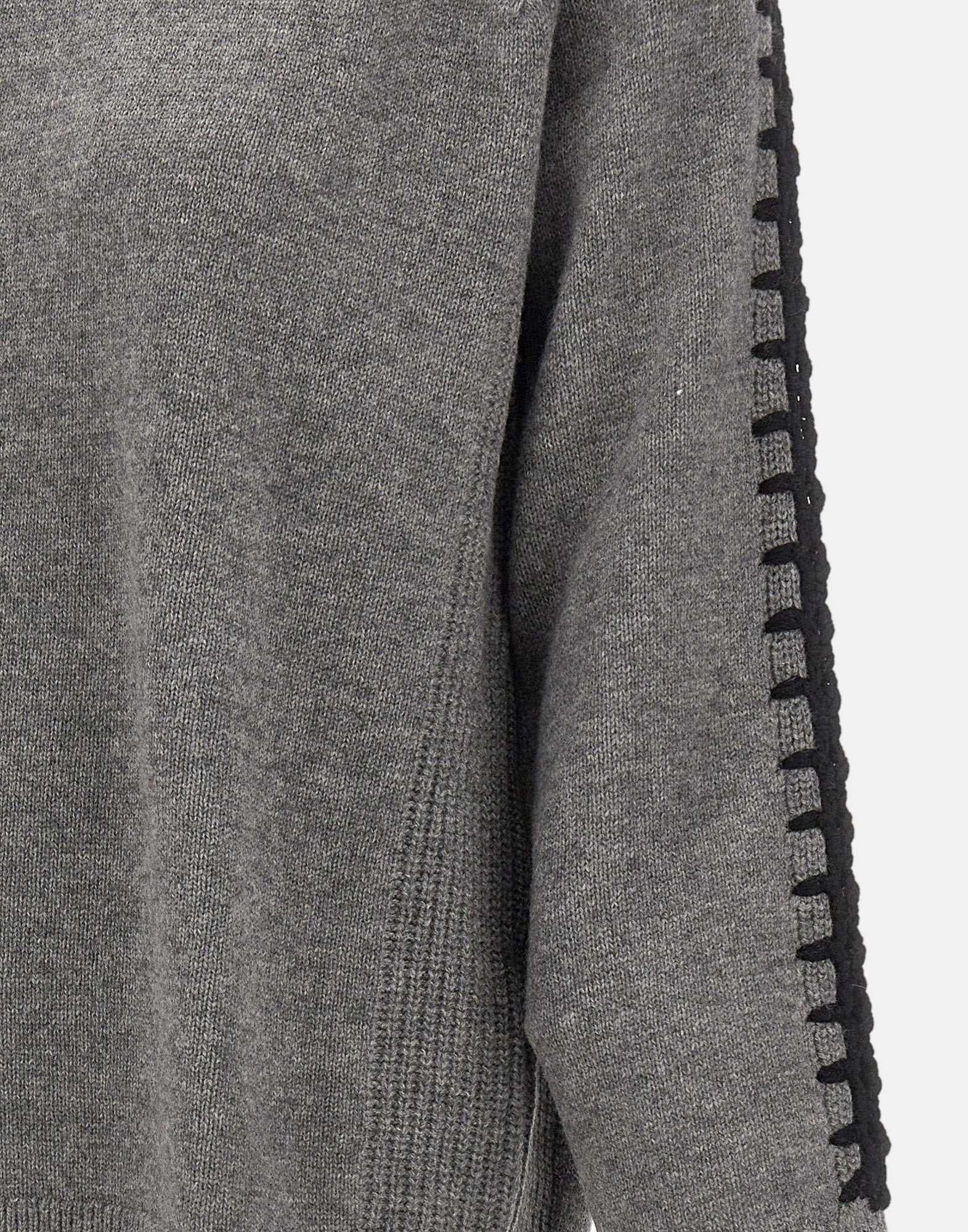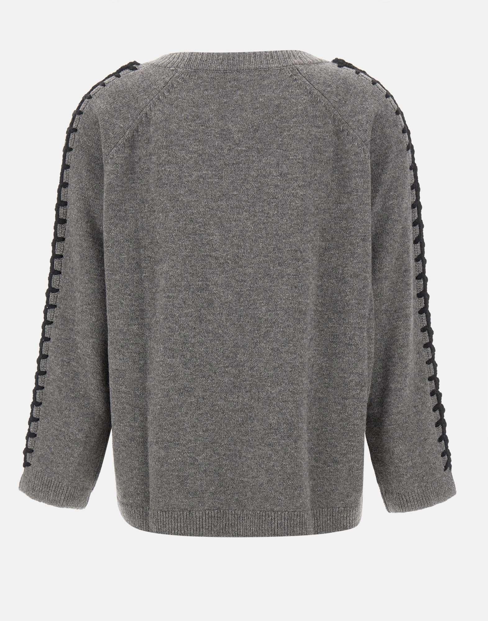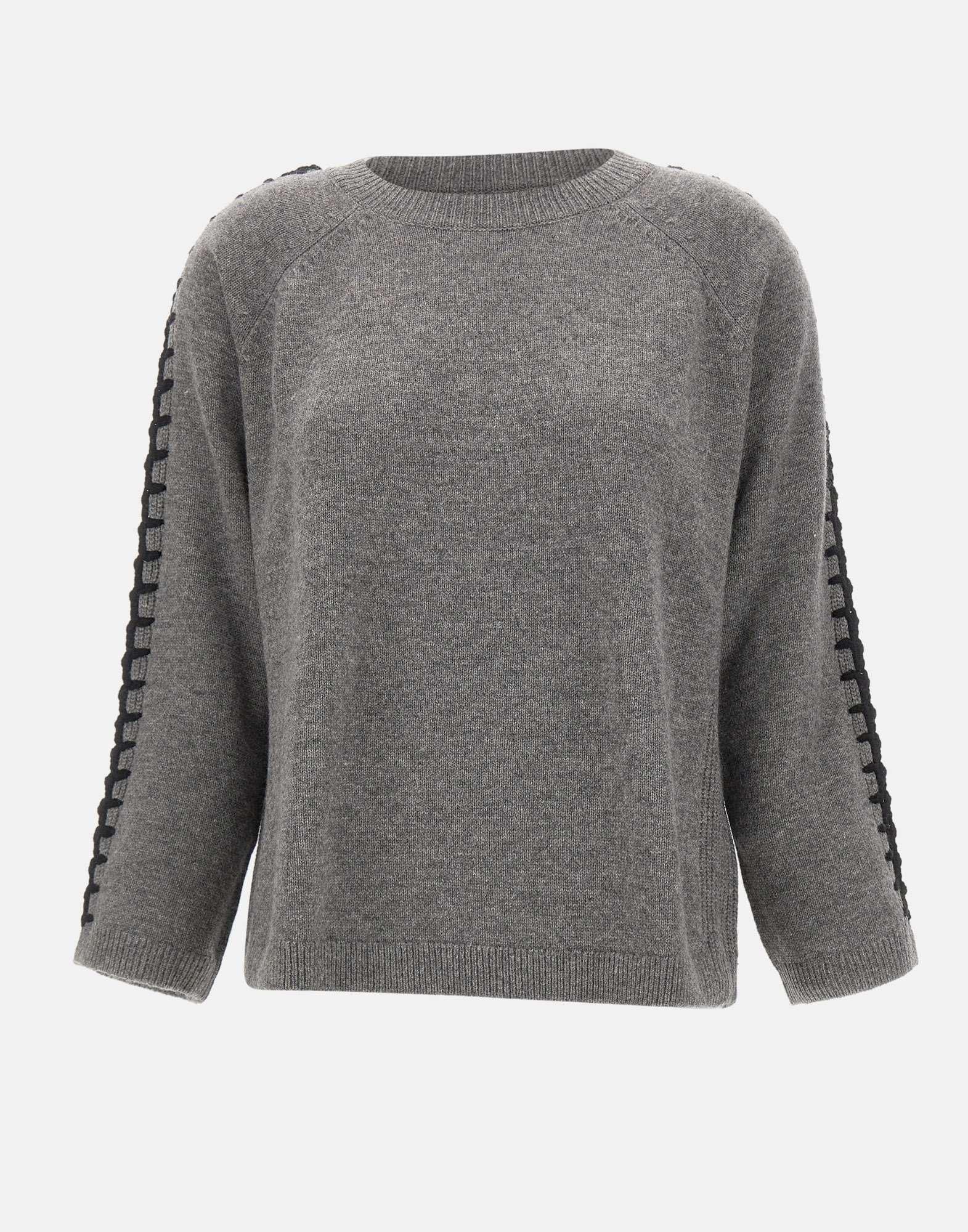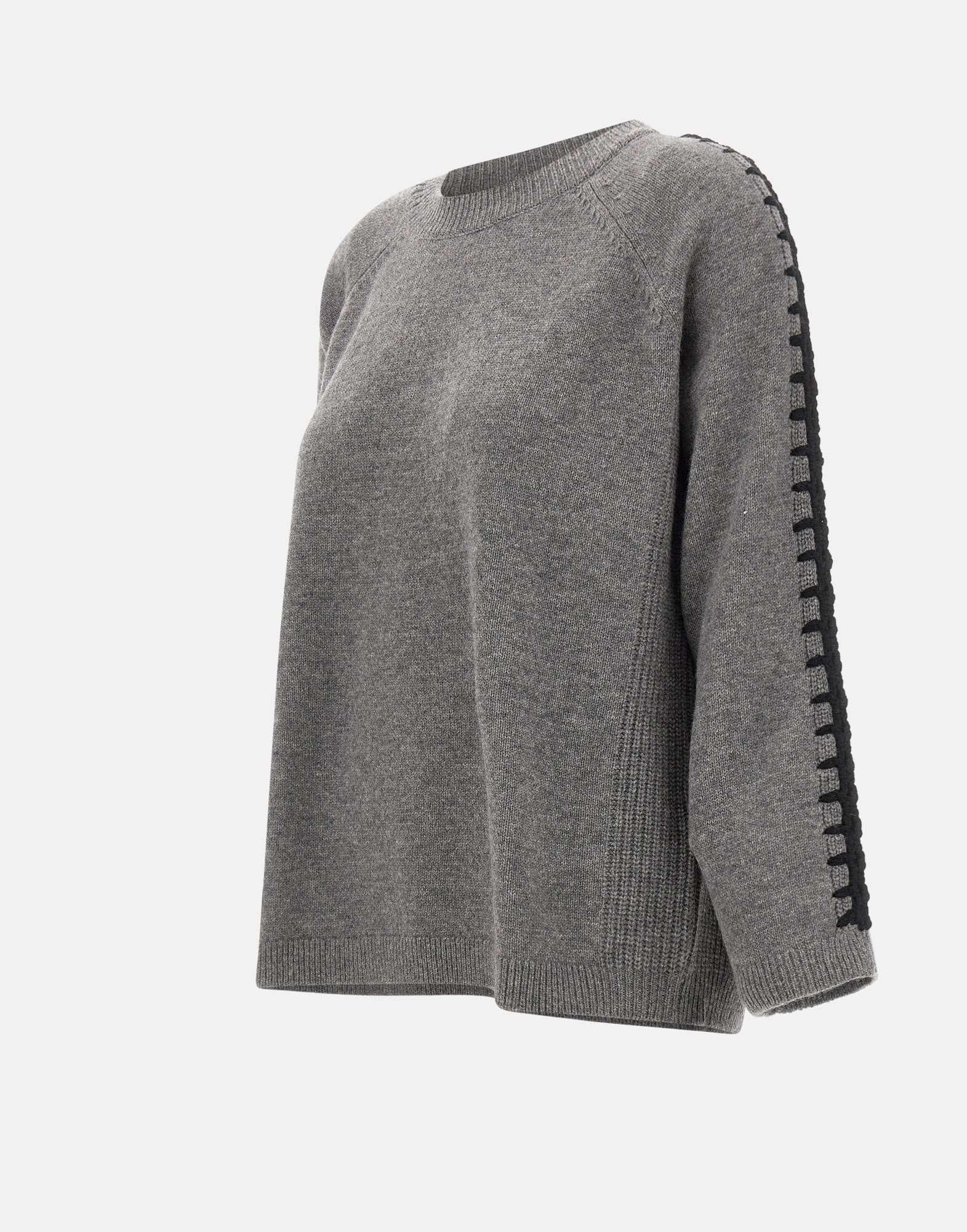 Elena Mirò grey pure wool sweater, hand-embroidered with contrasting decorative details for a refined, artisanal touch. Features long sleeves, boat neckline and ribbed trims for a comfortable fit. Regular fit, perfect for chic winter styling.