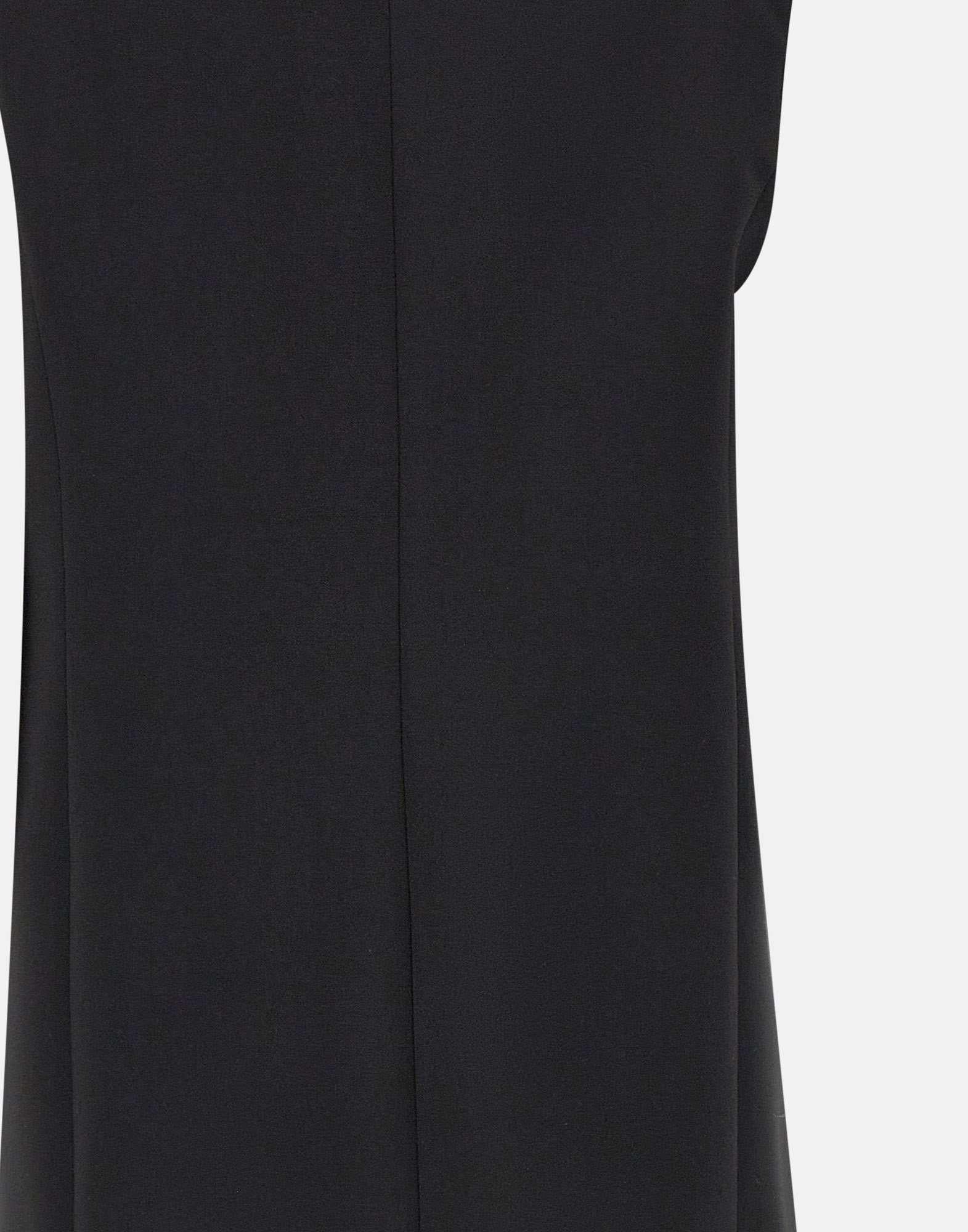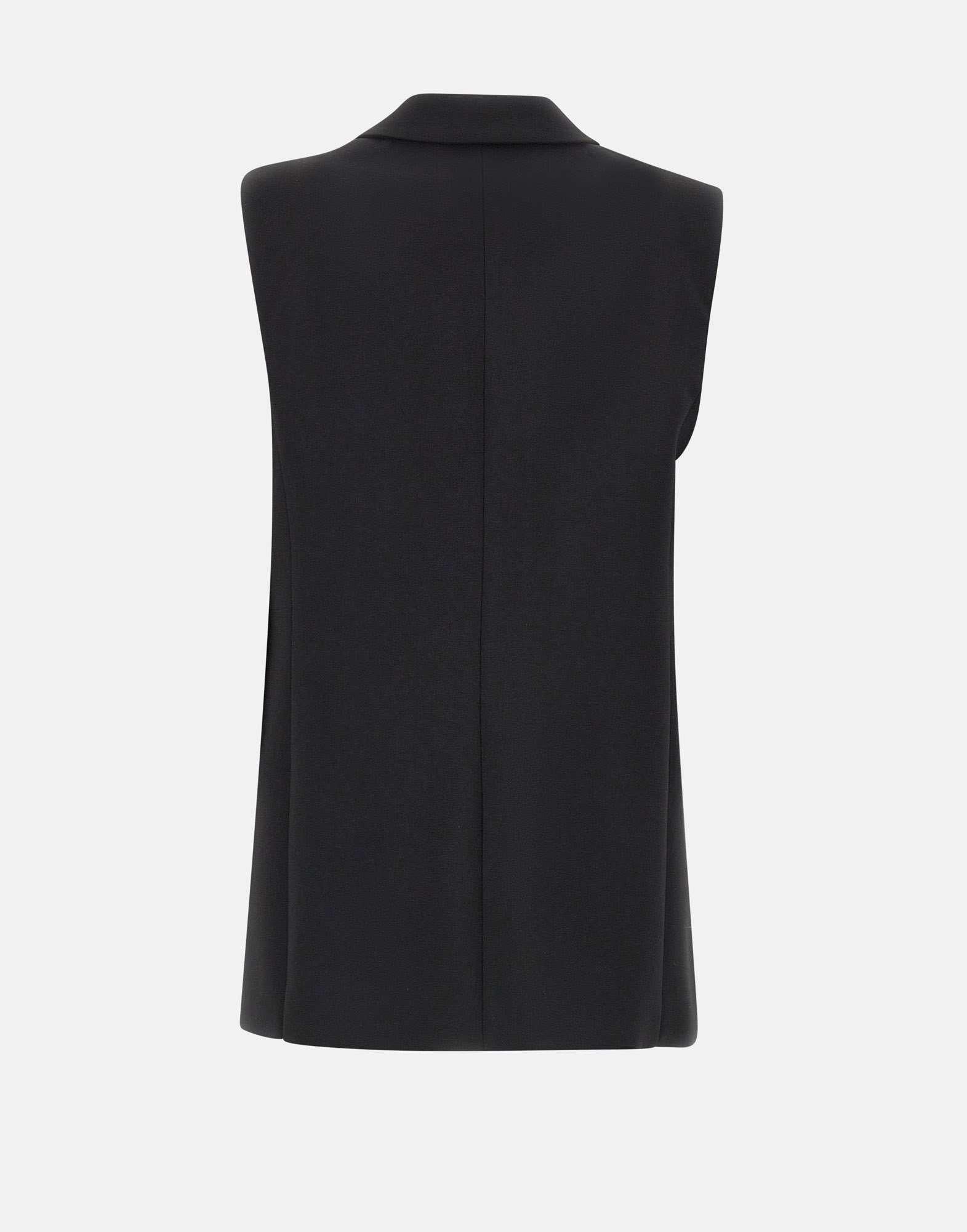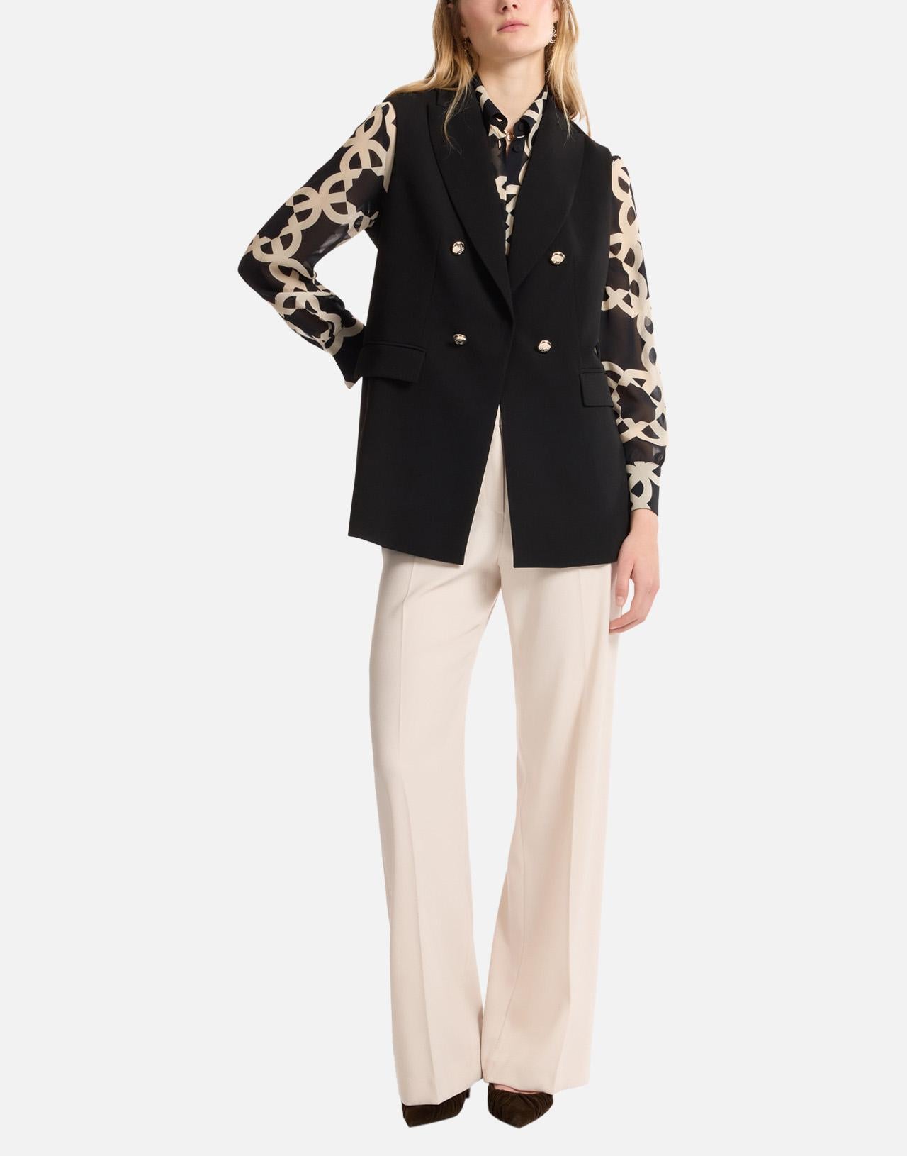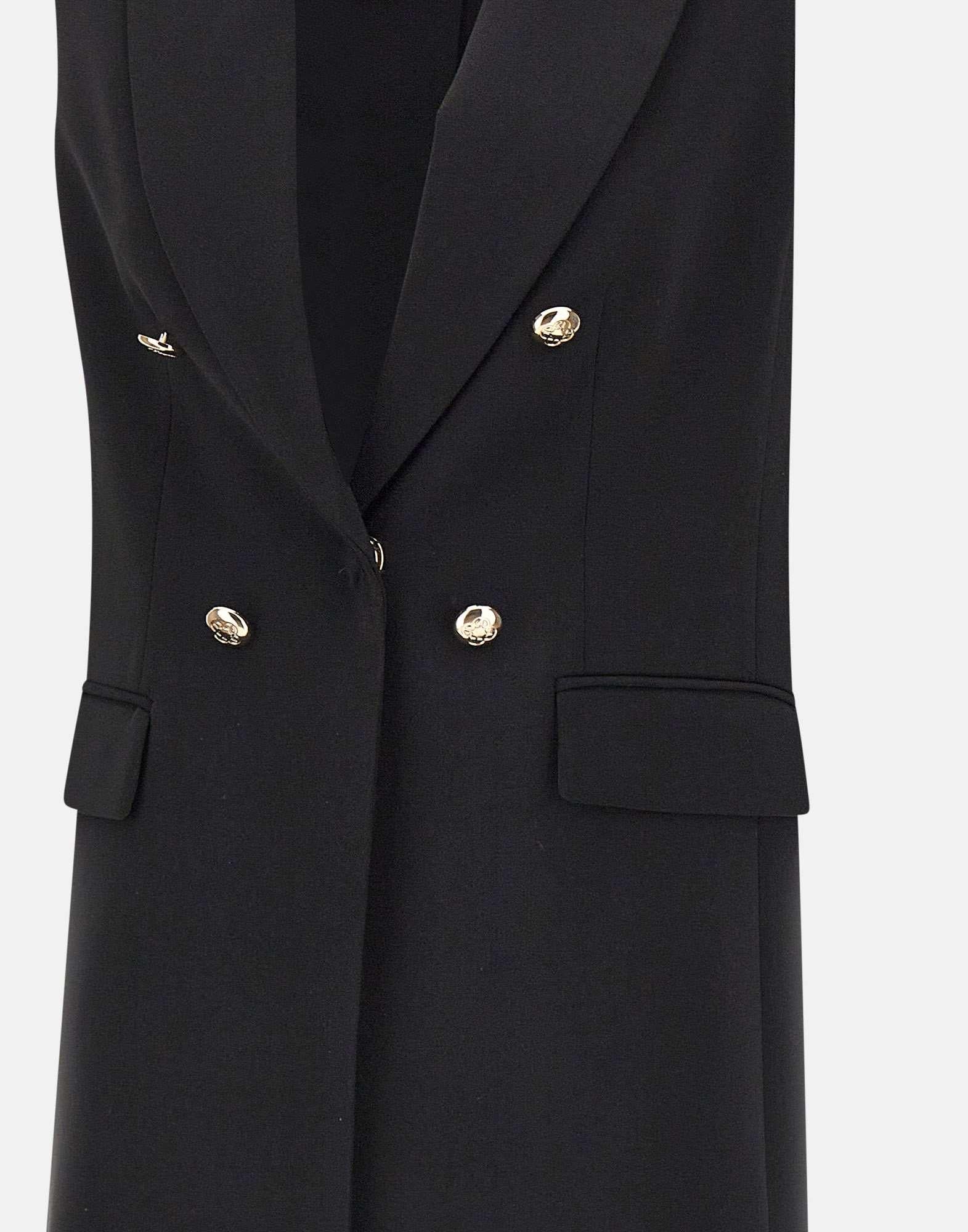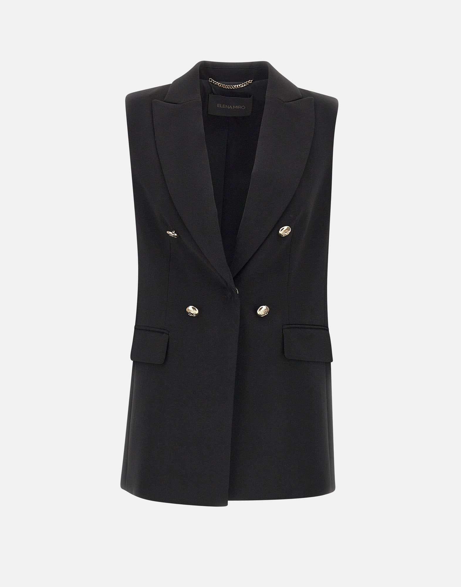 Elena Mirò maxi vest in black stretch crepe, with a tailored fit and long silhouette. Featuring peak lapels, a double-breasted closure with gold jeweled buttons, and front patch pockets with flaps. Fully lined, regular fit, perfect for layering over shirts or turtlenecks for an elegant and contemporary look.