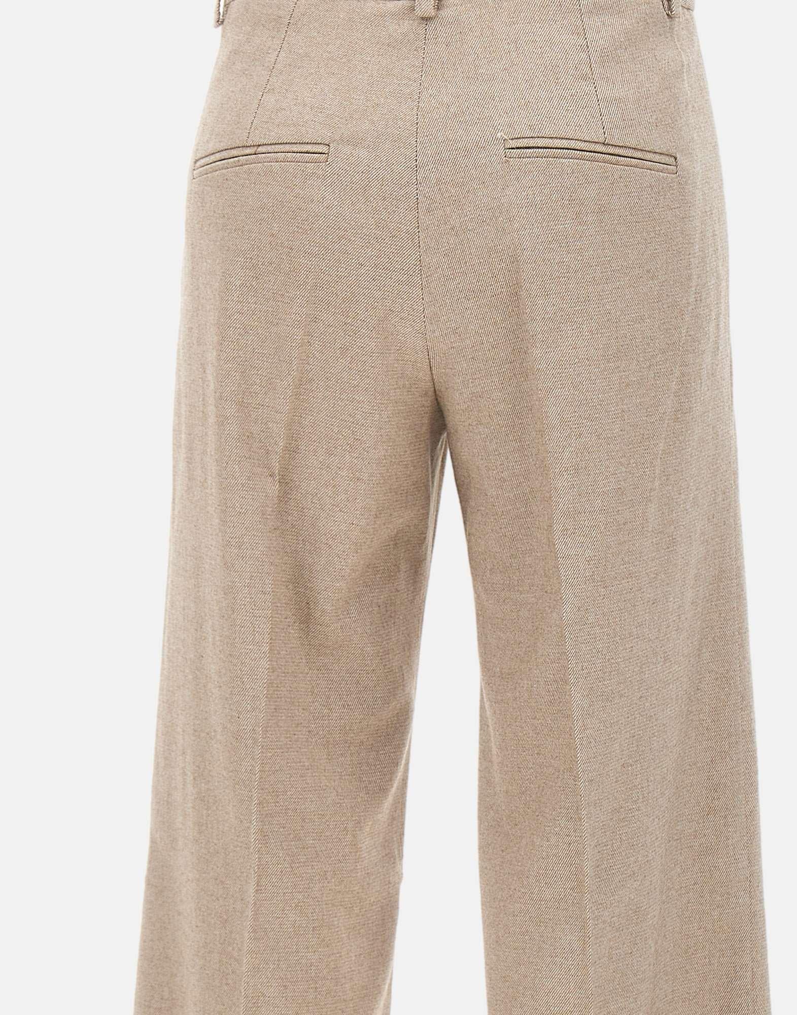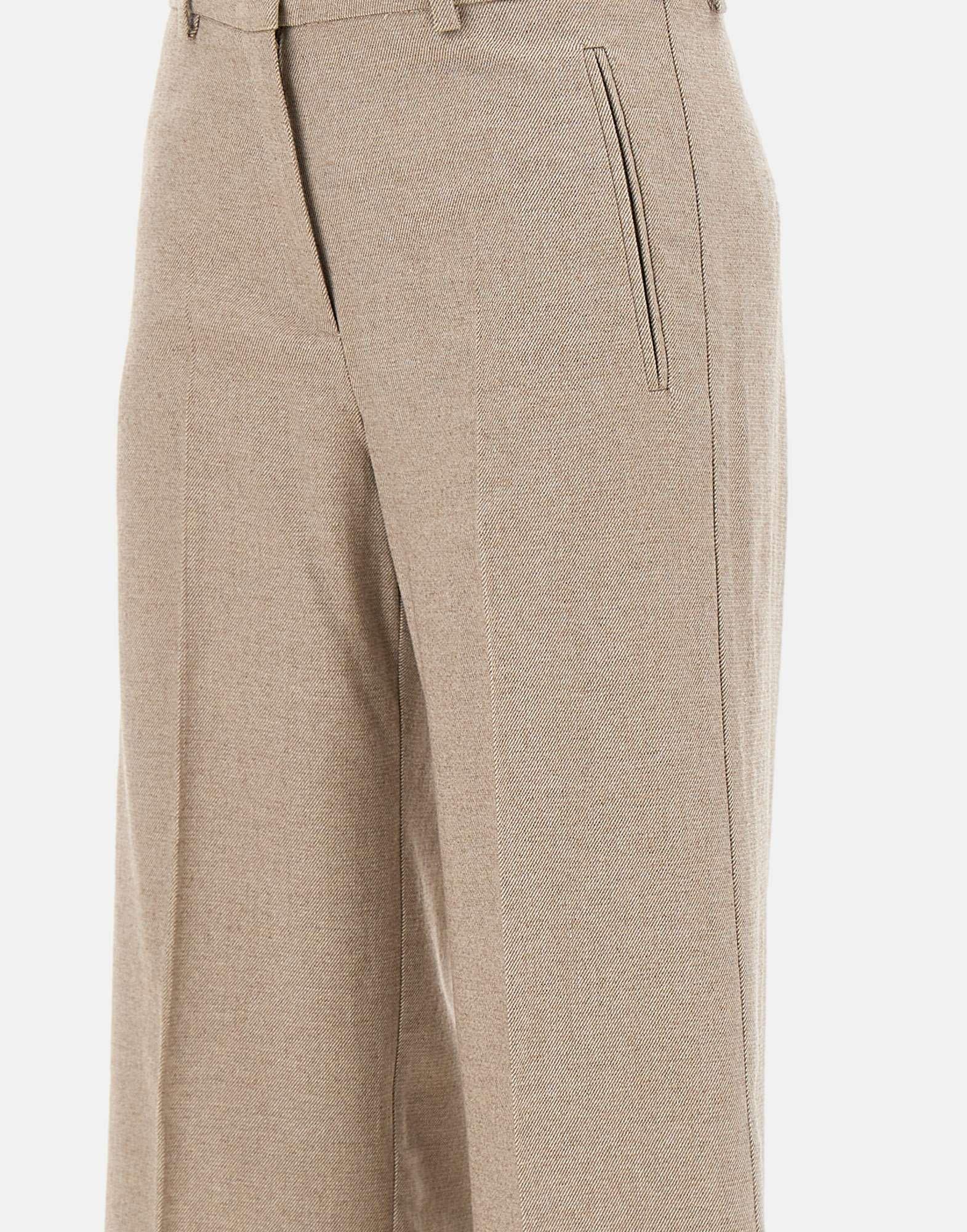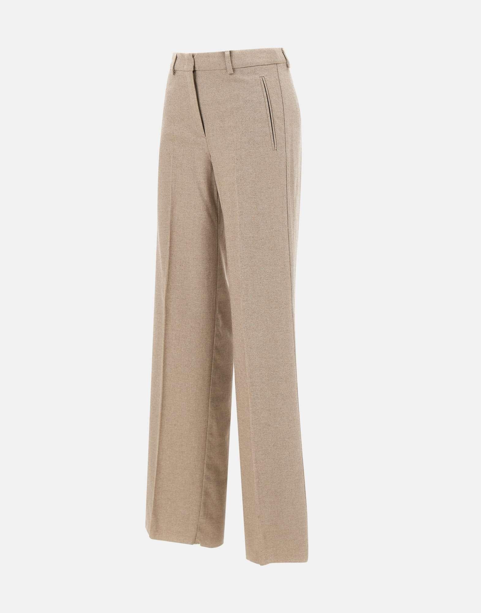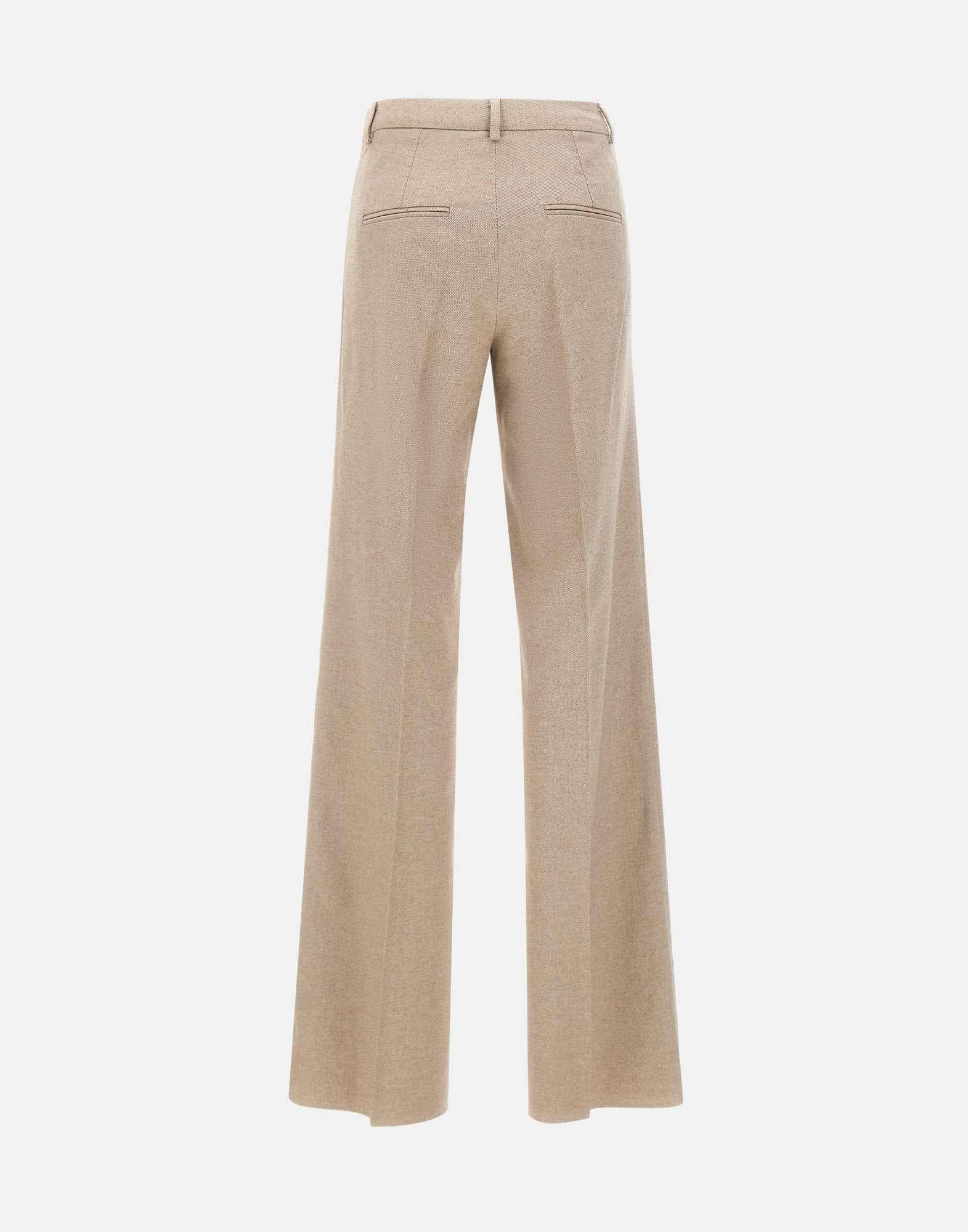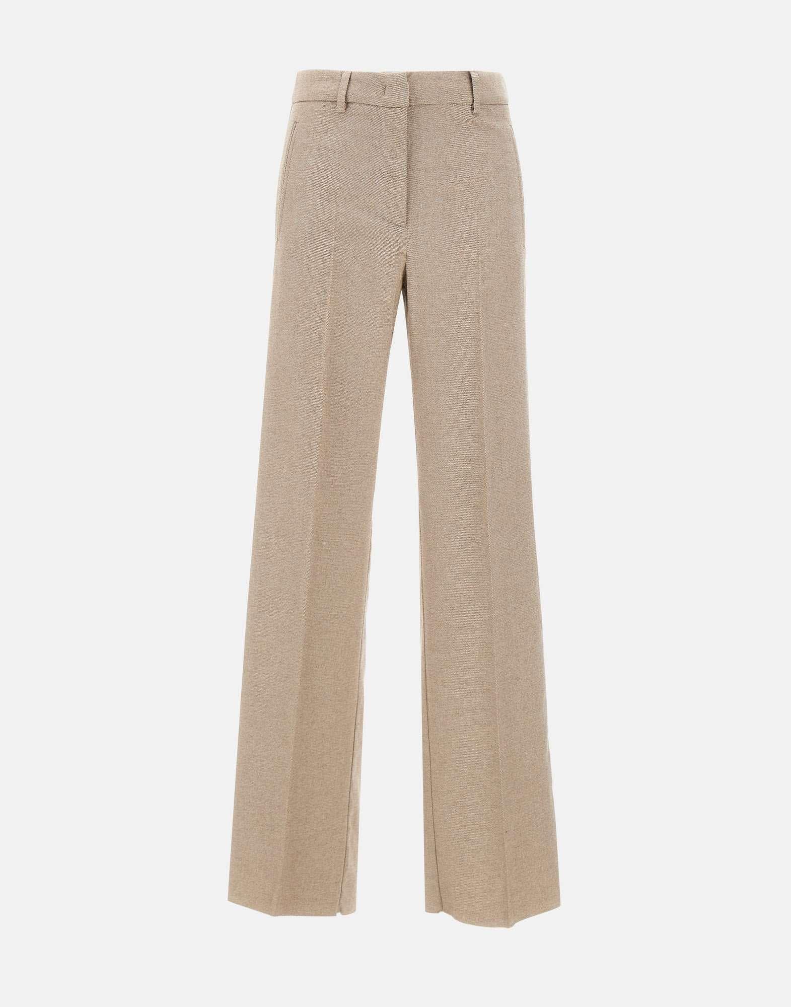 Marella "Pelago" trousers in a cotton, wool, and viscose blend, available in greige. They feature a zip, hook, and button closure, belt loops, and a pressed crease that slims the silhouette. The wide leg with an 11-inch raw hem adds a modern, casual touch. Regular fit.