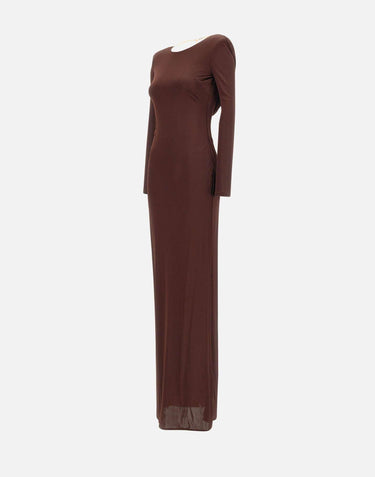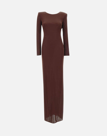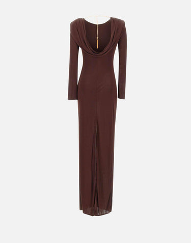 Elisabetta Franchi "Red Carpet" evening dress, crafted from shiny viscose jersey in a refined coffee shade. The fitted silhouette elegantly accentuates the feminine figure, while the boat neckline with structured shoulders and padded straps adds character and presence. The back is embellished with sophisticated draping that leaves the back exposed, accentuated by a jeweled detail: a gold chain with a snakeskin-effect tassel and engraved logo. The back slit adds a bold touch, while the invisible side zip and jersey lining ensure a flawless fit. Entirely made in Italy. Slim fit. Perfect for gala evenings and exclusive events where glamour is paramount.