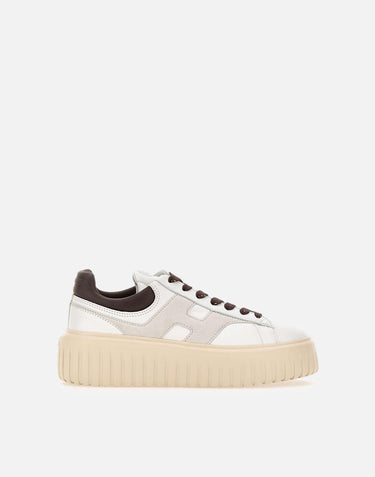 Hogan women's "H Stripes" sneakers, white with chocolate and ice details, nappa leather upper, suede inserts, split H suede on side, logo on tongue, 8 mm memory foam insole, extra-light EVA outsole with vertical stripes, total height 4.8 cm, regular fit, made in Italy. Fabric case included. Additional laces.