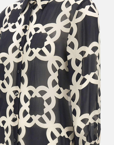 Elena Mirò shirt in soft viscose, featuring a refined geometric pattern in shades of beige and black. It features a classic collar, long sleeves with matching cuffs and buttons, and a front closure with tone-on-tone covered buttons. Regular fit, perfect for elegant and contemporary looks.