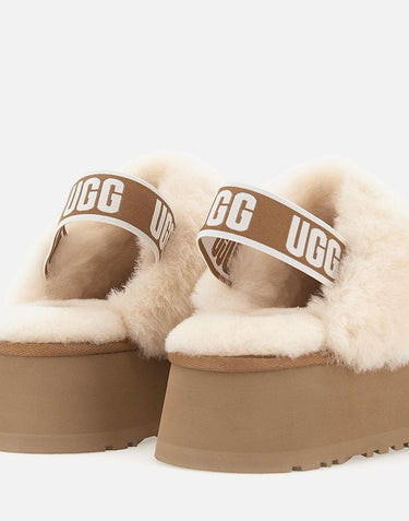 Ugg "Funkette" women's suede sandals, cognac color, evolution of iconic Coquette slipper, layered platform, retro style, slip on silhouette, soft sheepskin lining, back strap with UGG graphic logo, 5 cm wedge sole. US size chart.