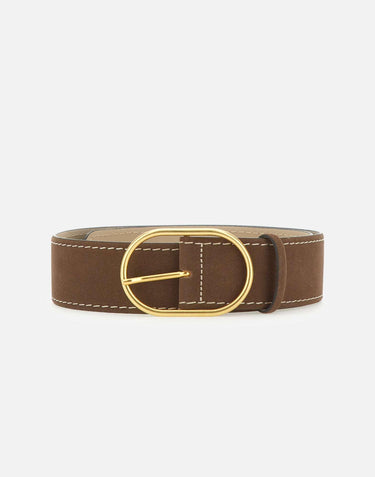 Gianni Chiarini suede belt, mocha color, maxi antique gold buckle, width 4.5 cm, visible stitching, one size, made in Italy