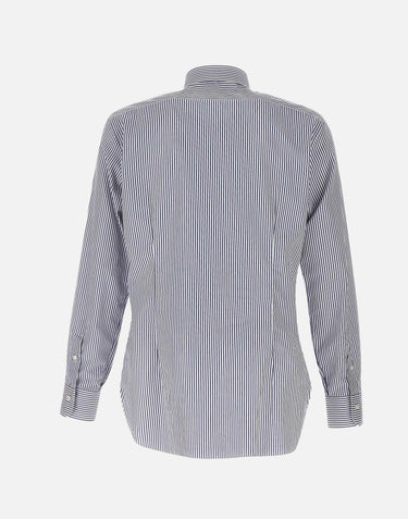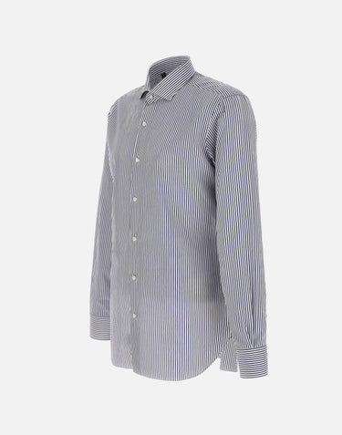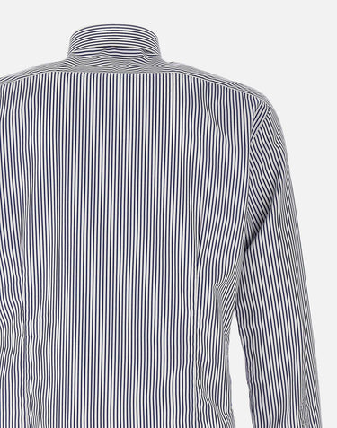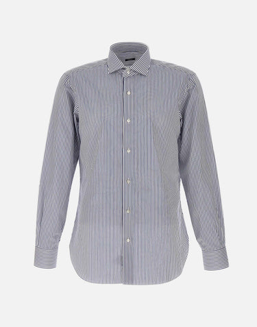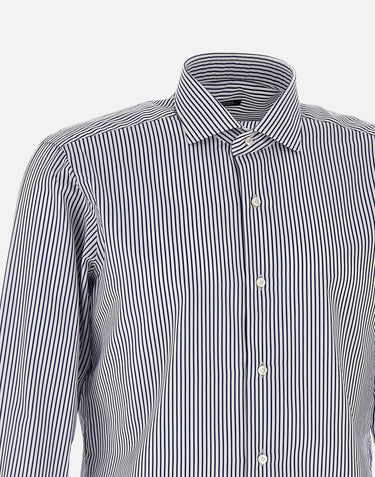 Barba men's cotton shirt, vertical striped pattern shades of white and blue, classic collar, mother-of-pearl effect button closure, cuffs with buttons, rounded hem, slim fit. Made in Italy.Hand sewn.