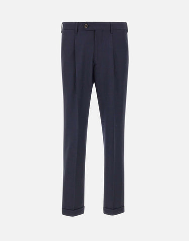 The navy blue Devore Incipit trousers are a sophisticated and timeless piece, designed for an elegant and contemporary men's wardrobe. Crafted from a premium wool blend and made in Italy, they offer excellent comfort and quality. The silhouette is defined by a front button and zip closure, belt loops, two side slit pockets, and two back welt pockets. Perfect for formal and business settings, they pair easily with tailored blazers or clean-cut shirts.