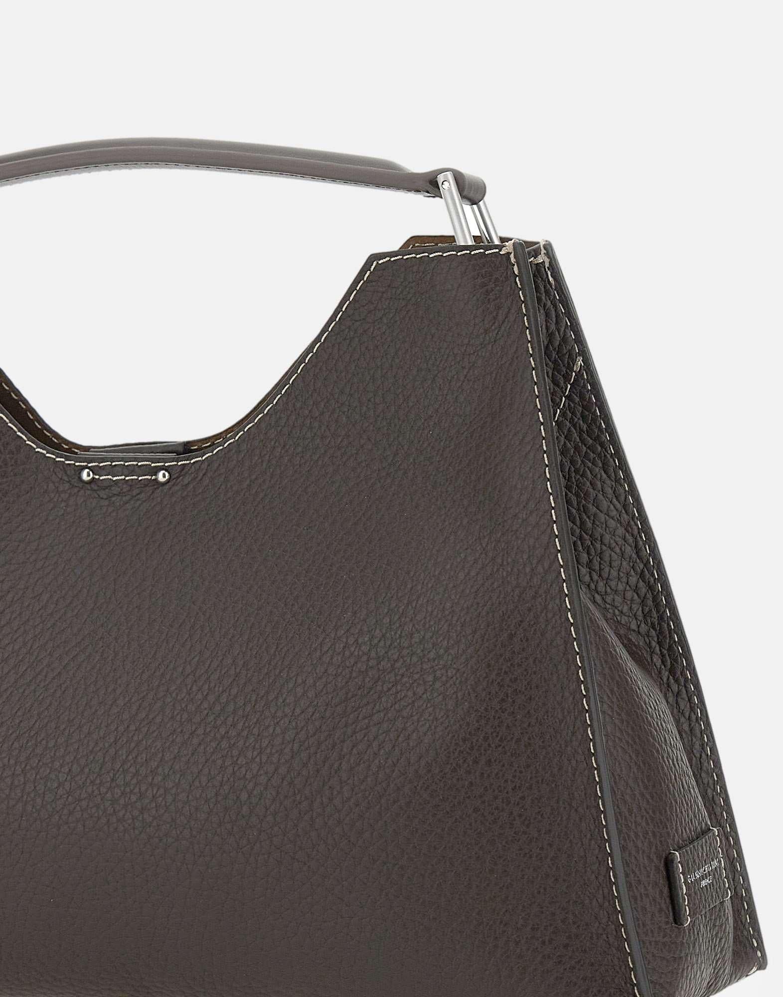 Gianni Chiarini "Aurora" maxi grain leather handbag, espresso coffee, stiff top handle, matt silver plated, snap button closure, zipped pochette included, removable fabric shoulder strap approx. 90cm, single compartment, dustbag included, measurements: 30cm high, 42cm long, 10cm deep, dustbag included, made in Italy